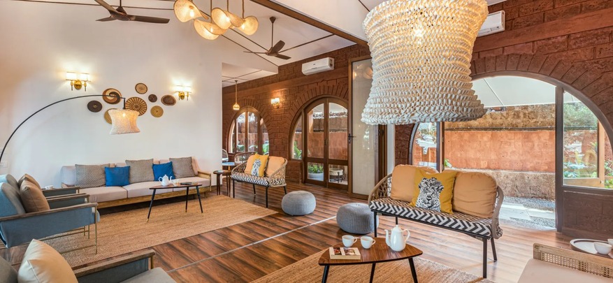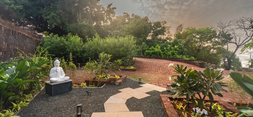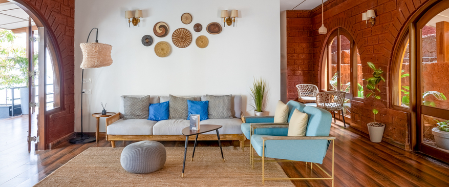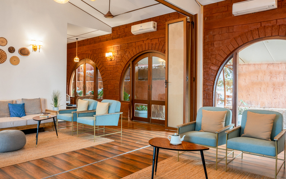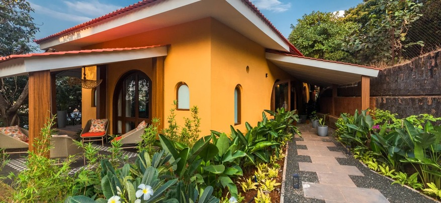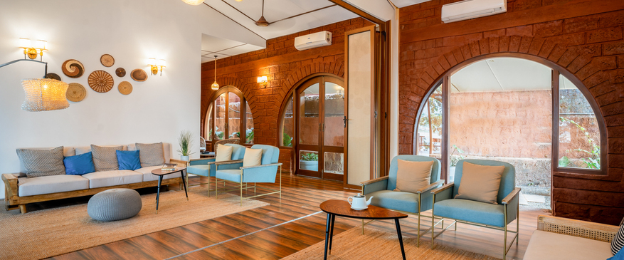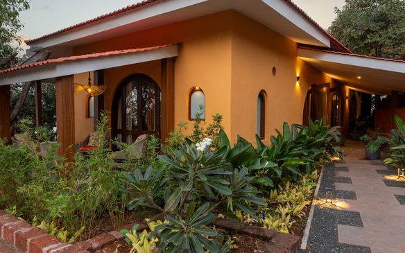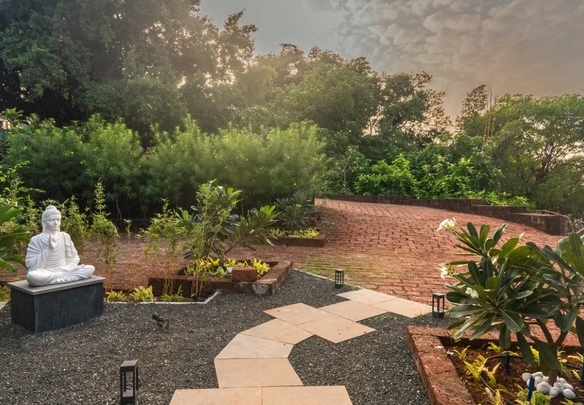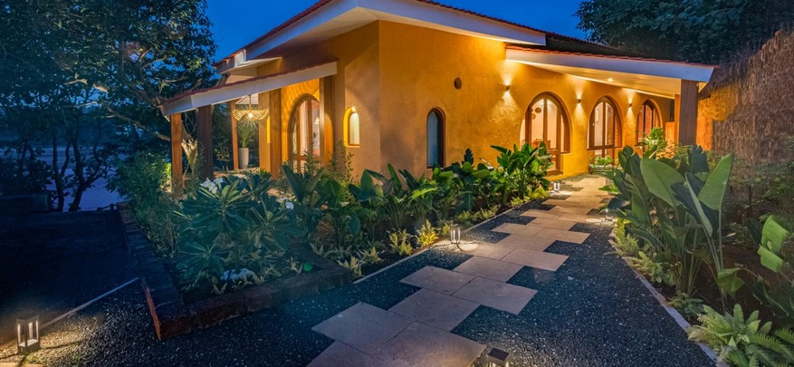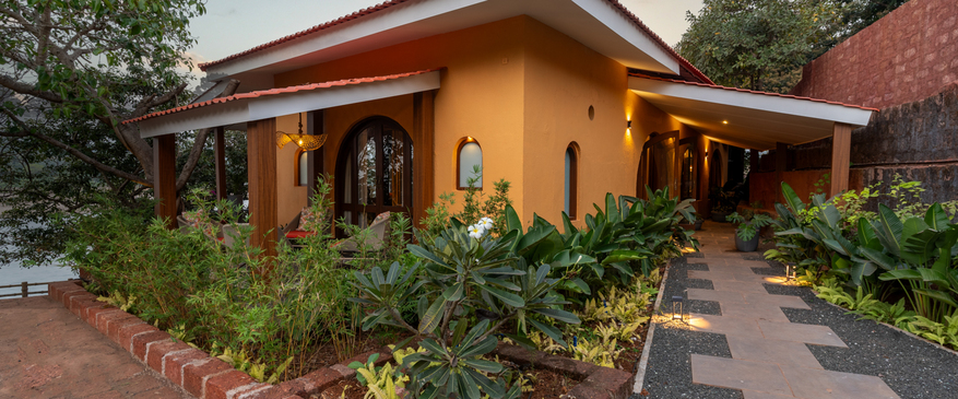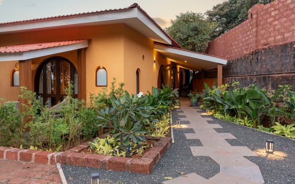 Natural Laterite stone has been used for cladding, adding a rustic charm and blending seamlessly with the surroundings.