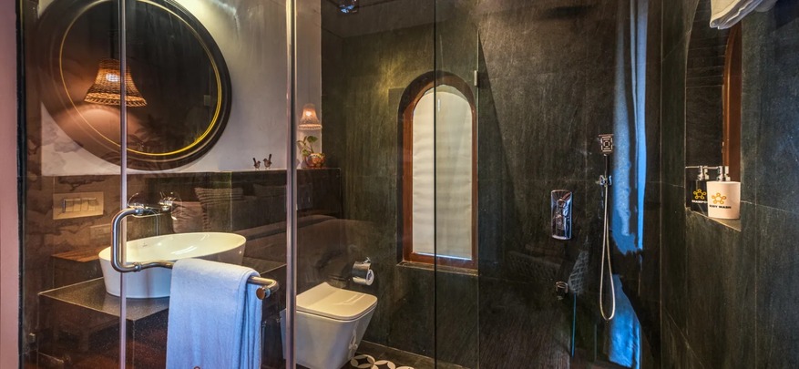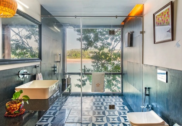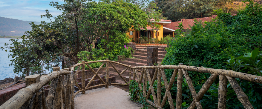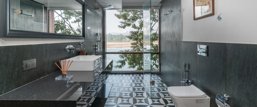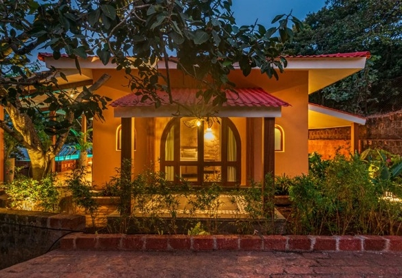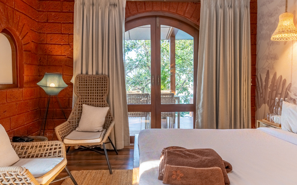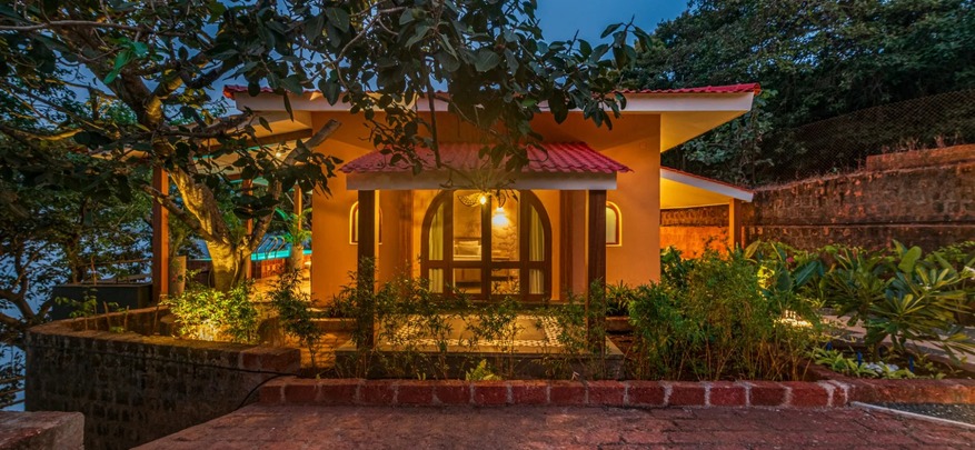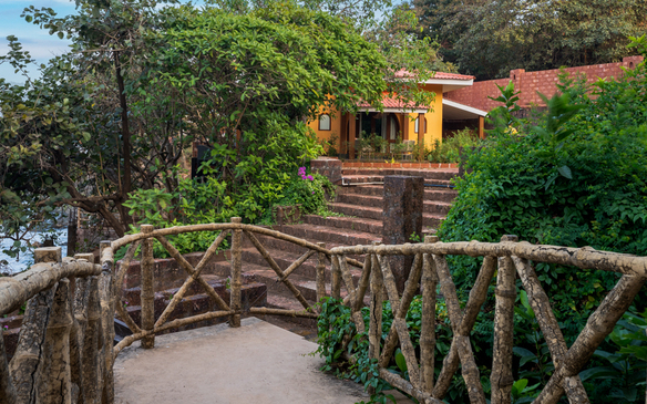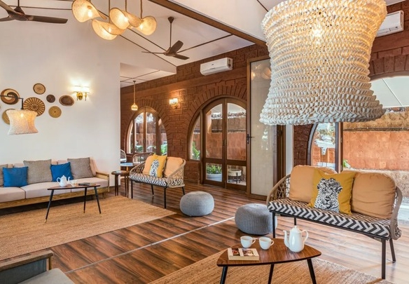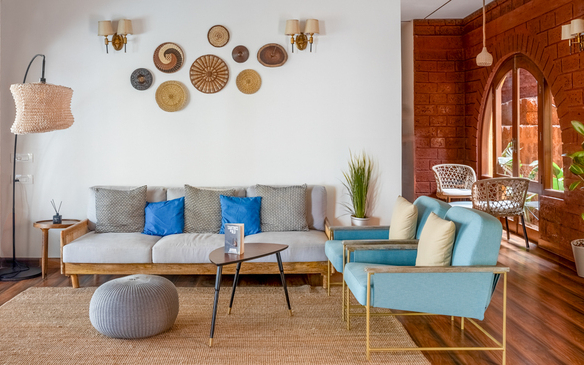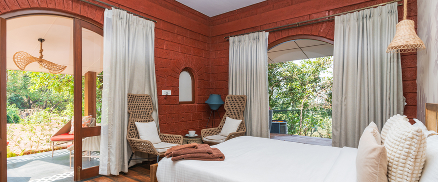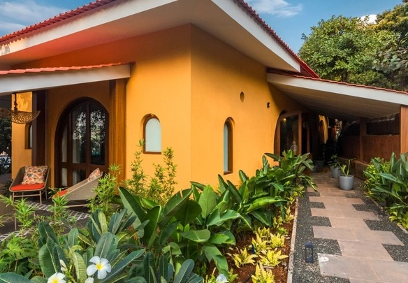 Natural Laterite stone has been used for cladding, adding a rustic charm and blending seamlessly with the surroundings.