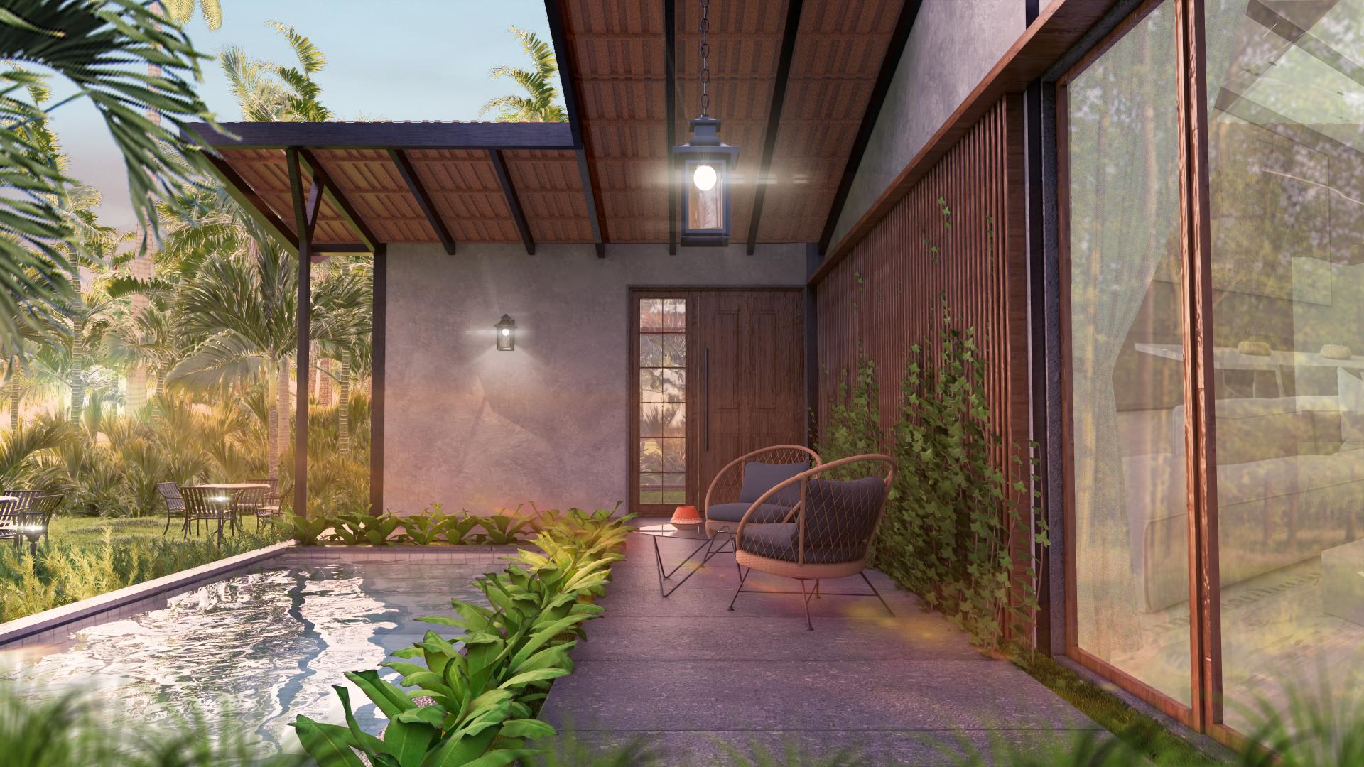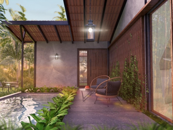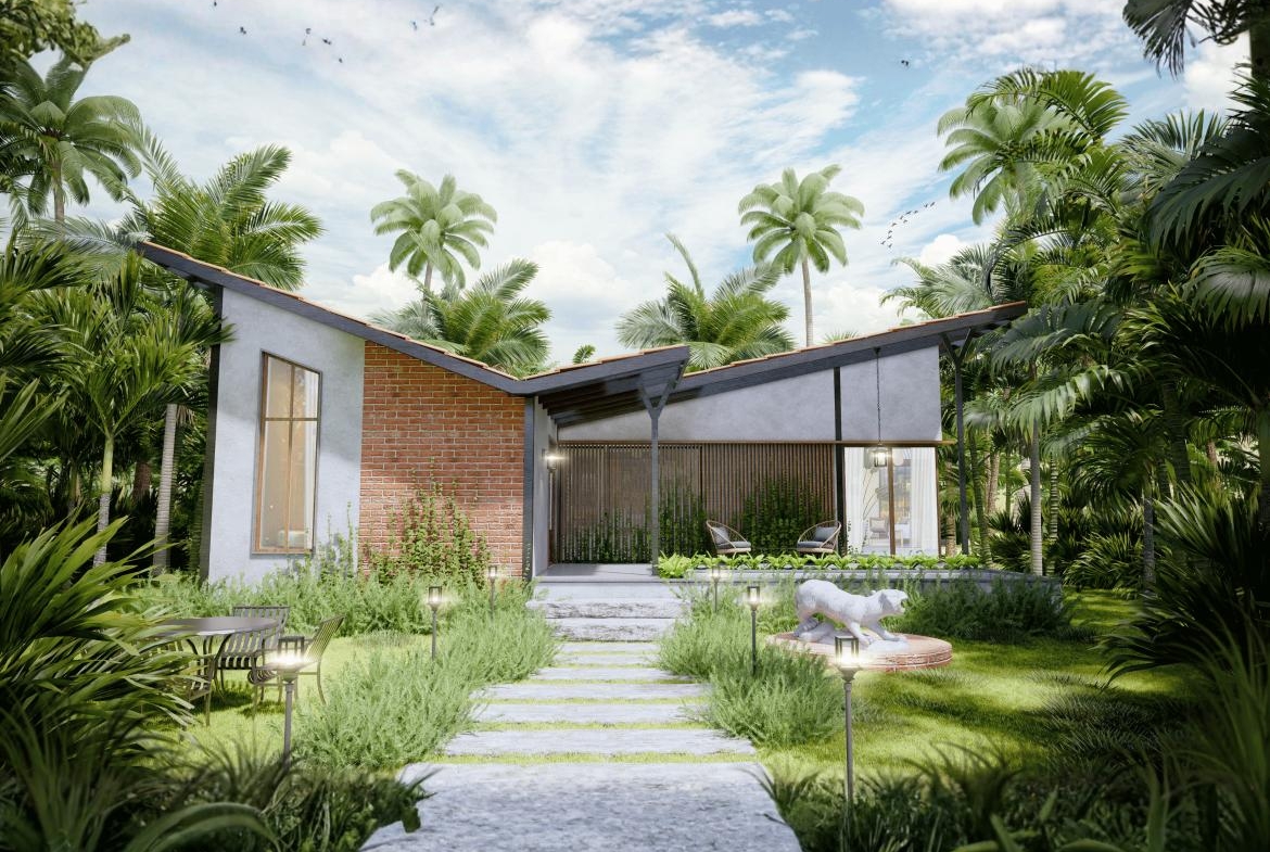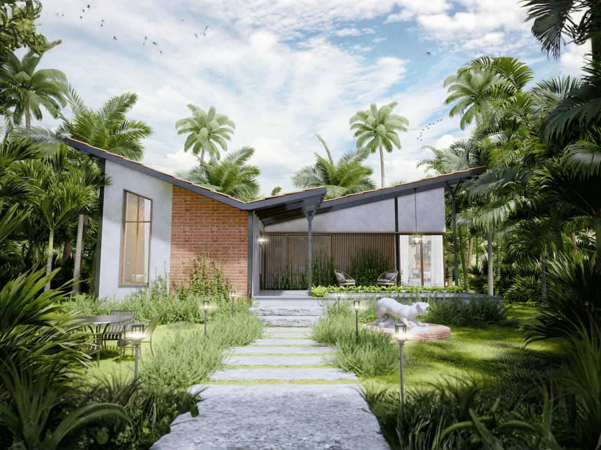A serene tropical villa designed to blend contemporary minimalism with warm, natural textures. The villa embraces a modern tropical aesthetic with clean geometric lines and a dynamic sloped roof that creates a distinctive architectural profile. The asymmetrical rooflines add movement and character, while deep overhangs provide shade.