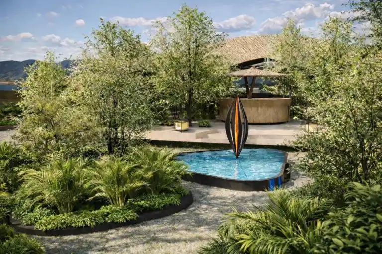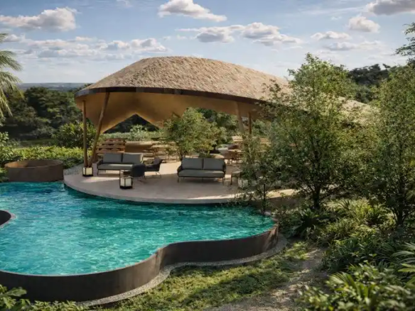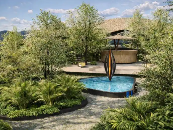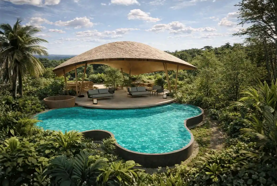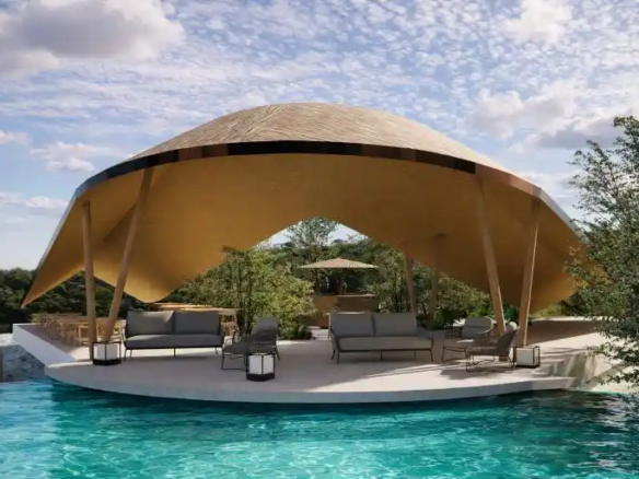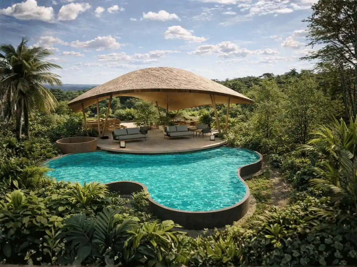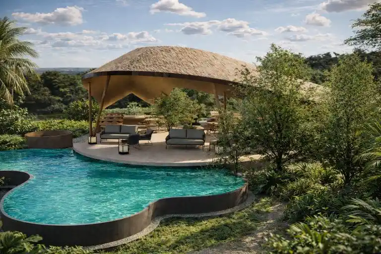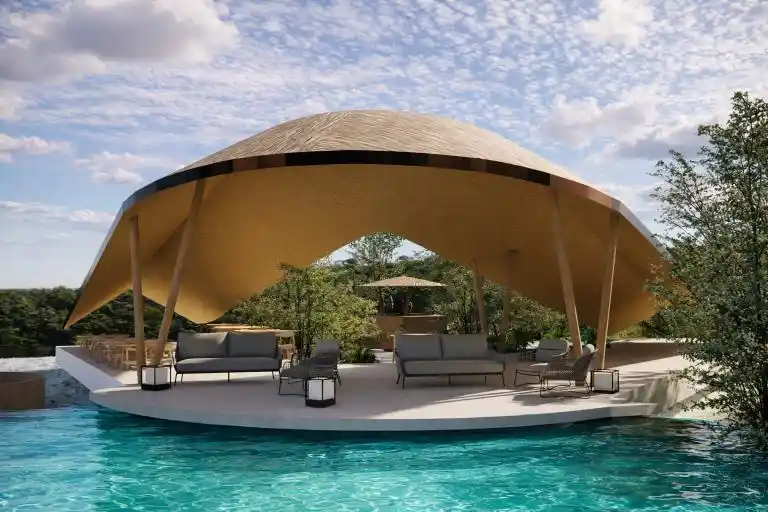 Canopy Table is designed as a serene tropical dining pavilion, defined by a graceful floating canopy that shelters the open seating below. Surrounded by lush greenery and a free-form pool, the architecture blends effortlessly with nature, creating a calm and immersive environment. Natural materials, open layouts, and panoramic views enhance the relaxed resort-style atmosphere, offering a peaceful dining experience connected to the landscape.