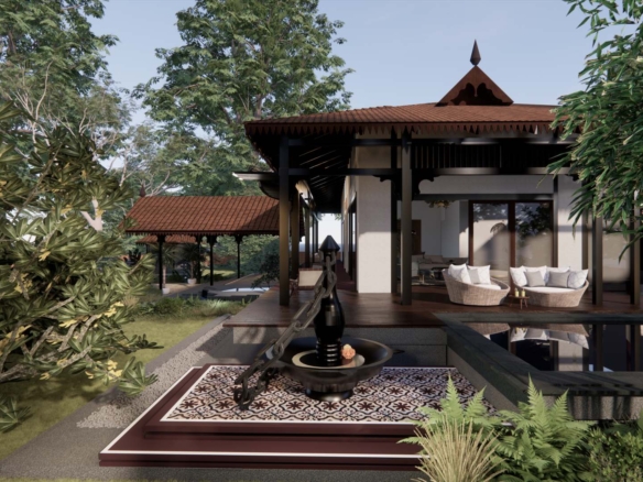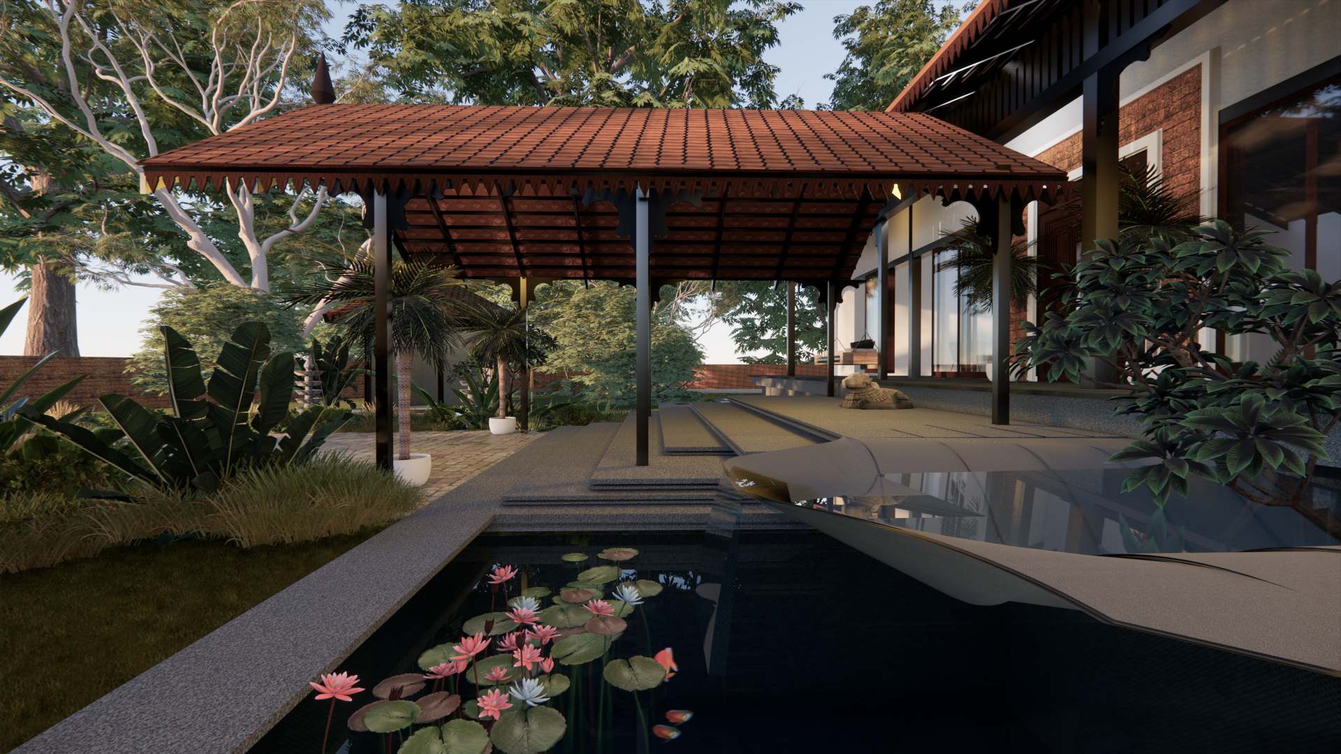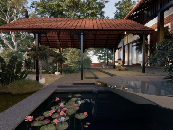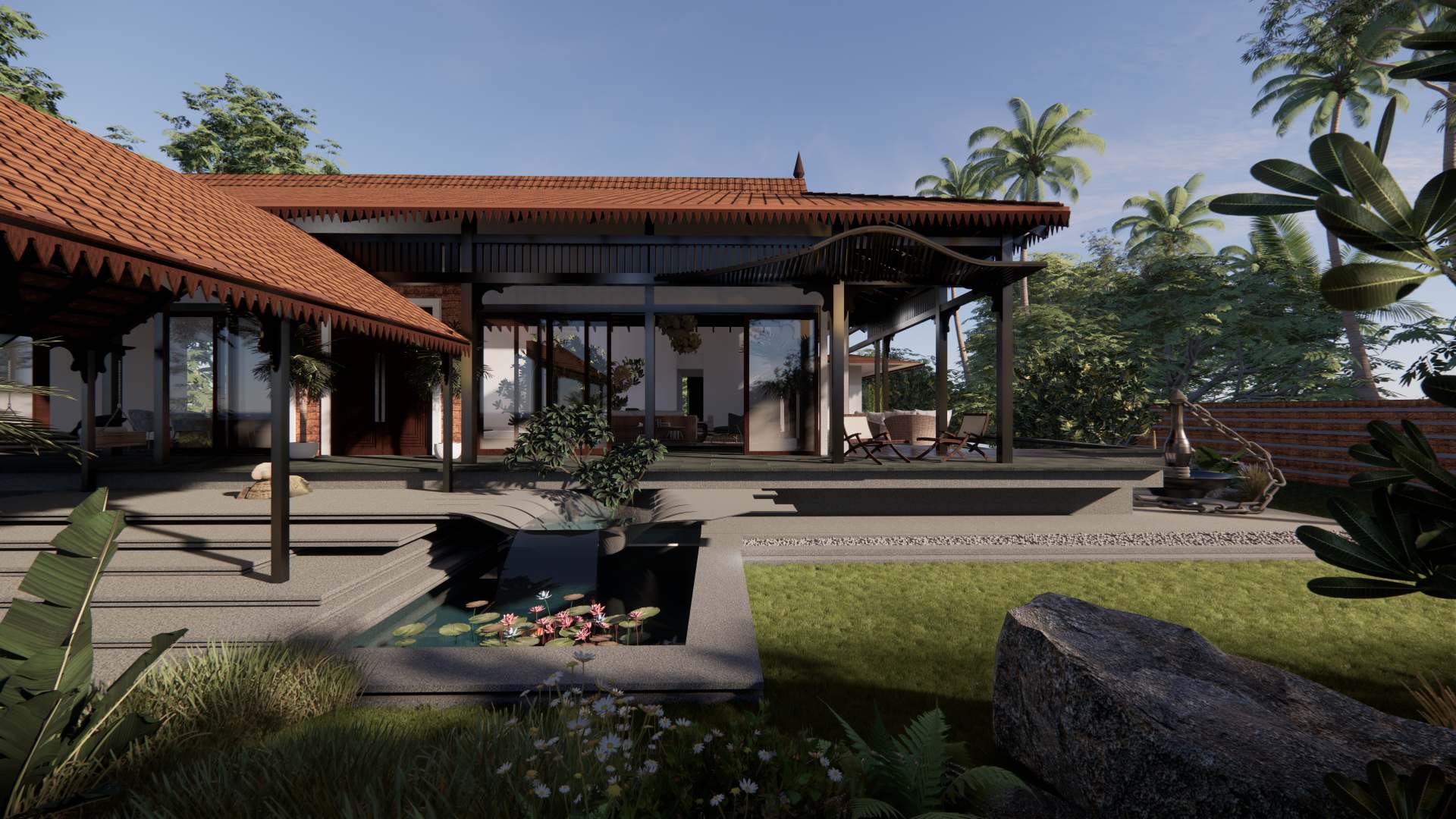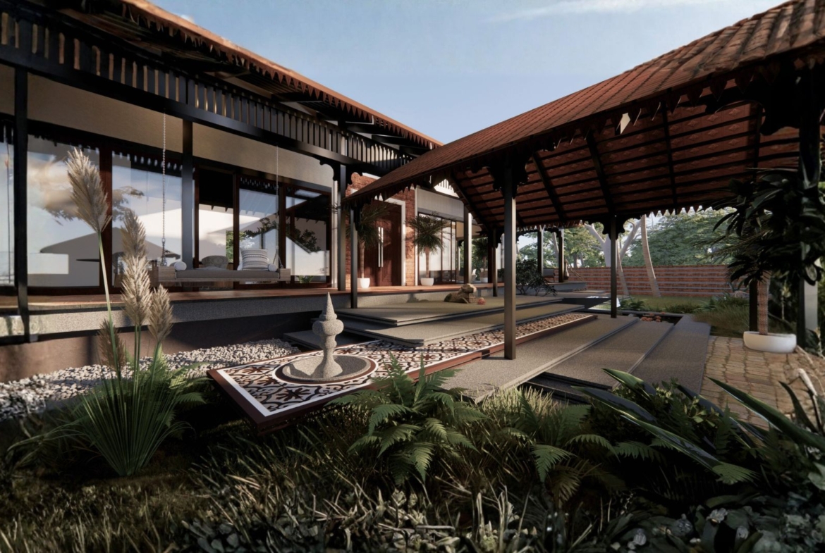 A traditional Kerala-themed courtyard house in Karjat, designed to embrace openness and natural living. The home features a central courtyard that allows light, air, and greenery to flow through the spaces, creating a strong connection with nature. Exposed steel columns add a subtle contemporary aesthetic, beautifully balancing traditional character with modern design