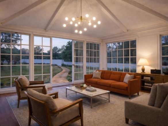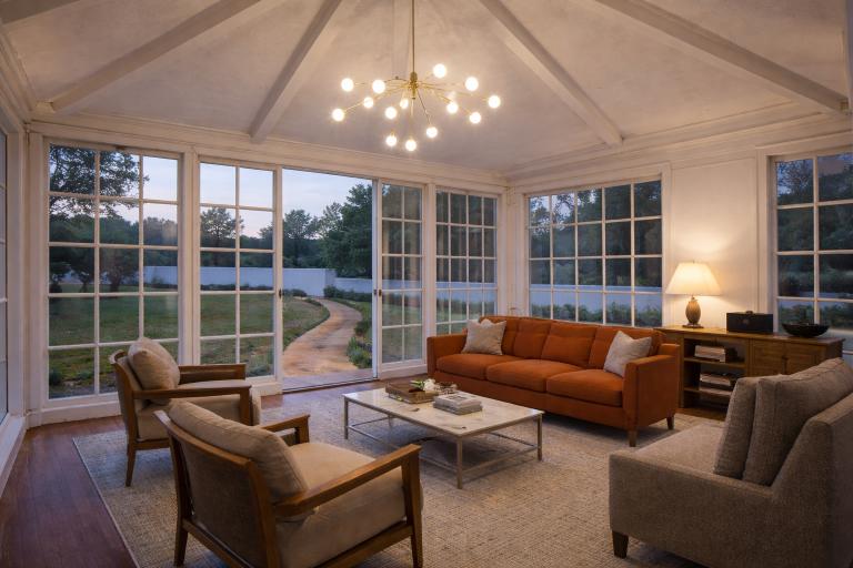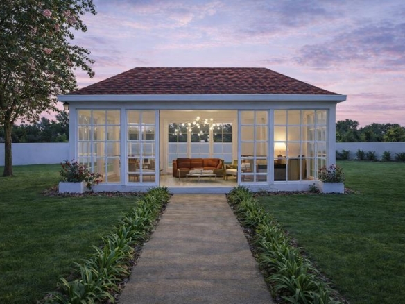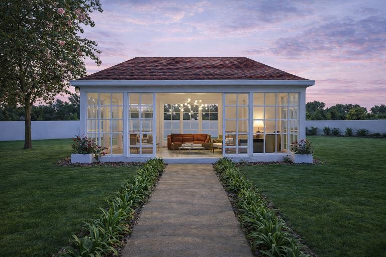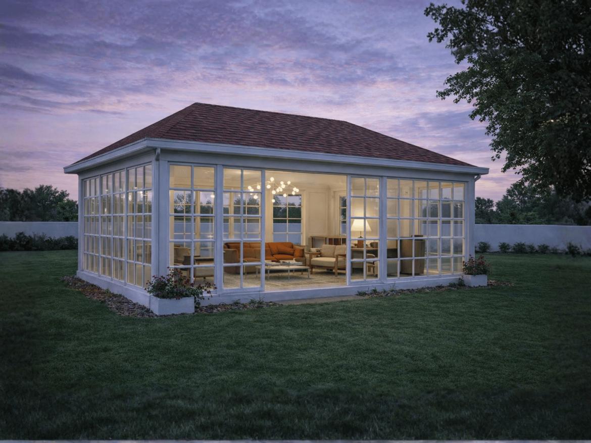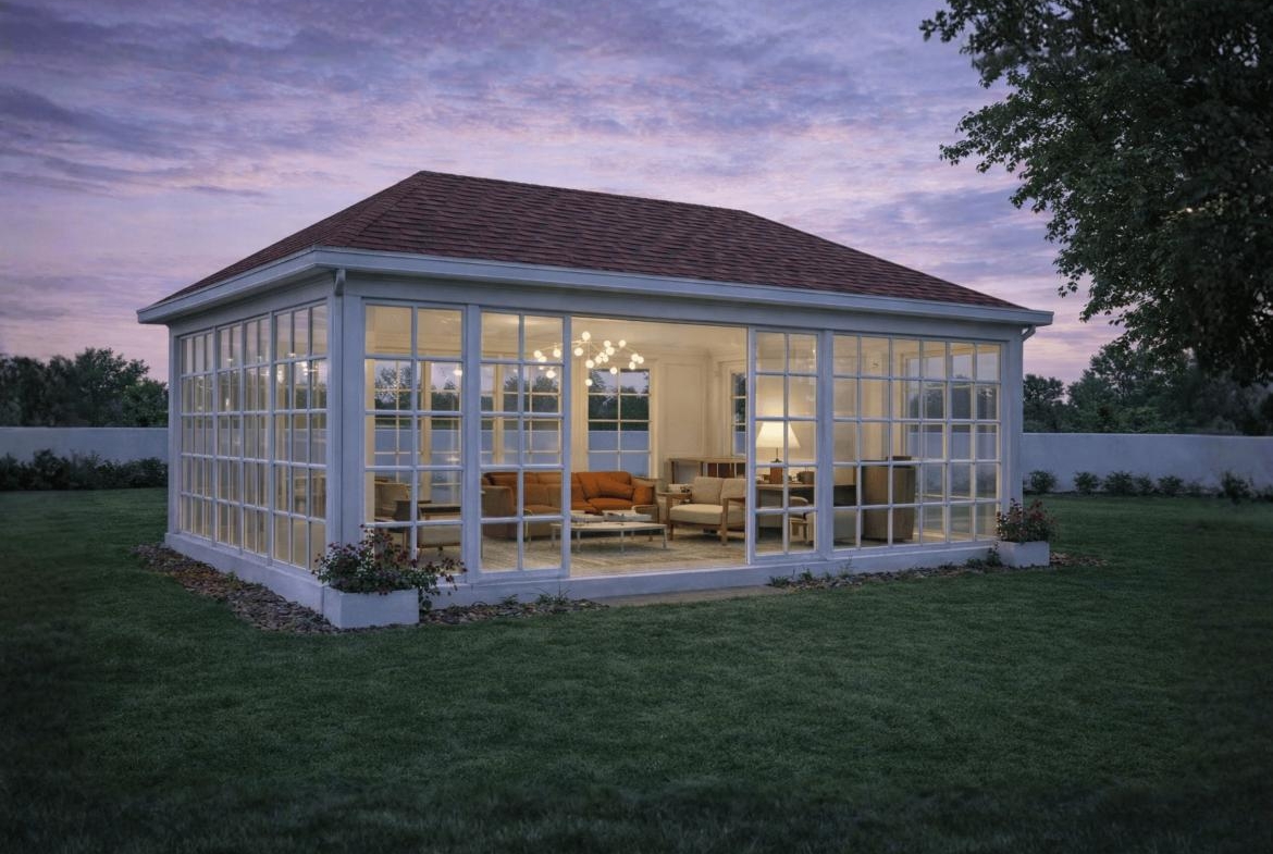 A refined garden pavilion designed in a classical style, featuring a sloped terracotta roof and expansive glass panels. It offers a bright, elegant space that blends indoor comfort with the outdoors, ideal for relaxation, leisure, or intimate gatherings.