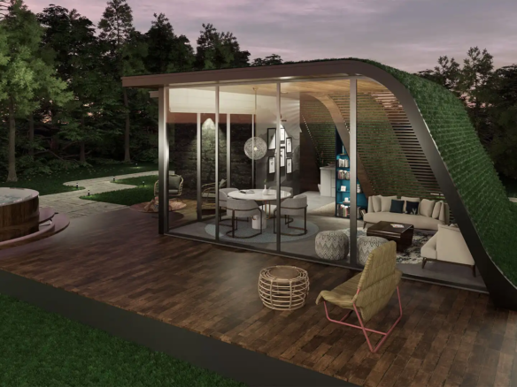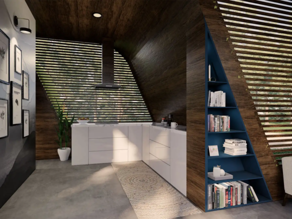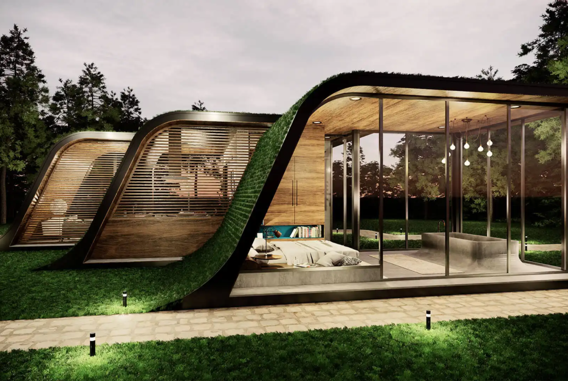 The open plan with the unbridled use of glass with wooden louvres, values privacy while creating a unifying bond with the surrounding landscape. While the pod emerges with its bold frame, the green roof melts it into nature. Through a contemporary design, Greenville optimizes space to fit all your daily needs and creates a nature-weaved experience for your adventurous soul — truly an innate affair worth cherishing!