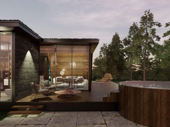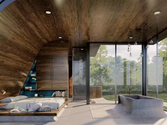 A lavishly planned deck, living, and dining attached with a smart kitchen are designed to optimize functionality while accentuating the space. The common areas follow a plush bedroom, with a utilitarian design for optimized storage. The luscious bedding overlooks nature through floor-to-ceiling openings. A stand-alone bathtub emerges from the micro cement floor adding an earthy touch. A bonfire pit and a circular plunge pool with sunbathing chairs create the perfect social setting to host gatherings of friends and family.
