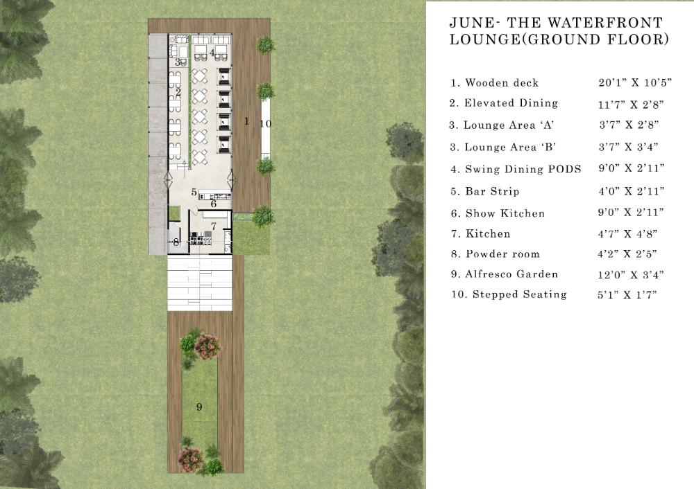 1 Deck, 1 Elevated Dining, 2 Lounge, 4 Swing PODS, 1 Bar Strip, 1 Show kitchen, 1 Kitchen, 2 Powder room, 1 Stepped seating, 1 Terrace seating