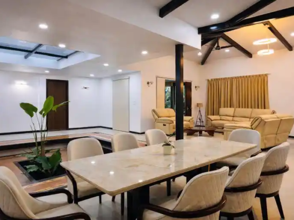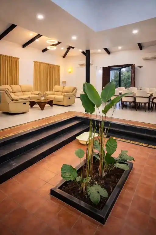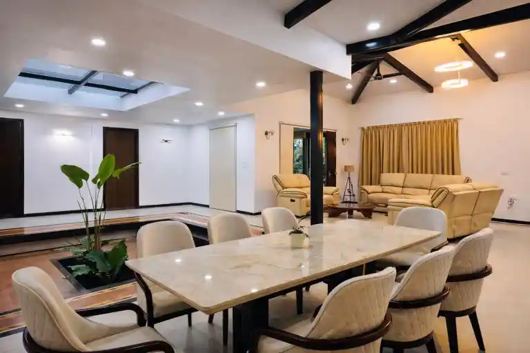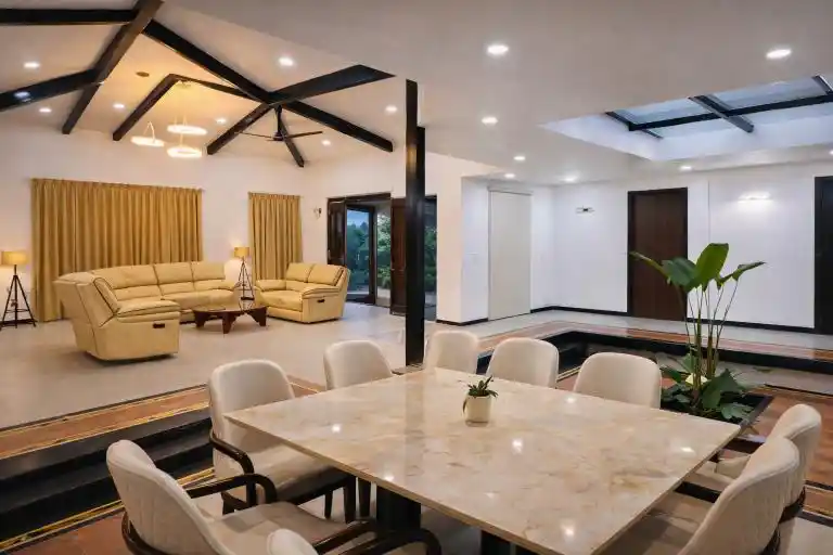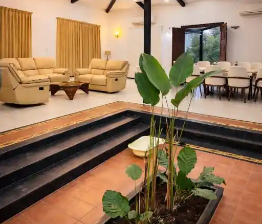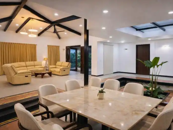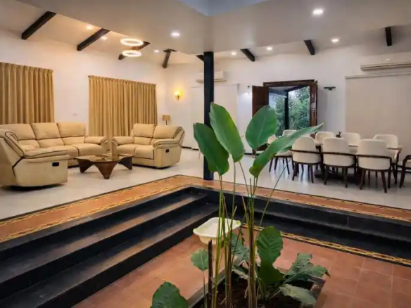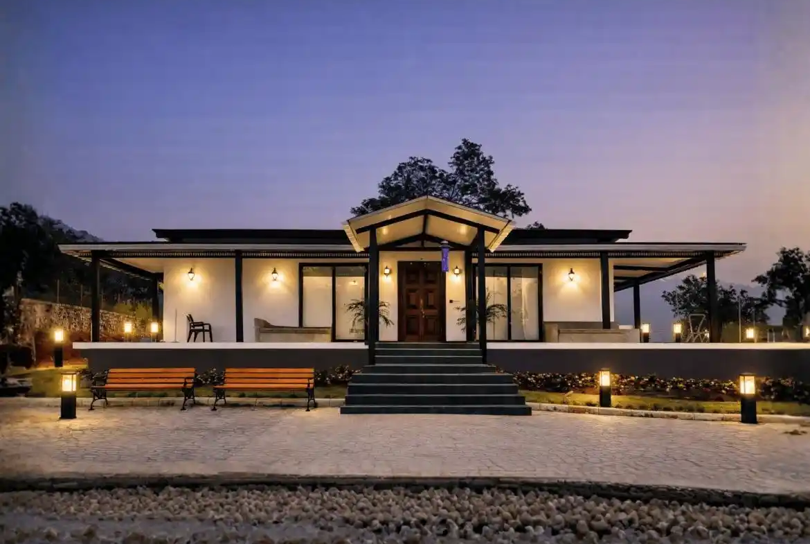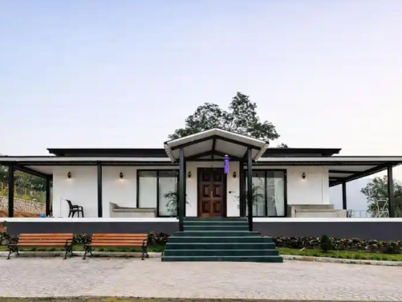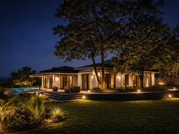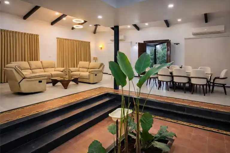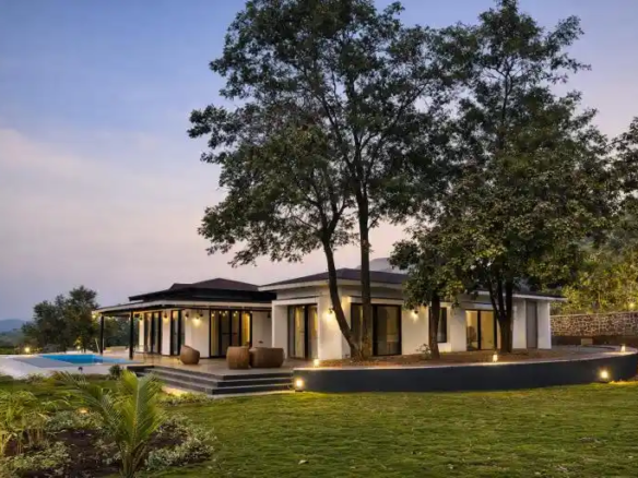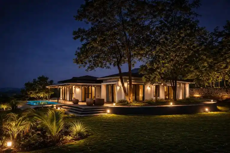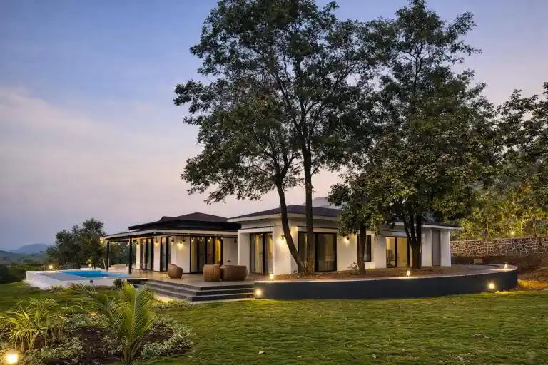 Designed as a perfect tropical retreat in Karjat, the home balances indoor living with nature. It encourages family bonding—often lost in urban life—while offering moments of solitude for reflection. Shaded decks invite you to enjoy monsoon rains, the soothing trickle of water, and serene outdoor breakfasts against a mountain backdrop.