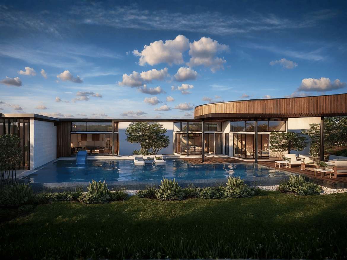 A modern villa with a grand swimming pool designed for larger gatherings and a striking elevated bridge, blending luxury, elegance, and seamless indoor–outdoor living. Designed as a private retreat, this villa showcases a generous swimming pool for larger gatherings and a statement bridge that elevates the overall spatial experience.