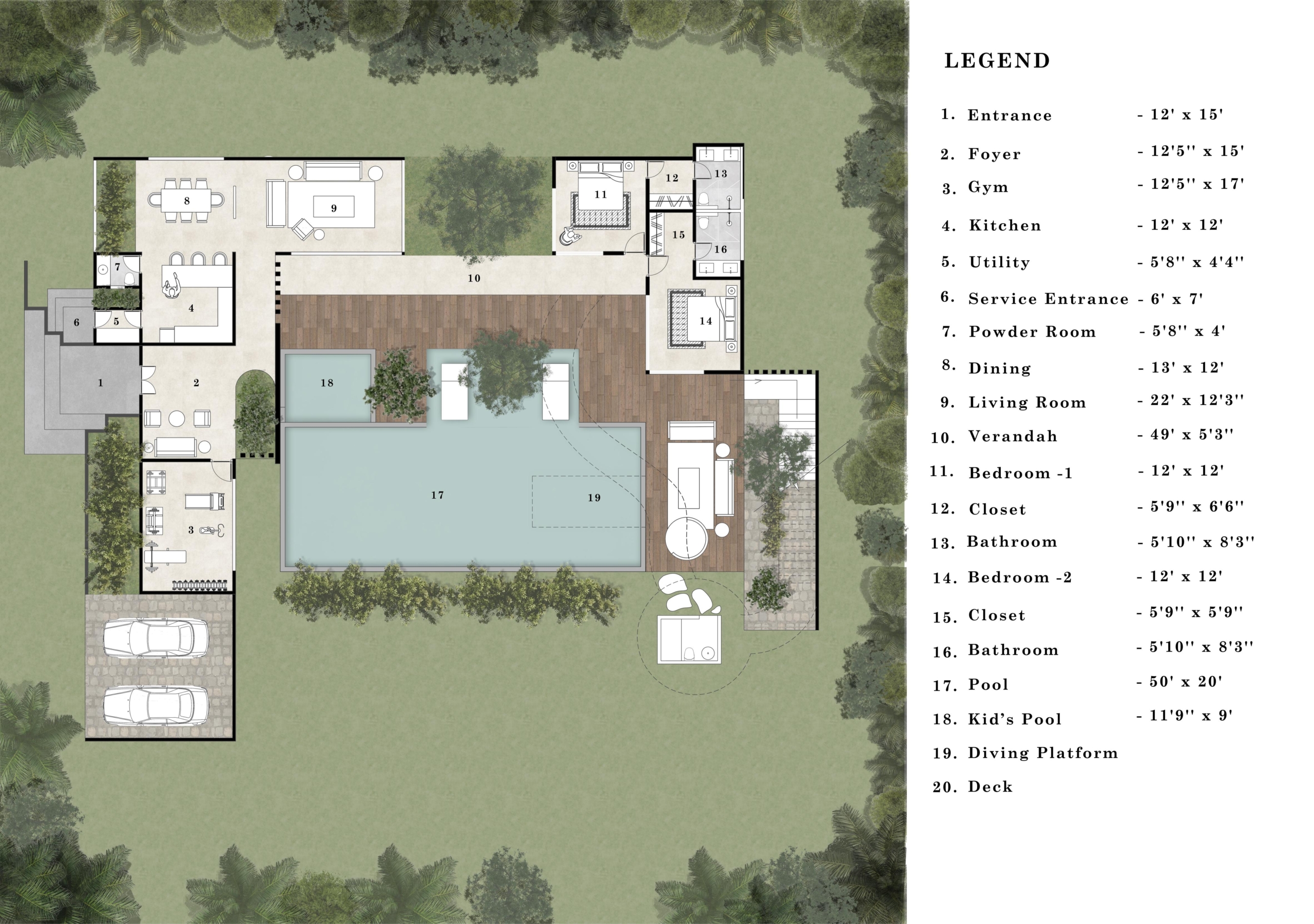 Foyer, 1Gym, 1 Sauna, 1 Kitchen, 1 Utility, 2 Bedrooms, 4 Powder rooms, 2 Verandahs, 1 Gazebo, Pool(43’3″ x 20’2″)