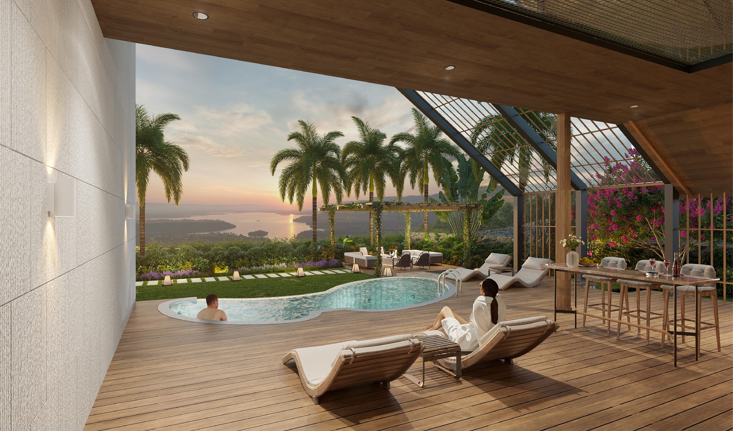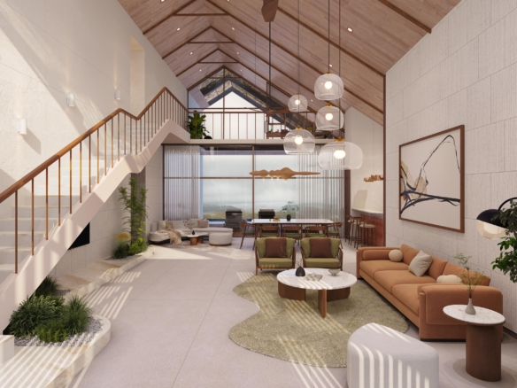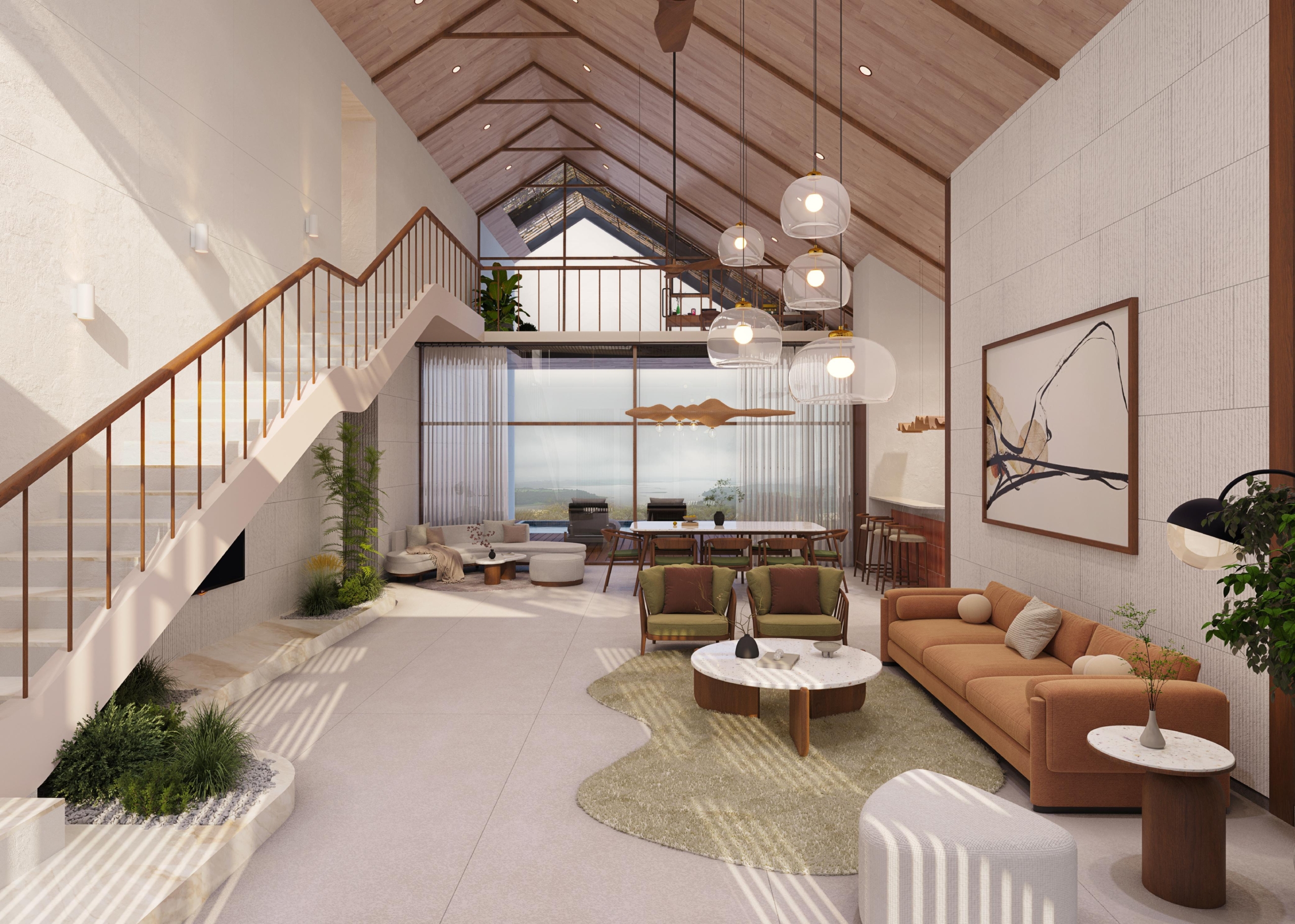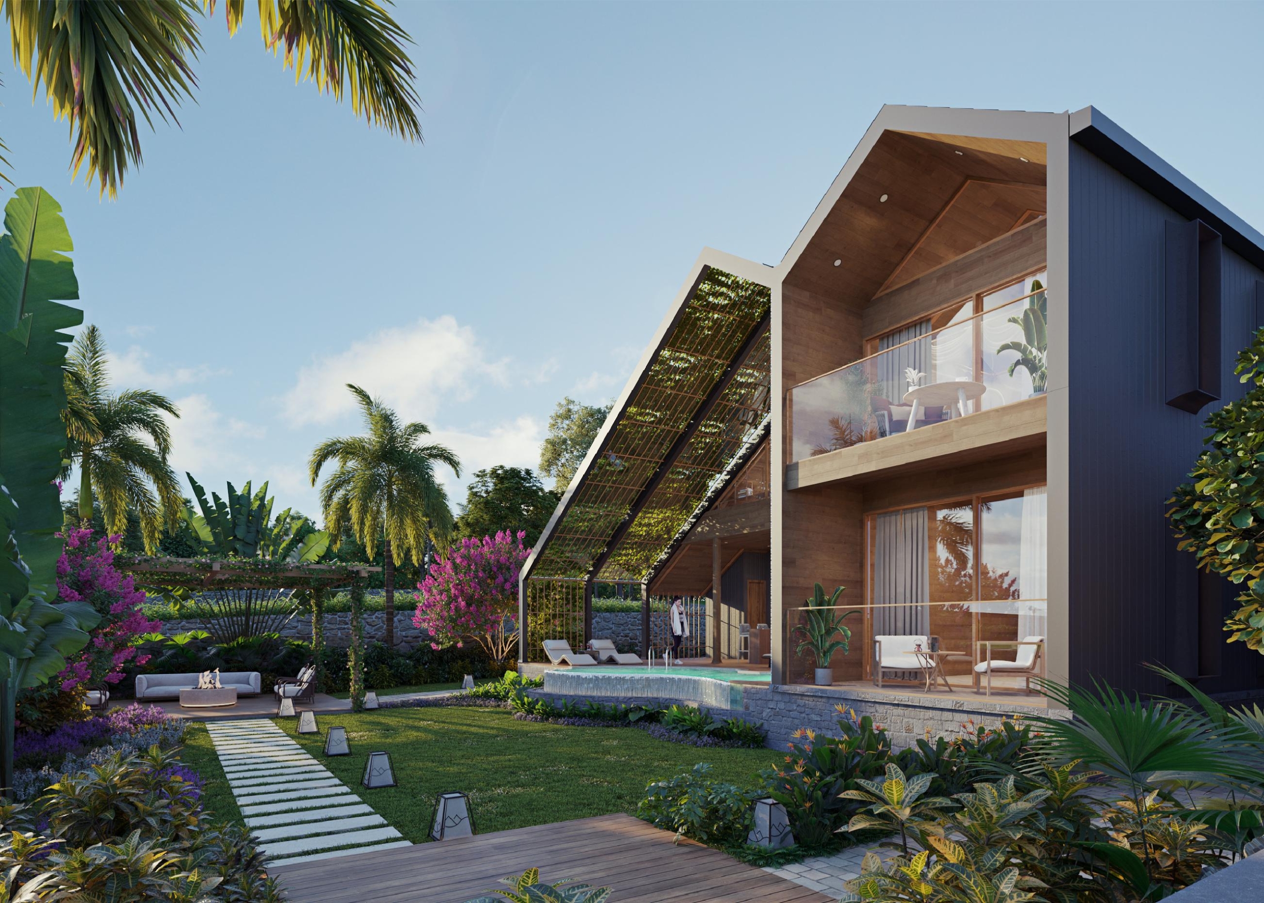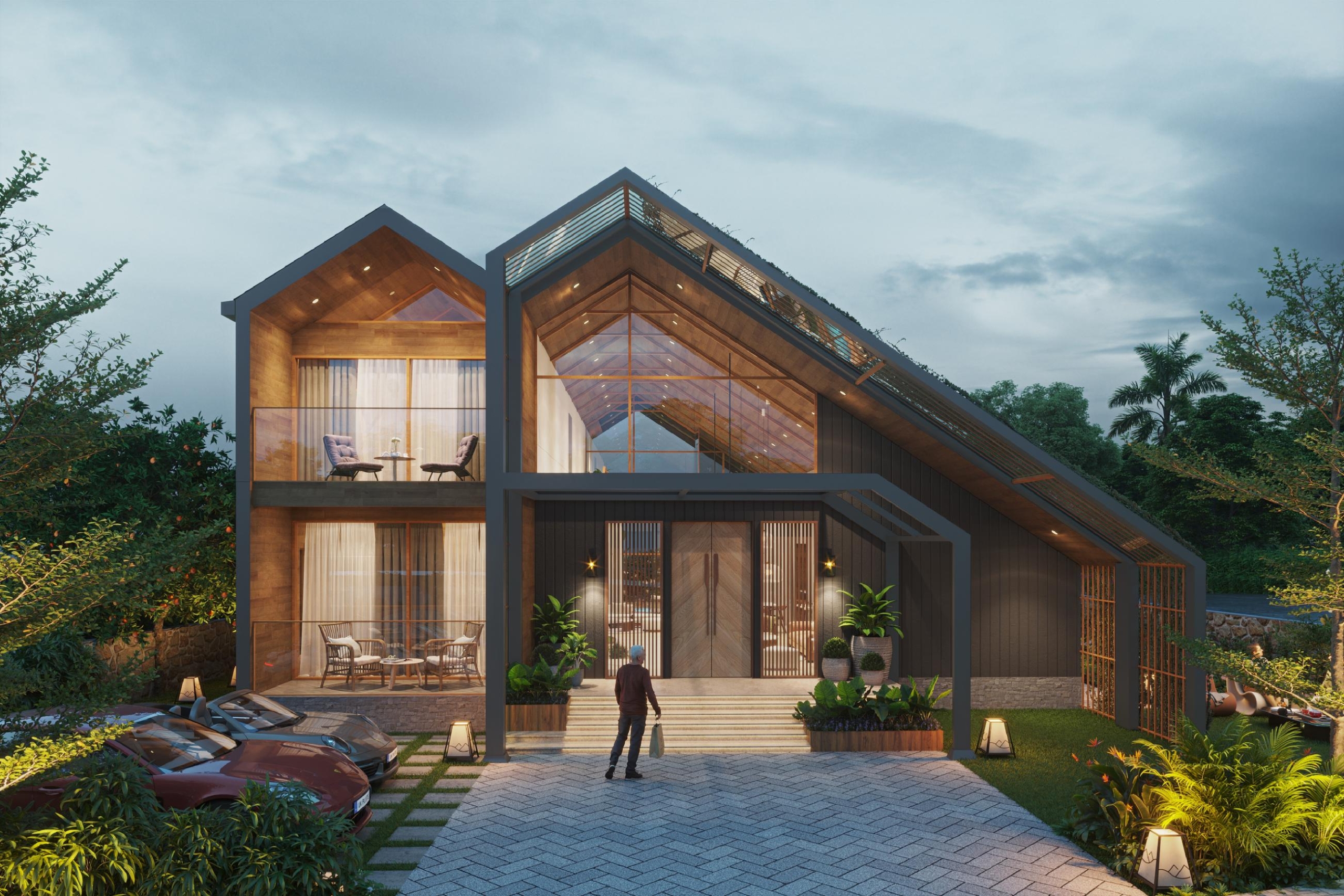 A modern tropical villa with bold sloping roofs, expansive glass façades, and a refined mix of wood, stone, and concrete. Double-height spaces and large openings flood the interiors with natural light, creating an airy, warm, and minimalist living experience. Lush landscaping, a private pool, and relaxed outdoor sit-outs complete this serene, resort-style retreat designed for luxury, privacy, and connection with nature.