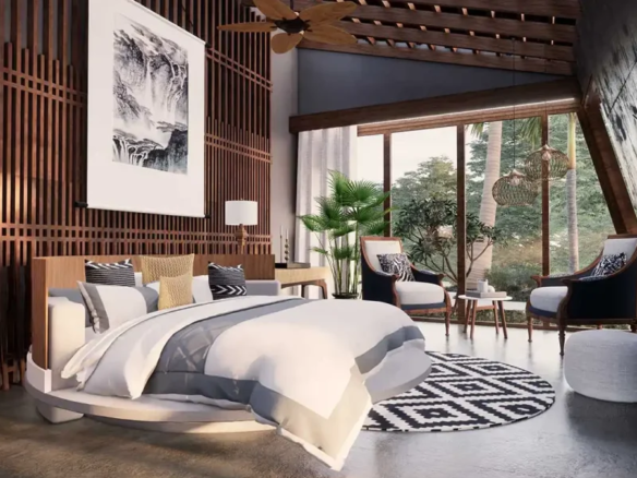 A grand wooden door and muted walls greet visitors at the entrance, setting the tone of the villa – striking and luxurious. The double-height living room is flanked by the dining room and a bedroom on one side and two bedrooms on the other.