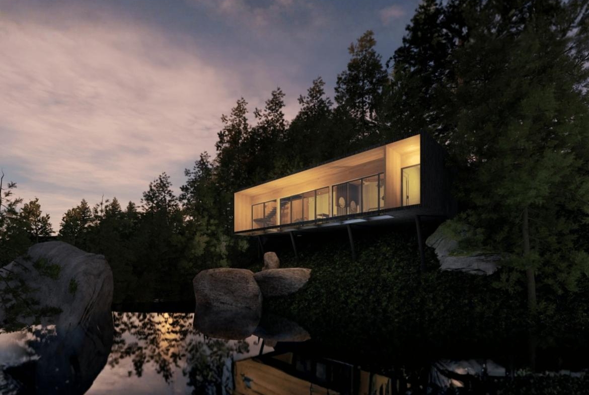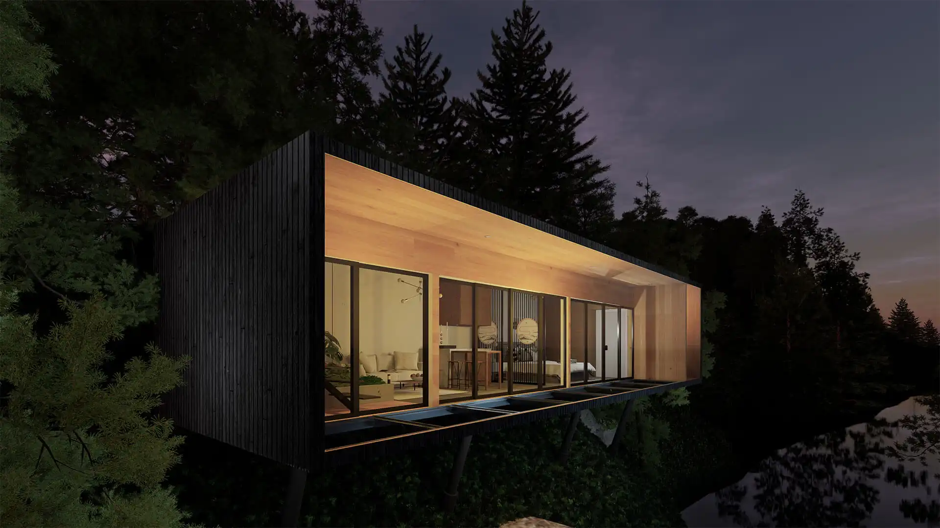 Sprawling across an area of 632 sq. ft., the black wood and texture classing on the interiors complement the surroundings. Composed of a living room, kitchen, bedroom, bathroom, and deck, this prefabricated cabin is the perfect spot to stay connected with the natural world. The free-flowing spaces can conveniently nestle 2-3 residents.