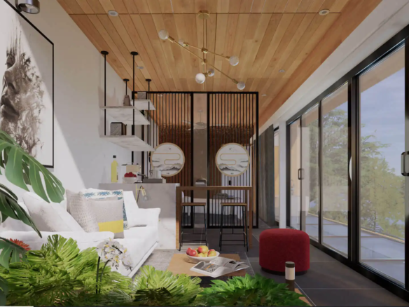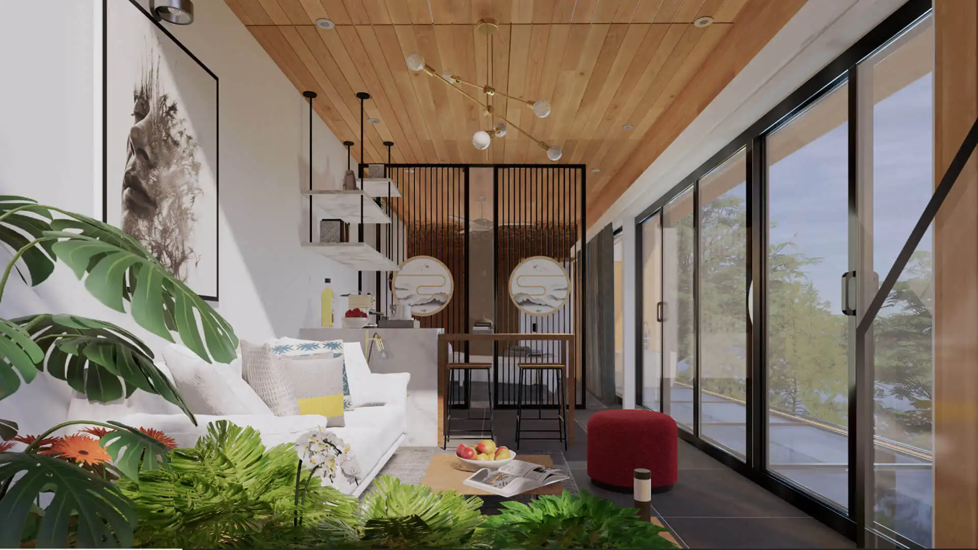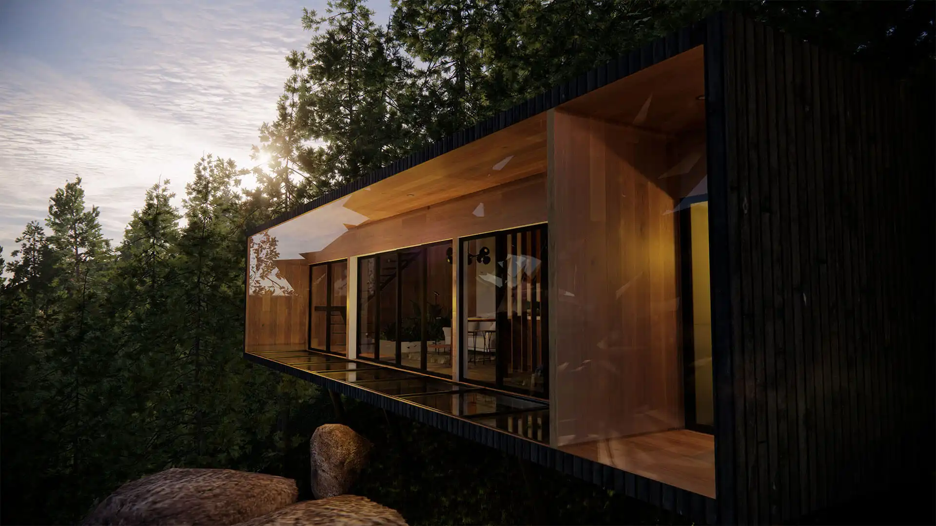 As one approaches the cabin, they’re welcomed with an accessible roof. You can either climb up for a seamless view of the surroundings or enter the world of contemporary aesthetics. The door opens up into a plush living room and kitchen adorned in a muted natural palette with wood and white paint being the dominant tones along with accents of glass. The private zone of the cabin is strategically accommodated at the end. The calming interiors open up to the balcony with a glass floor, adding a dynamic experience to interact with nature. This container-inspired design incorporates the juxtapositions of indoors and outdoors. The earthy mood board creates a forest theme within the interiors. While the eclectic surroundings engulf you in its enigma.