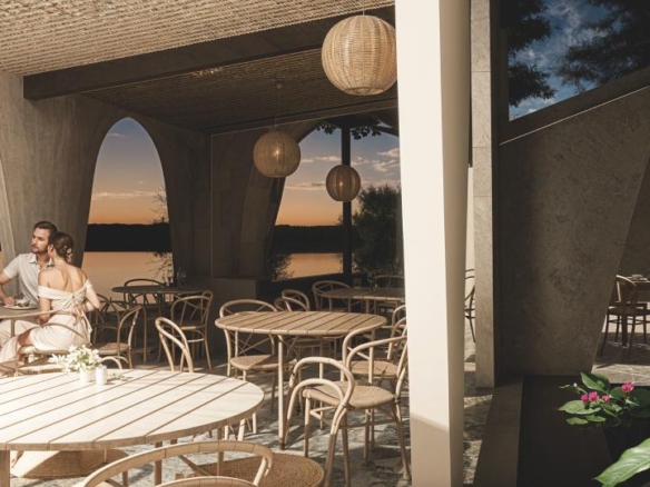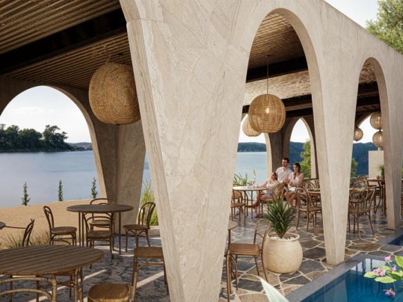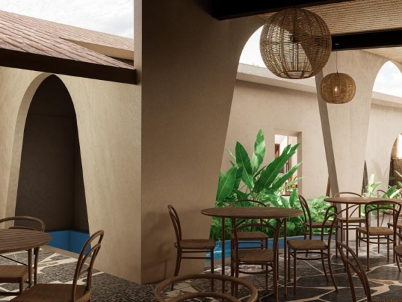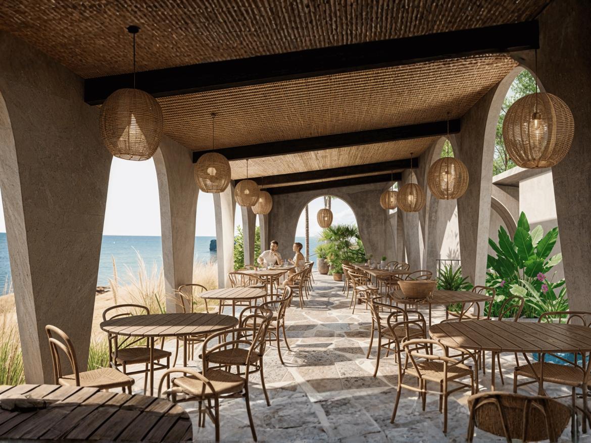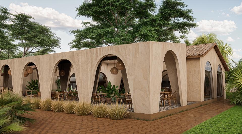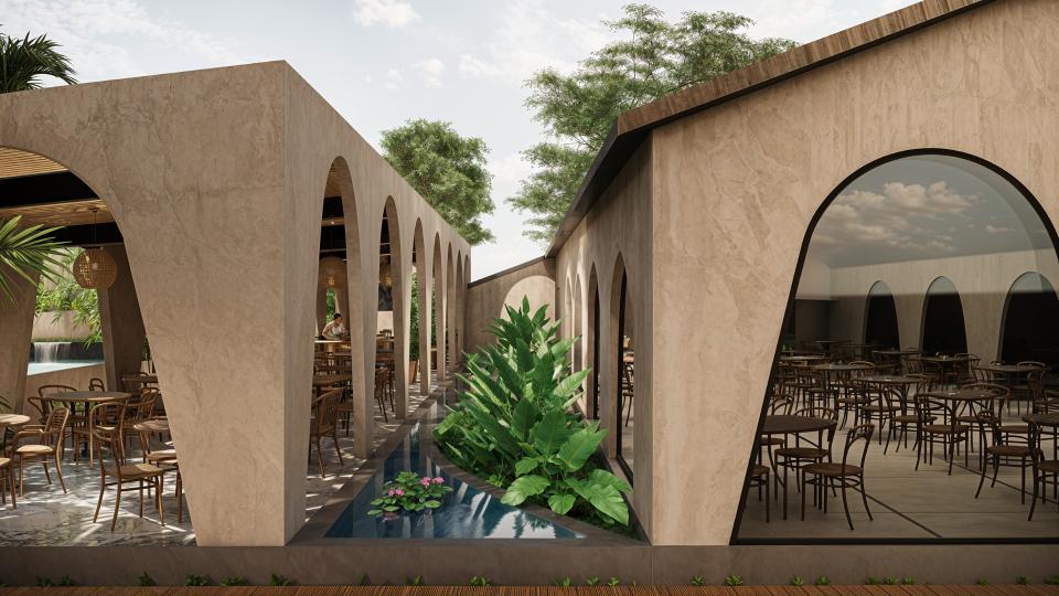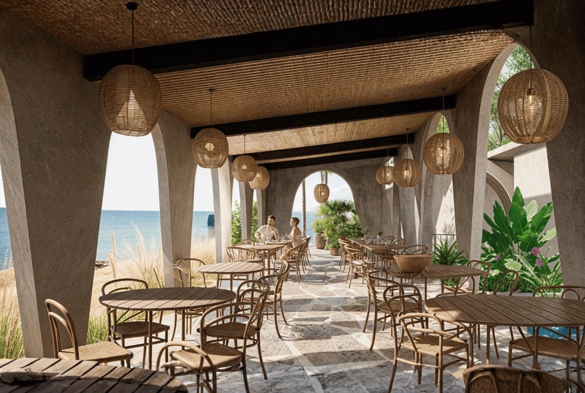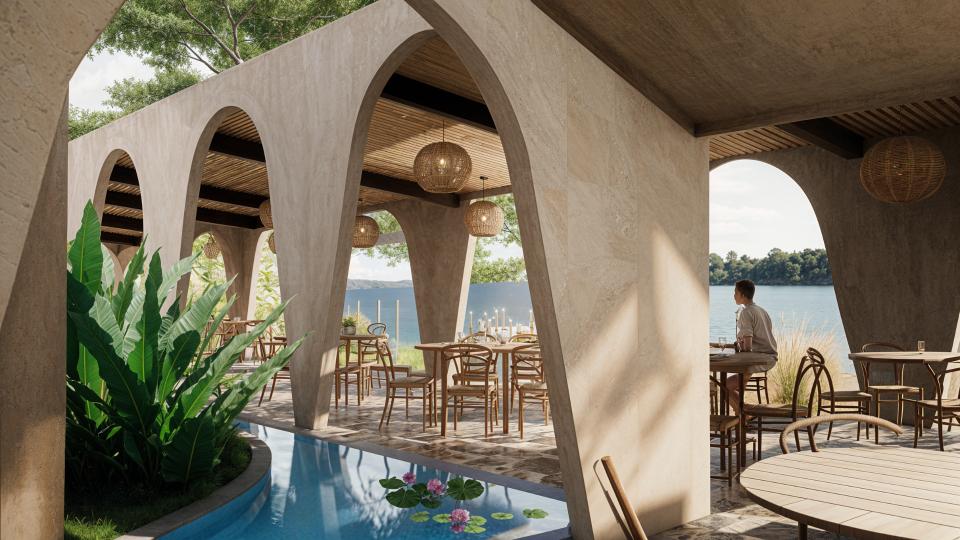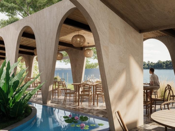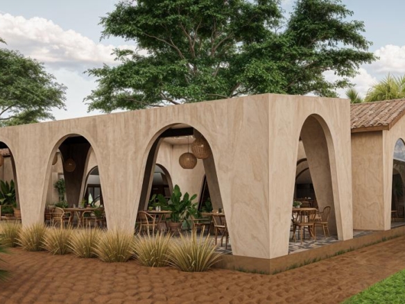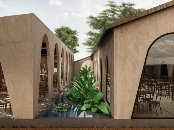 Restaurant Architecture embraces an earthy, sculptural theme defined by a rhythmic series of soft arches that create shaded, semi-open dining spaces. Warm textured walls and natural materials give the structure an organic presence that blends seamlessly with the surrounding greenery, creating a relaxed tropical dining atmosphere.