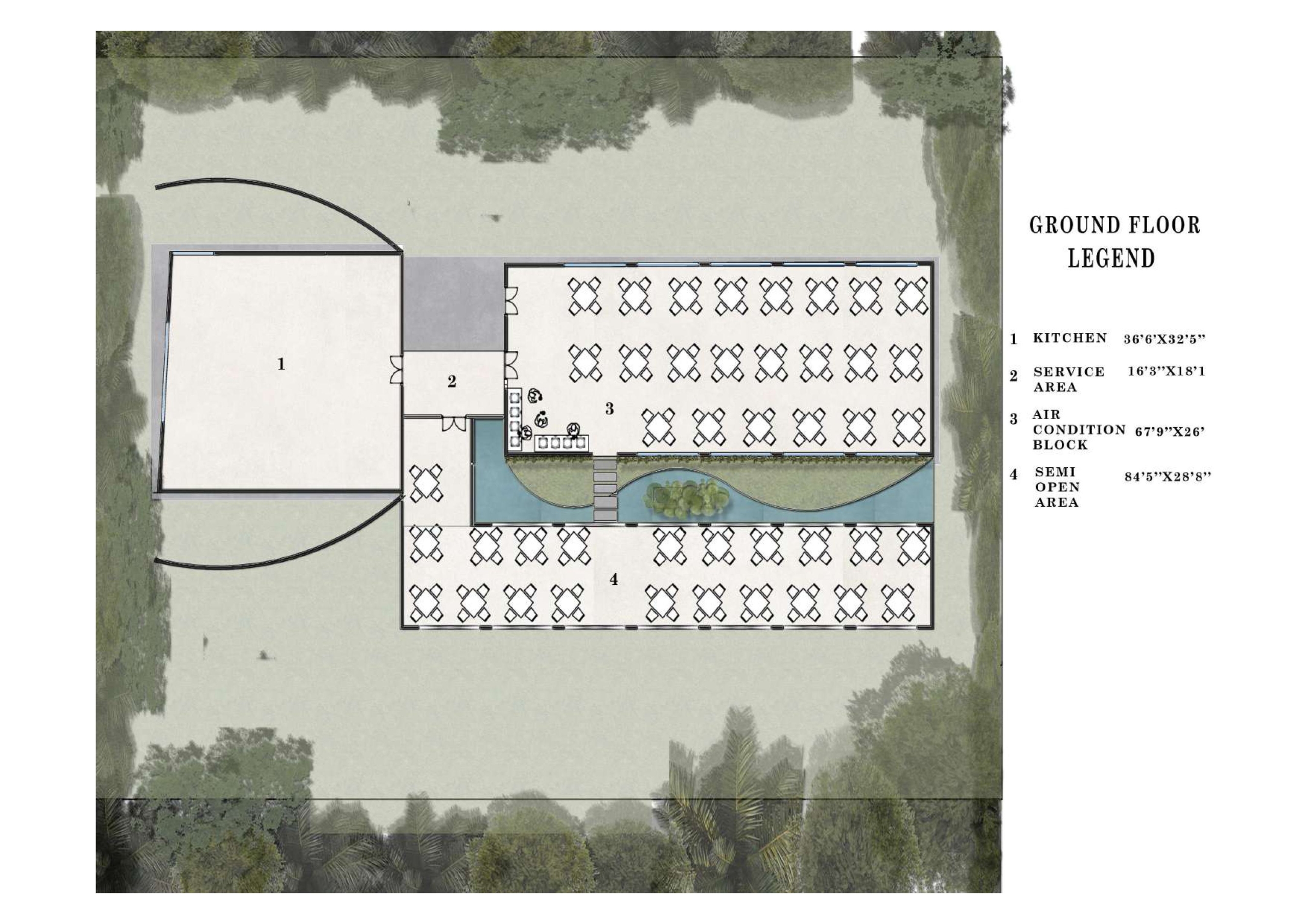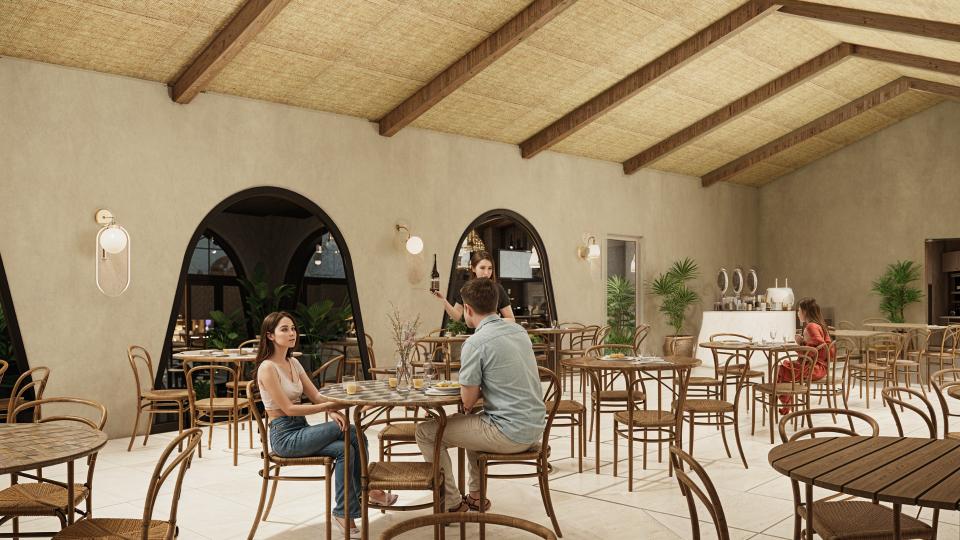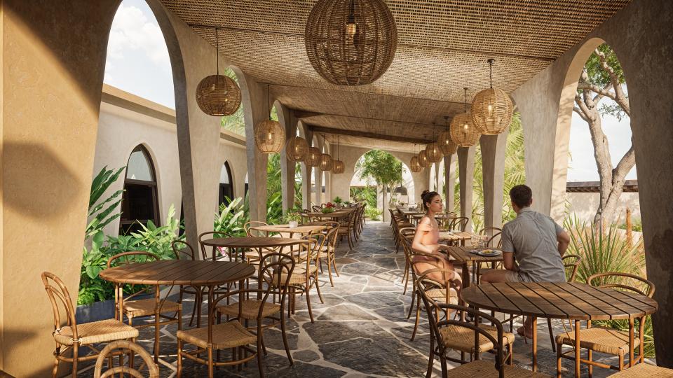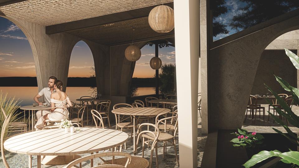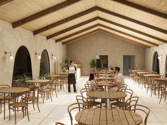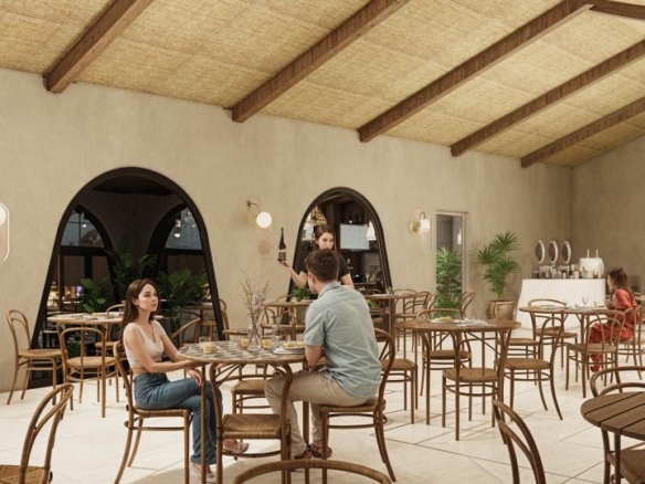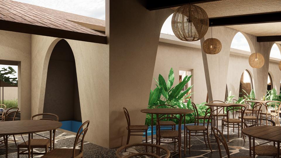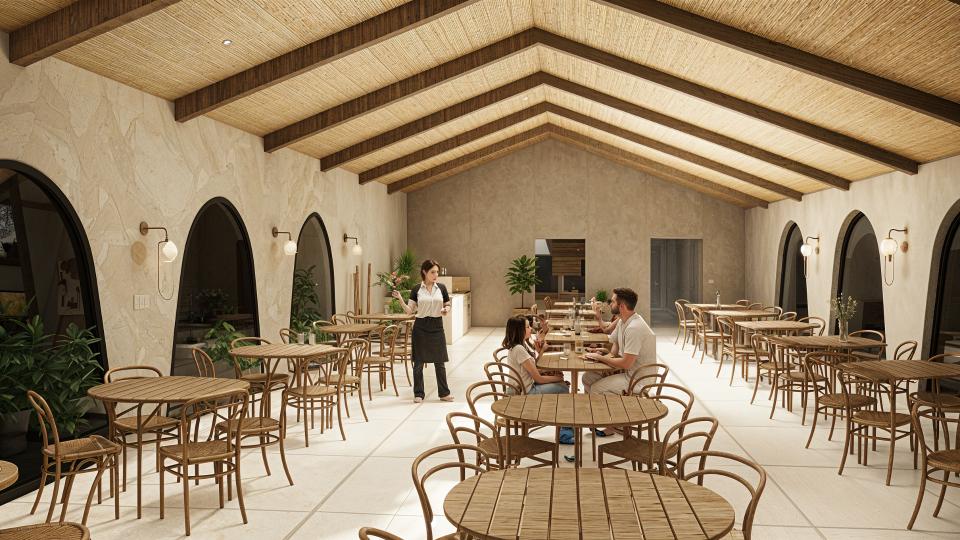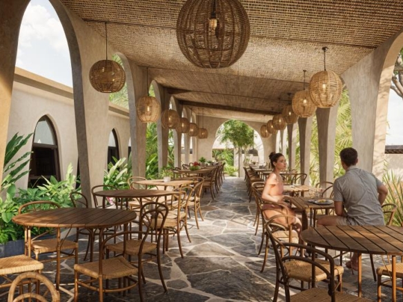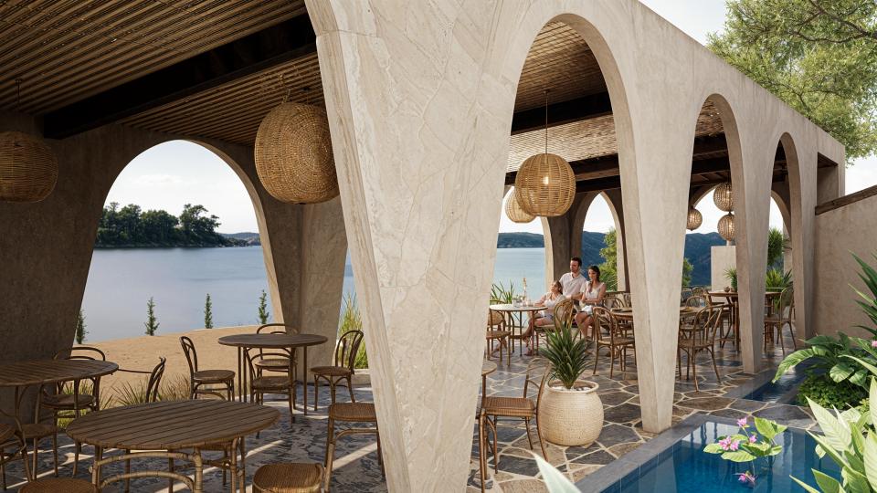 Restaurant Architecture embraces an earthy, sculptural theme defined by a rhythmic series of soft arches that create shaded, semi-open dining spaces. Warm textured walls and natural materials give the structure an organic presence that blends seamlessly with the surrounding greenery, creating a relaxed tropical dining atmosphere.