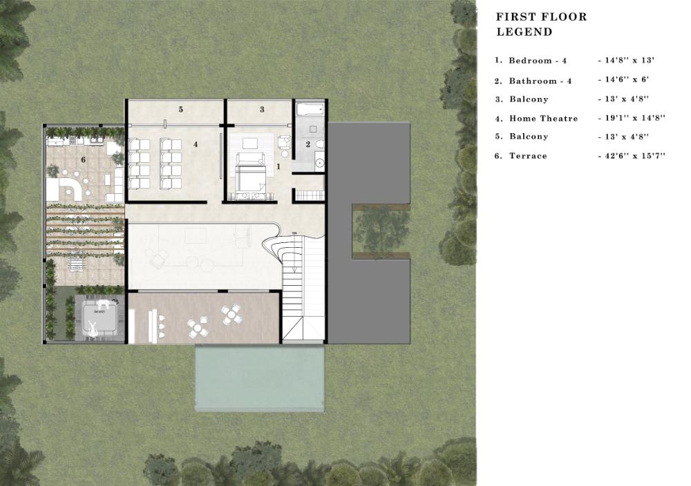 1 Entrance Deck, 1 Foyer, 1Living Room, 1 Kitchen, 1 Dining Area, 5 Powder rooms, 1 Deck, 4 Bedrooms, 2 Balconies, 1 Home Theatre, 1 Terrace, 1 Pool(25″9×13″6′)