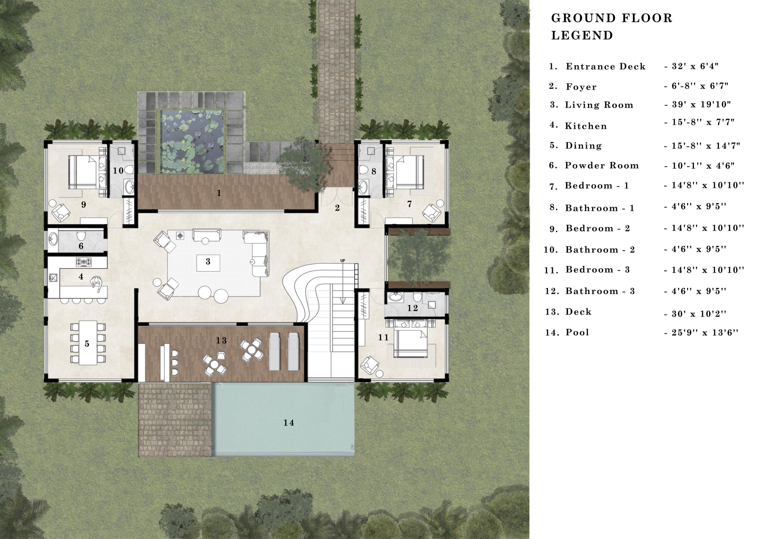 1 Foyer, Living Room, 1 Dining Area, 4 Bedrooms, 5 Powder rooms, 1 Staffroom, 4 Bathroom, 1 Deck, 1 Pool(30′ x 10′)