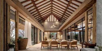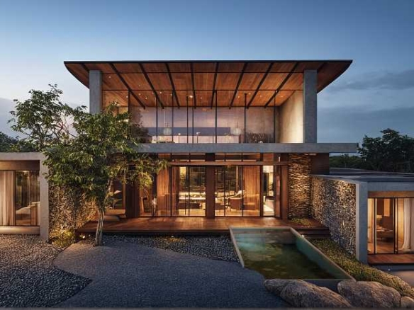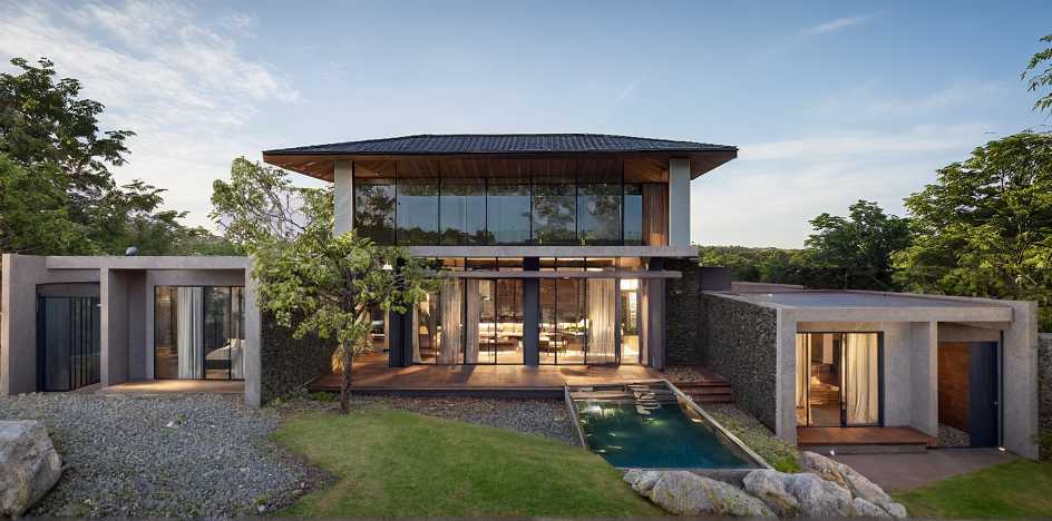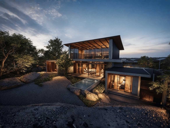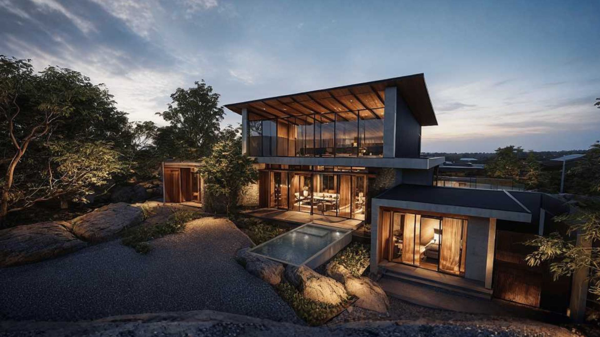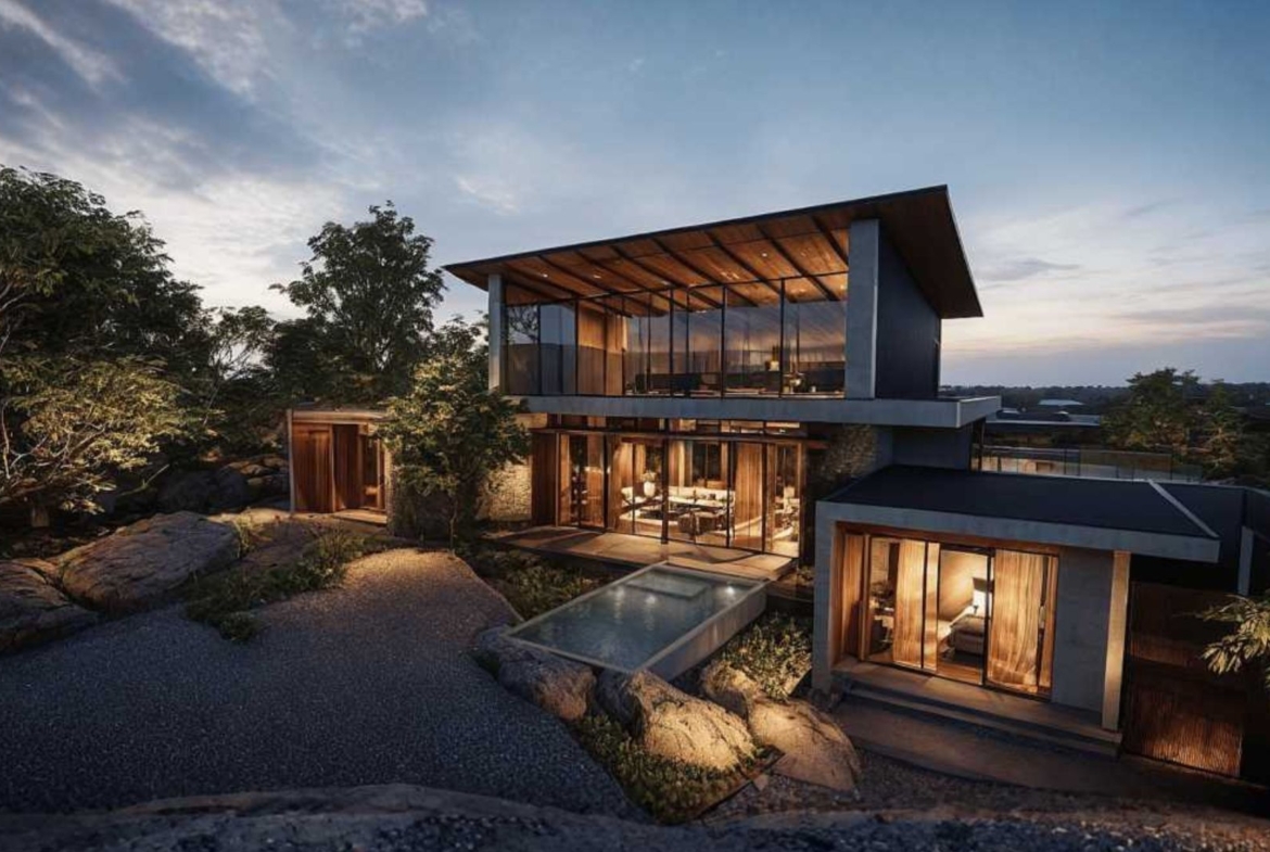 Set amidst nature, this modern villa enjoys stunning 360-degree panoramic views, open interiors, and thoughtfully crafted outdoor spaces. A private plunge pool and warm material palette transform the home into a serene luxury escape.
