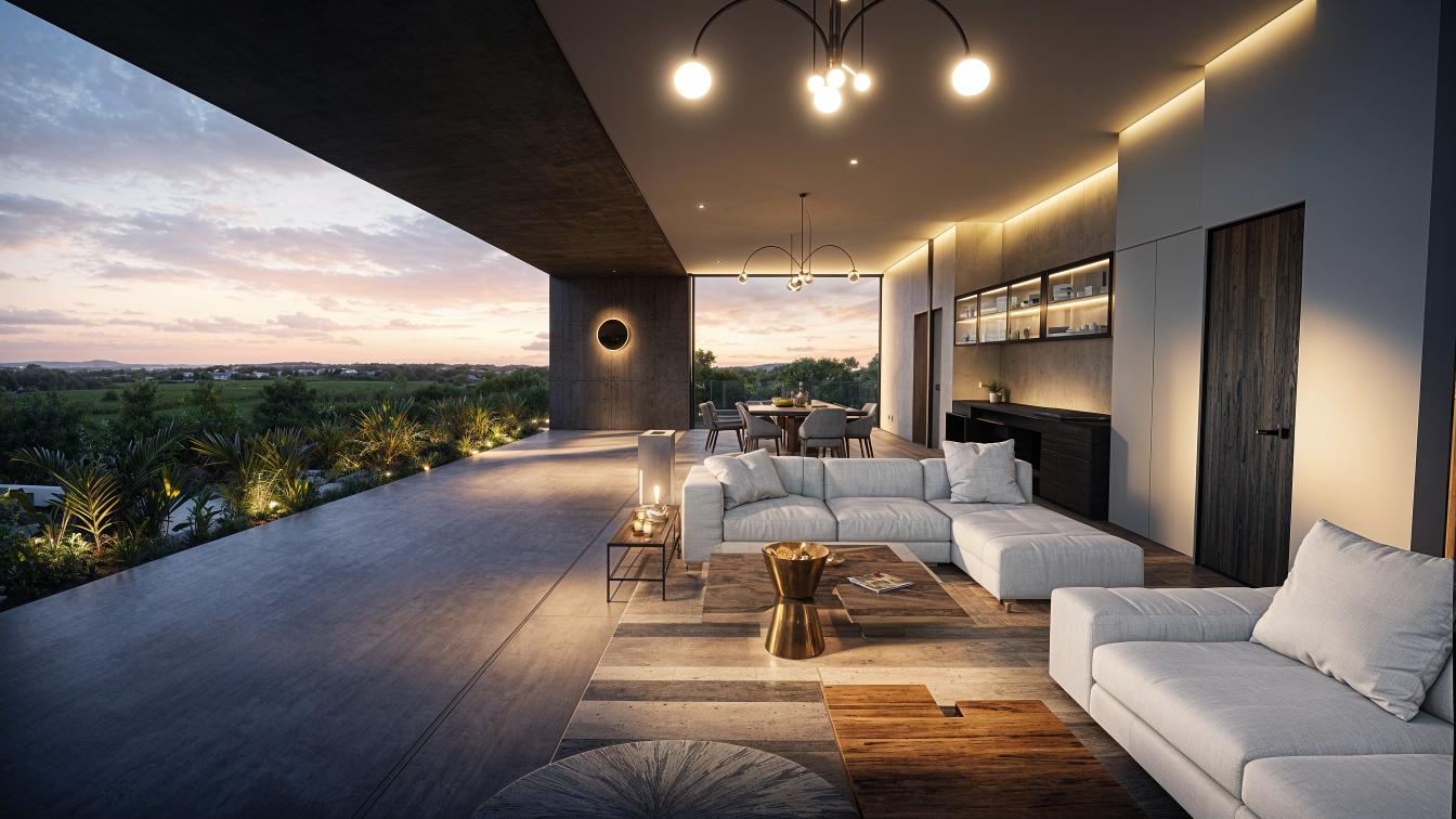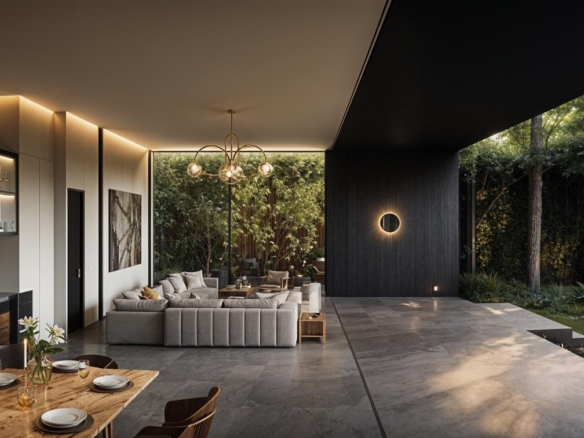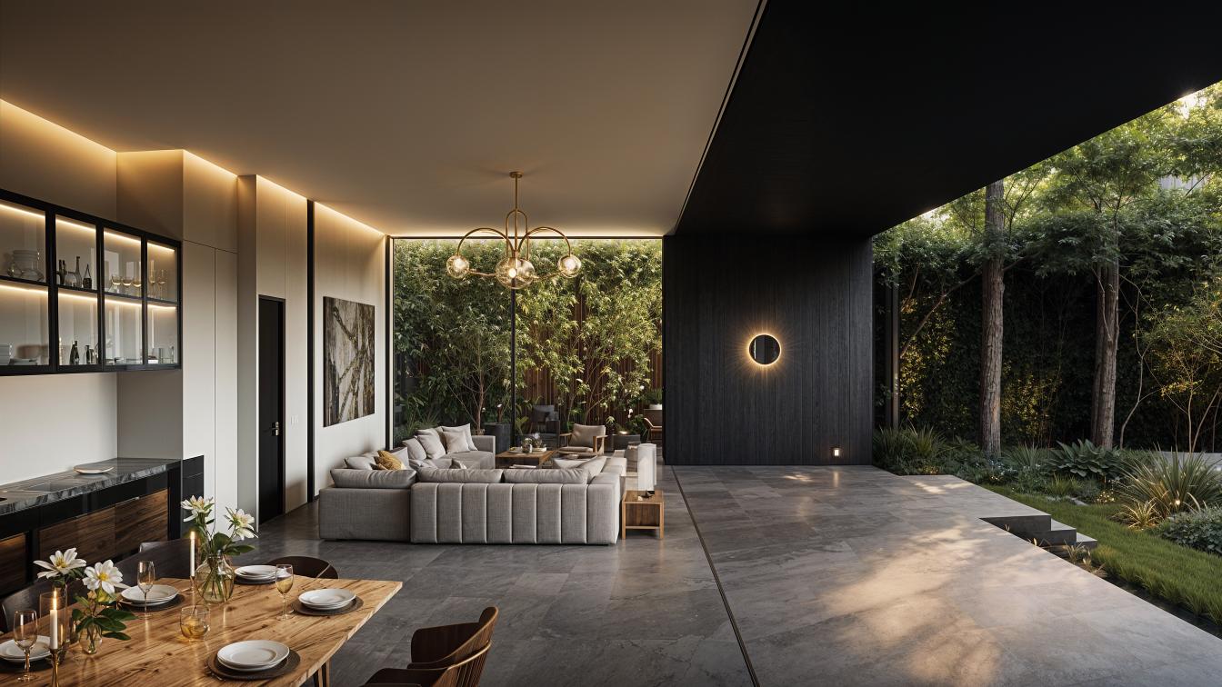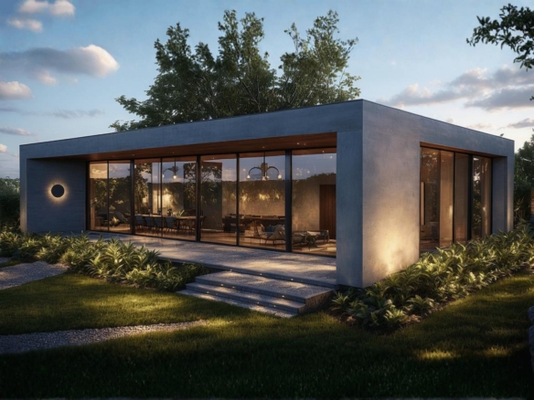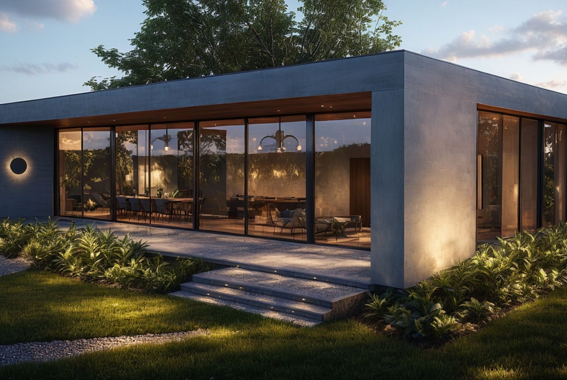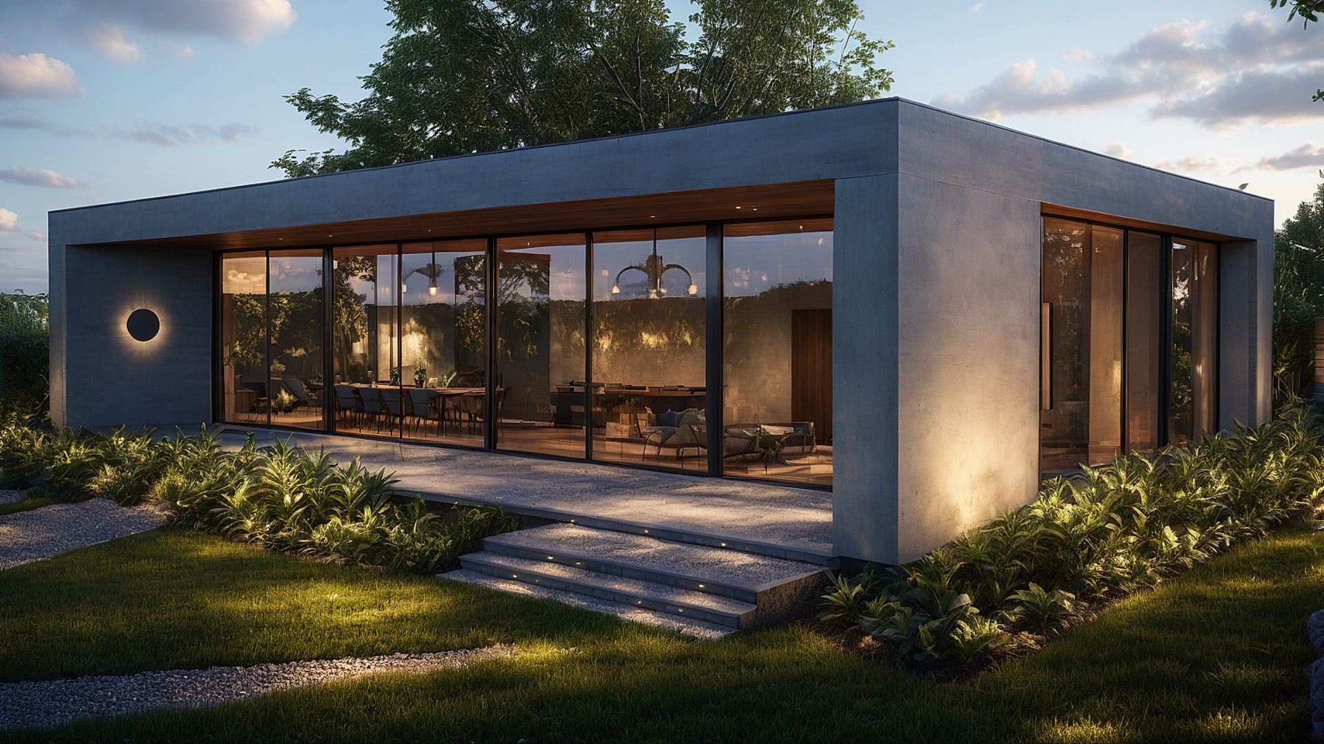 A modern single-storey residence defined by clean lines, a flat roof, and a smooth grey exterior finish. Full-height glass panels open the interior visually to the outdoors, revealing a warm dining and lounge setup that contrasts with the cool, minimal façade. Soft landscape layers, subtle step lighting, and a recessed entrance add depth while keeping the overall design calm, elegant, and intentionally understated.
