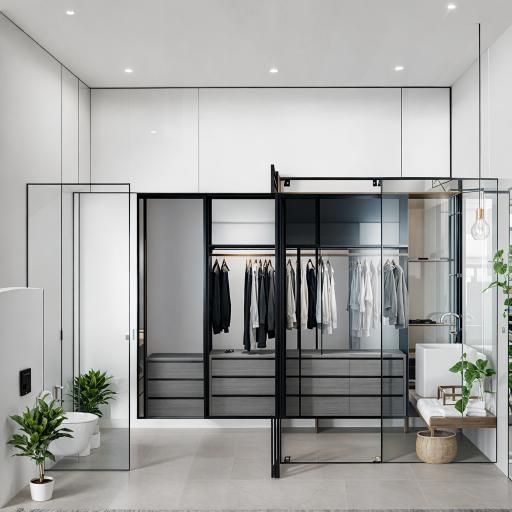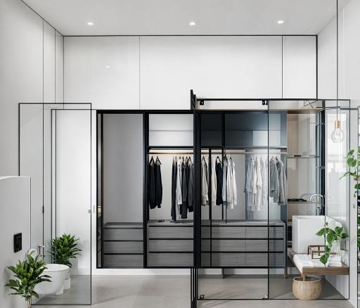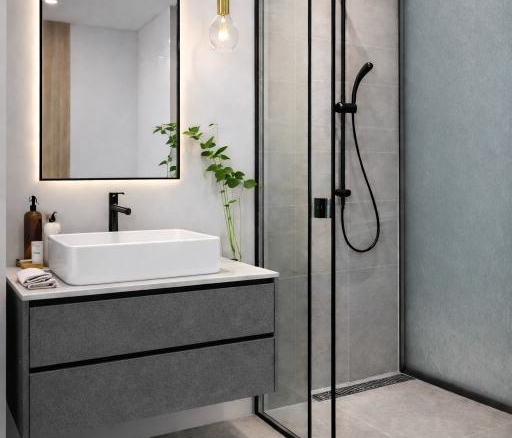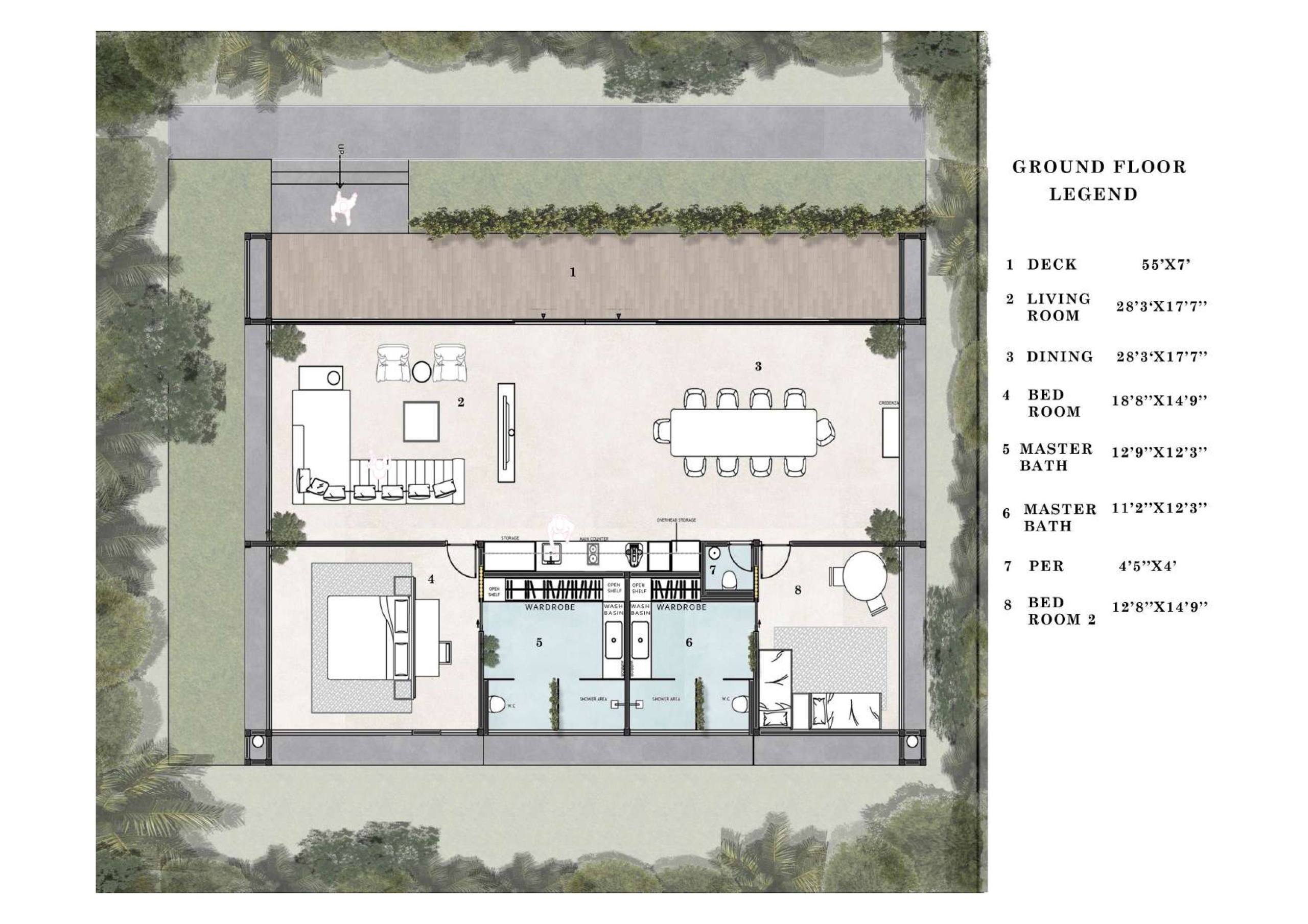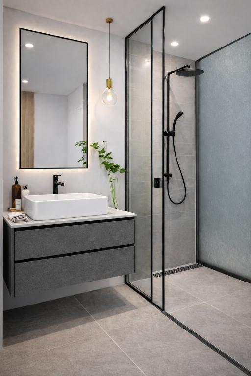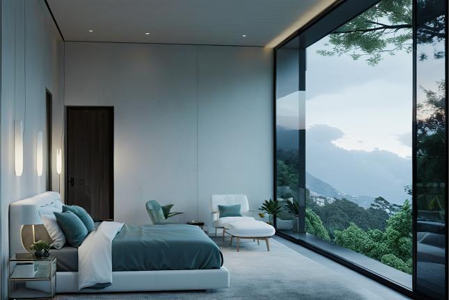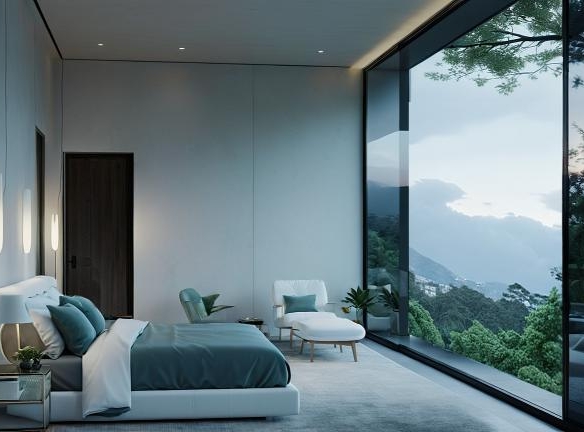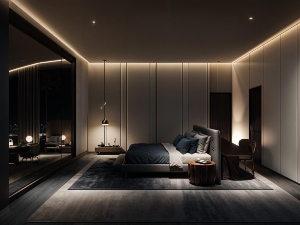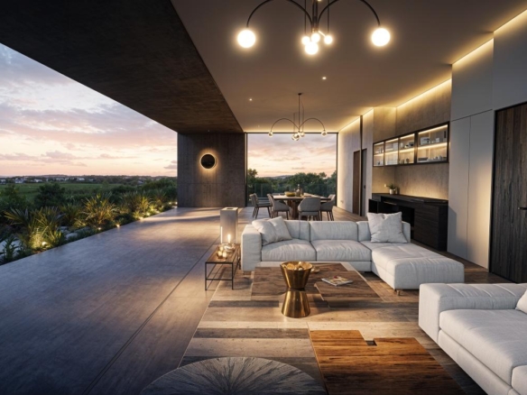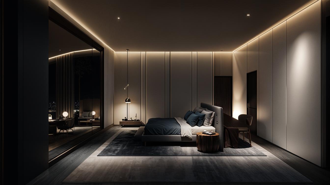 A modern single-storey residence defined by clean lines, a flat roof, and a smooth grey exterior finish. Full-height glass panels open the interior visually to the outdoors, revealing a warm dining and lounge setup that contrasts with the cool, minimal façade. Soft landscape layers, subtle step lighting, and a recessed entrance add depth while keeping the overall design calm, elegant, and intentionally understated.
