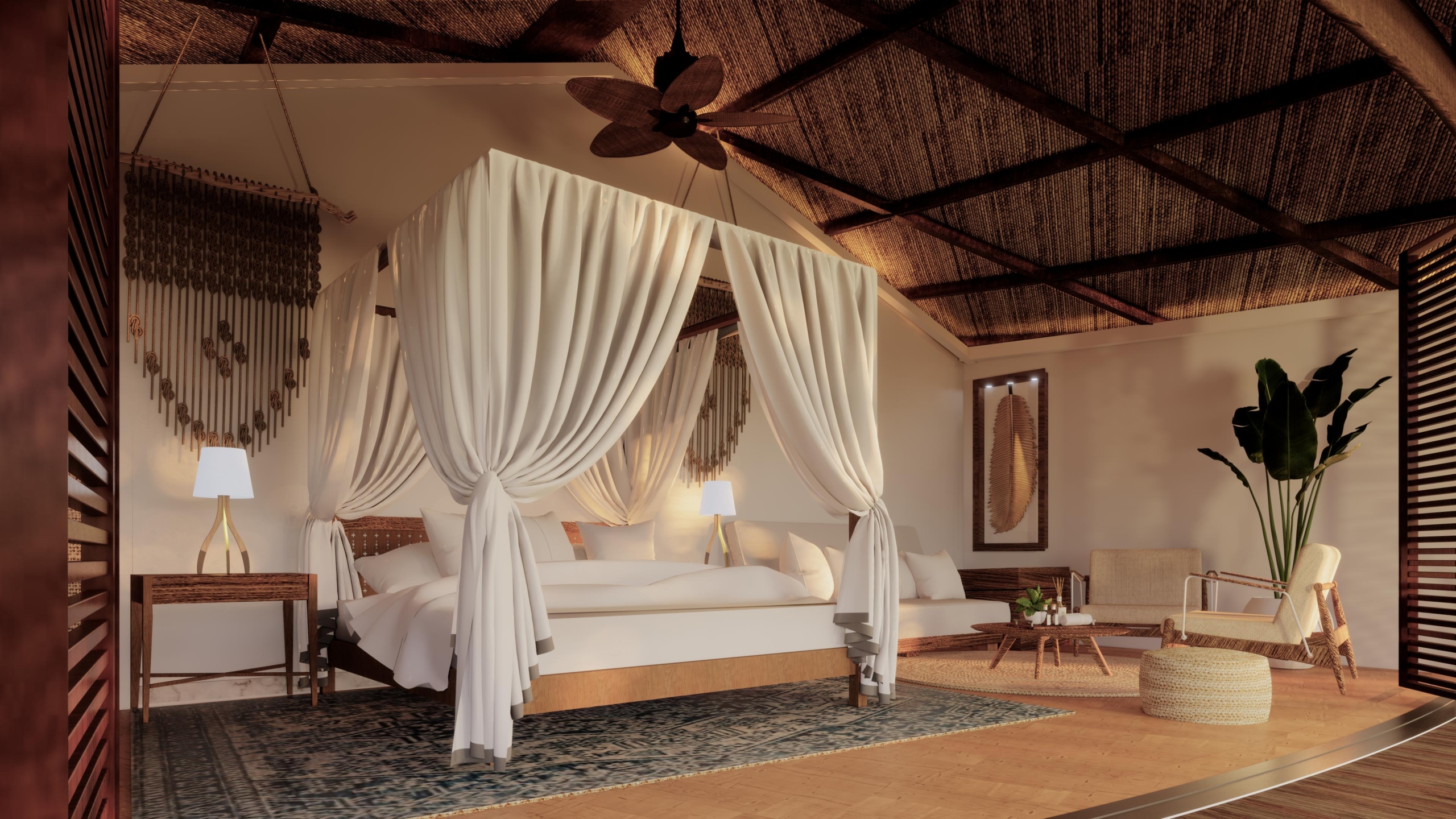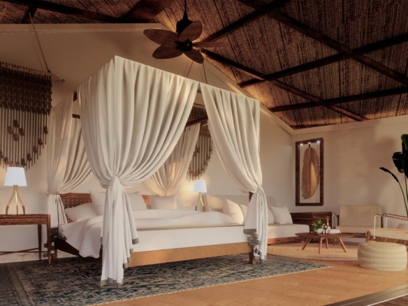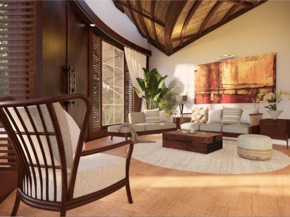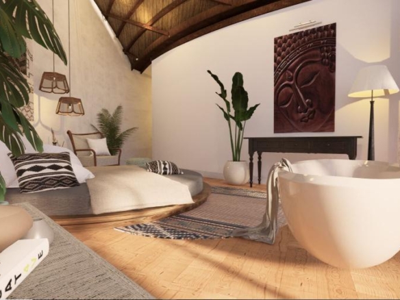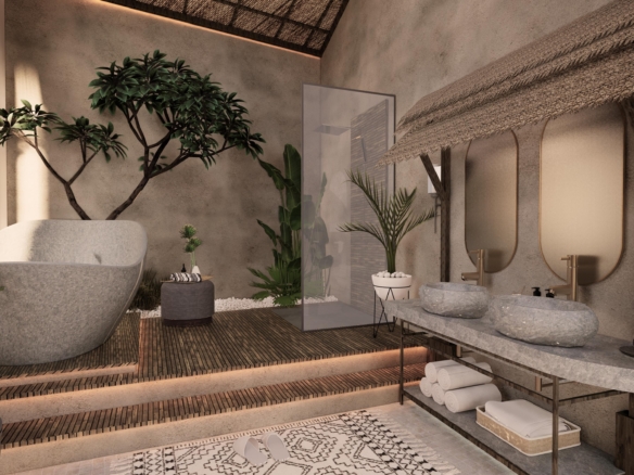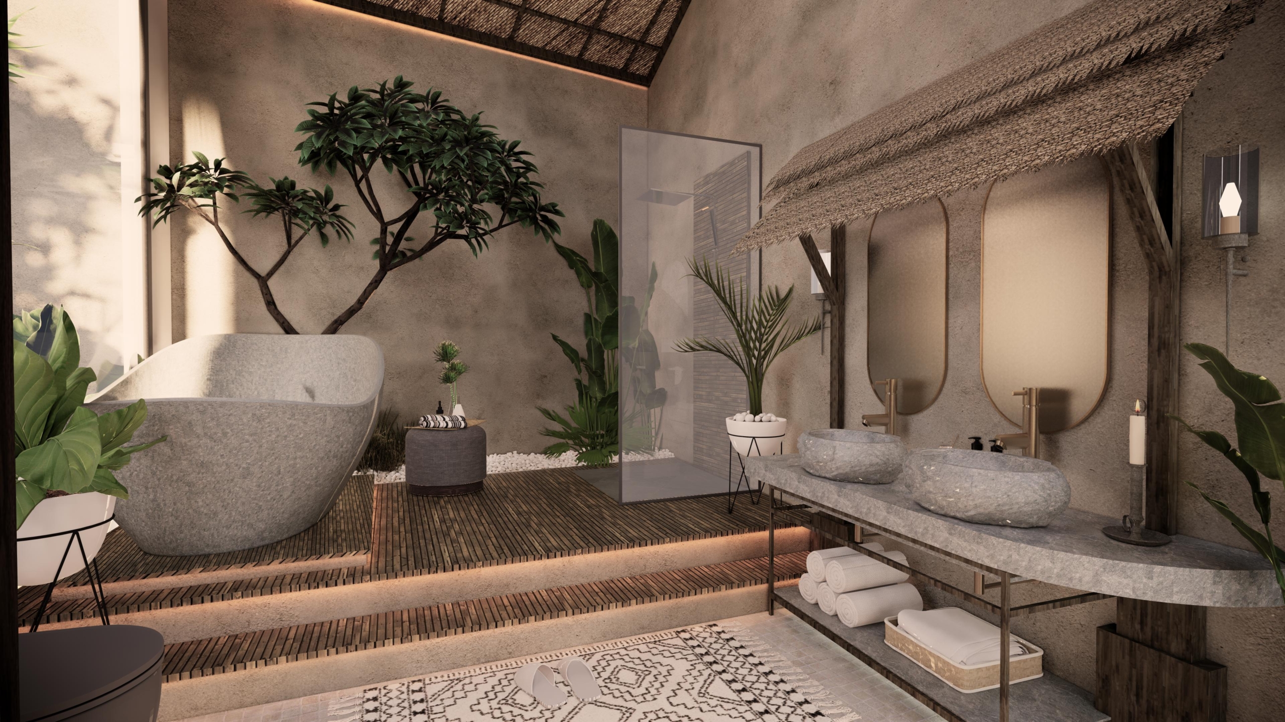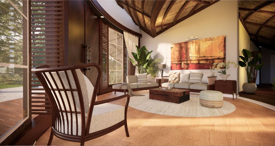 Pristine white walls create a beautiful contrast with the wooden and stone accents, breathing luxury into the villa. The soft upholstery and indoor plants softly complement the natural, raw interior finishes.