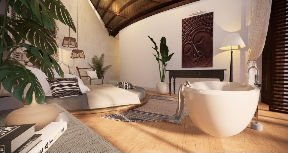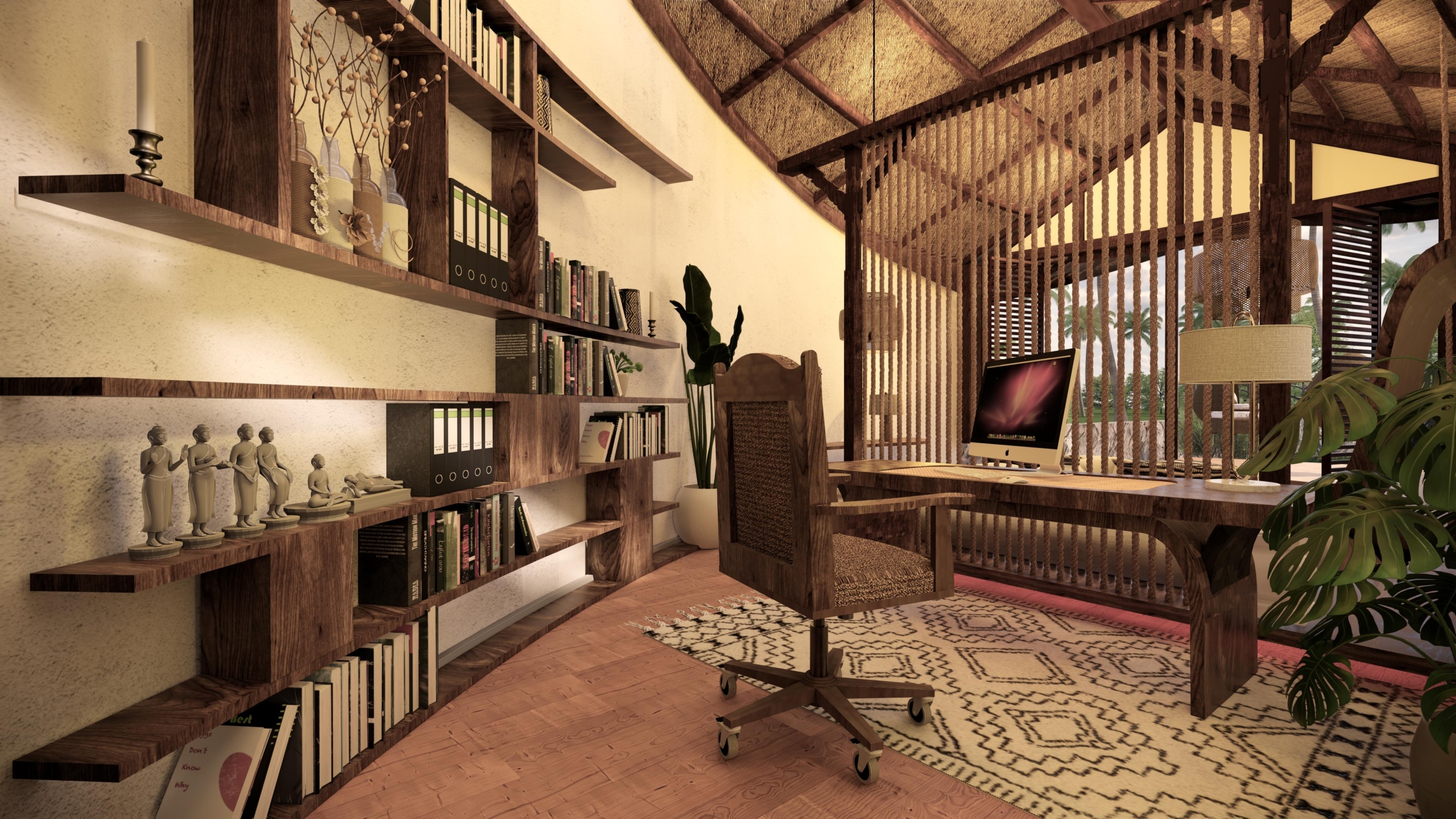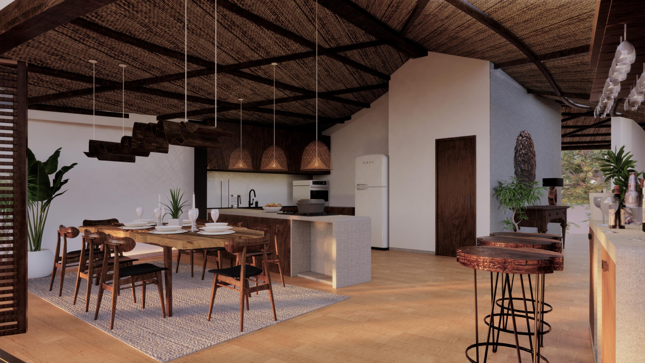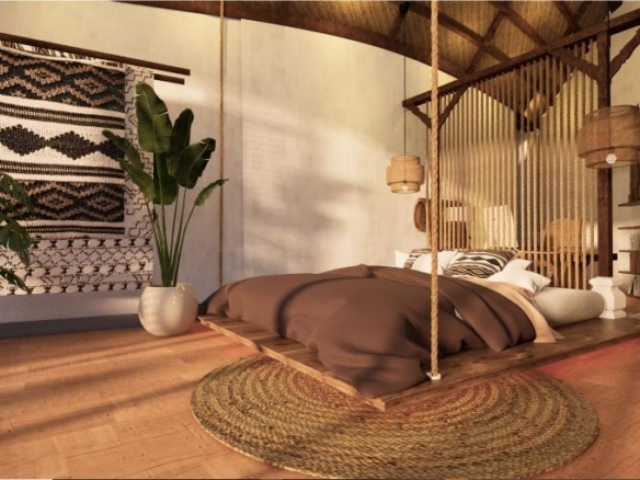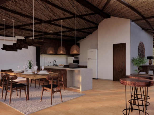 Pristine white walls create a beautiful contrast with the wooden and stone accents, breathing luxury into the villa. The soft upholstery and indoor plants softly complement the natural, raw interior finishes.