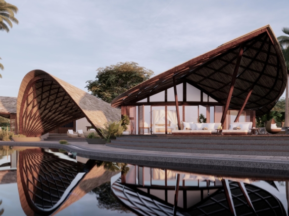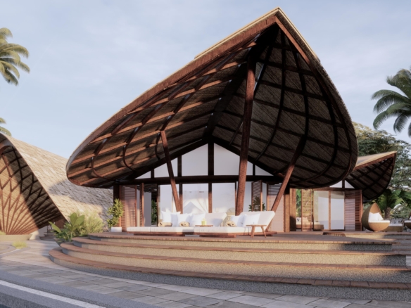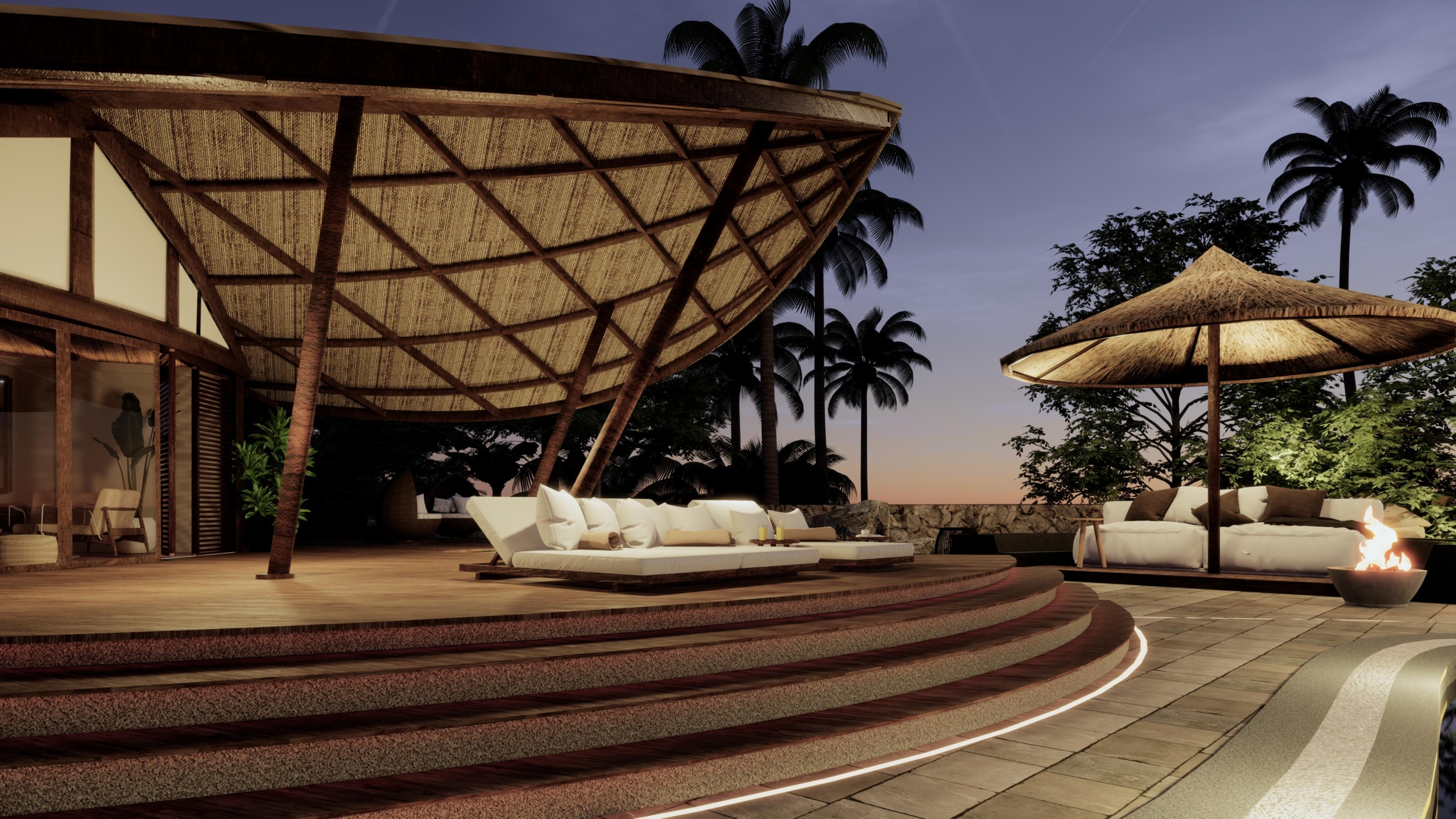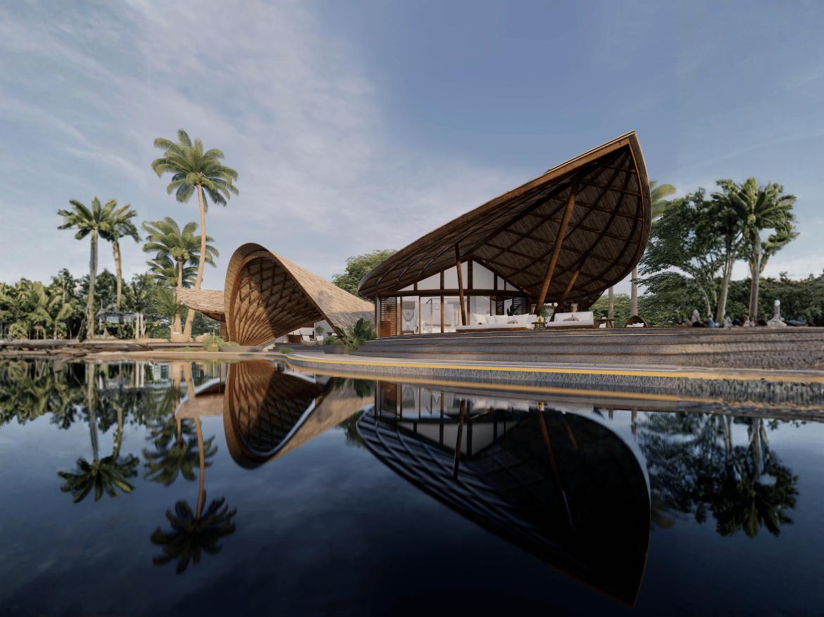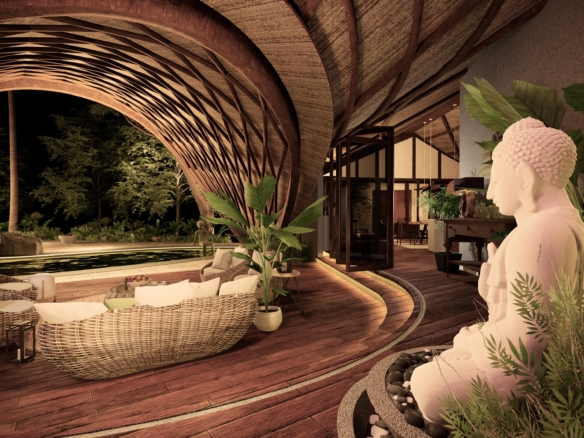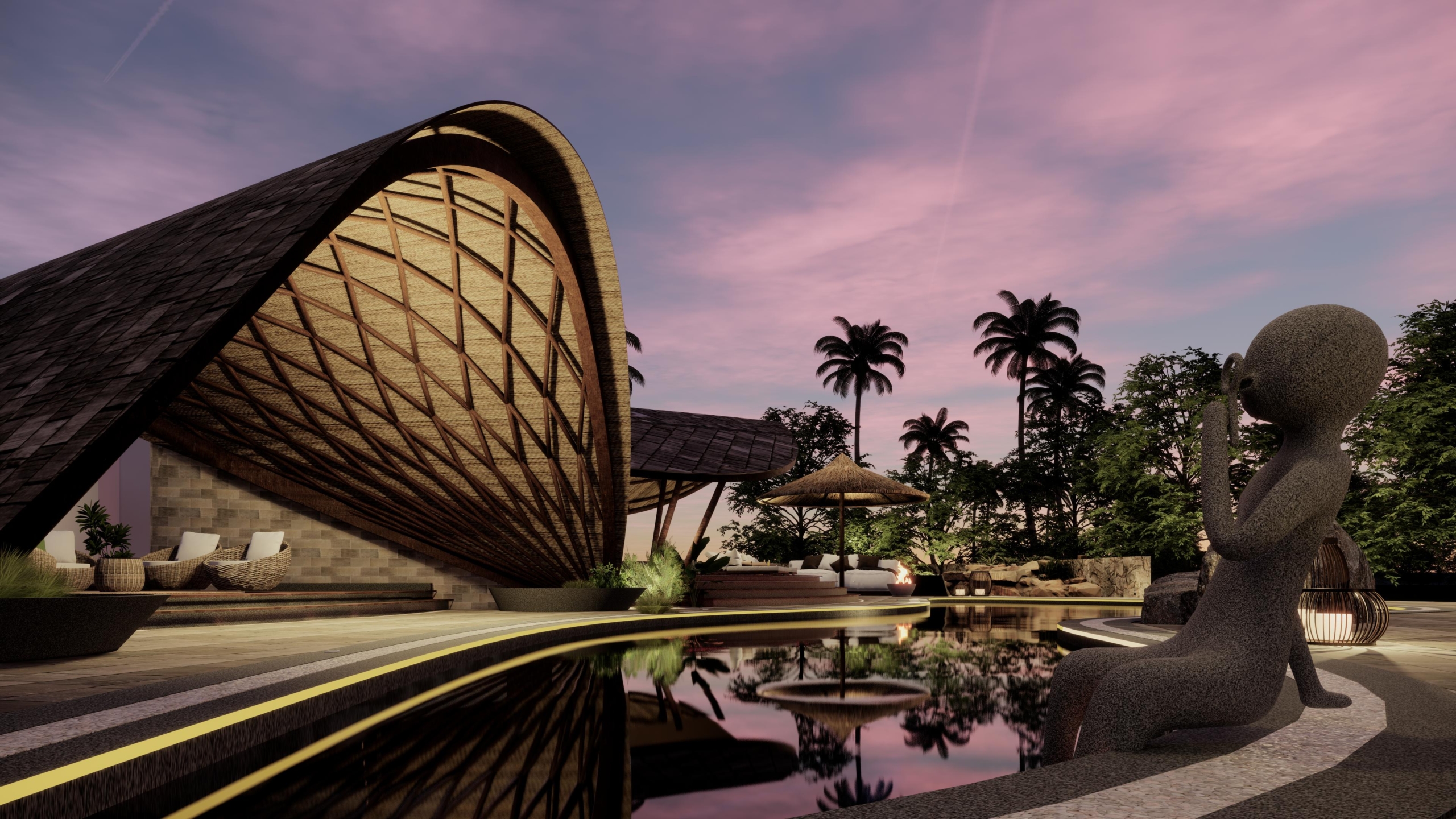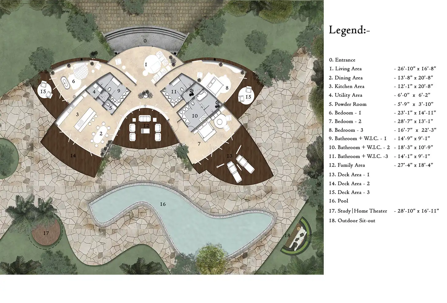 the design principles used in traditional Balinese architecture. Spatially planned on the ‘tri mandala’ philosophy of ancient Bali, a sprawling open pavilion heralds visitors into the 500 Sq.ft. living area. Indoor courtyards and tropical foliage tucked into the pockets of the villa unify the home with nature. Exquisite decks for each bedroom, the alfresco shower experience, and the cosy dining area along the expansive swimming pool are a testimony to the indoor-outdoor living construct of a traditional Bali home. Taking clues from nature, the roof takes the form of a leaf. Large overhangs envelop the seating shacks on the semi-open deck, offering a quiet, meditative alcove with a sweeping view of the pool.