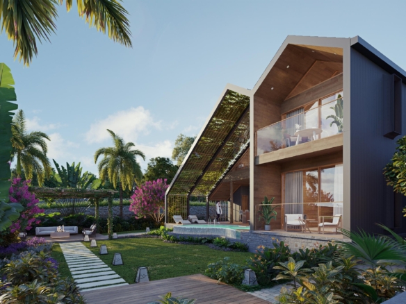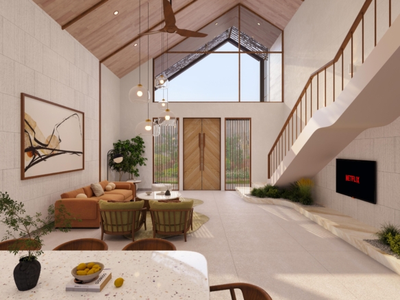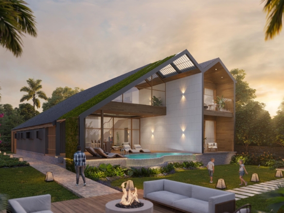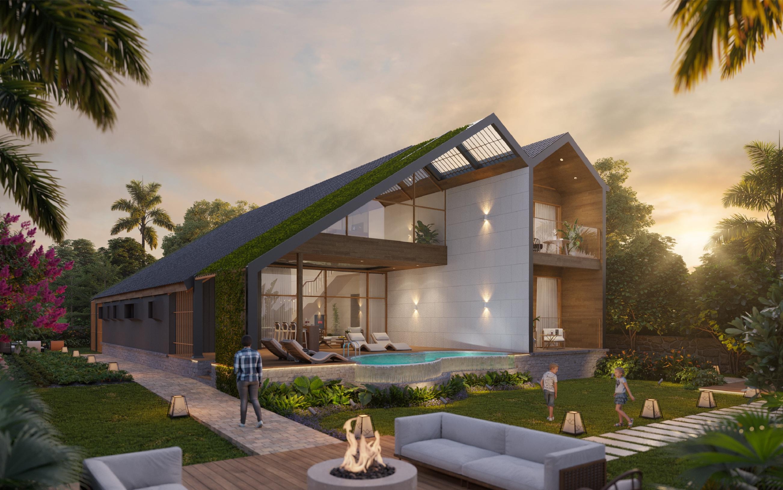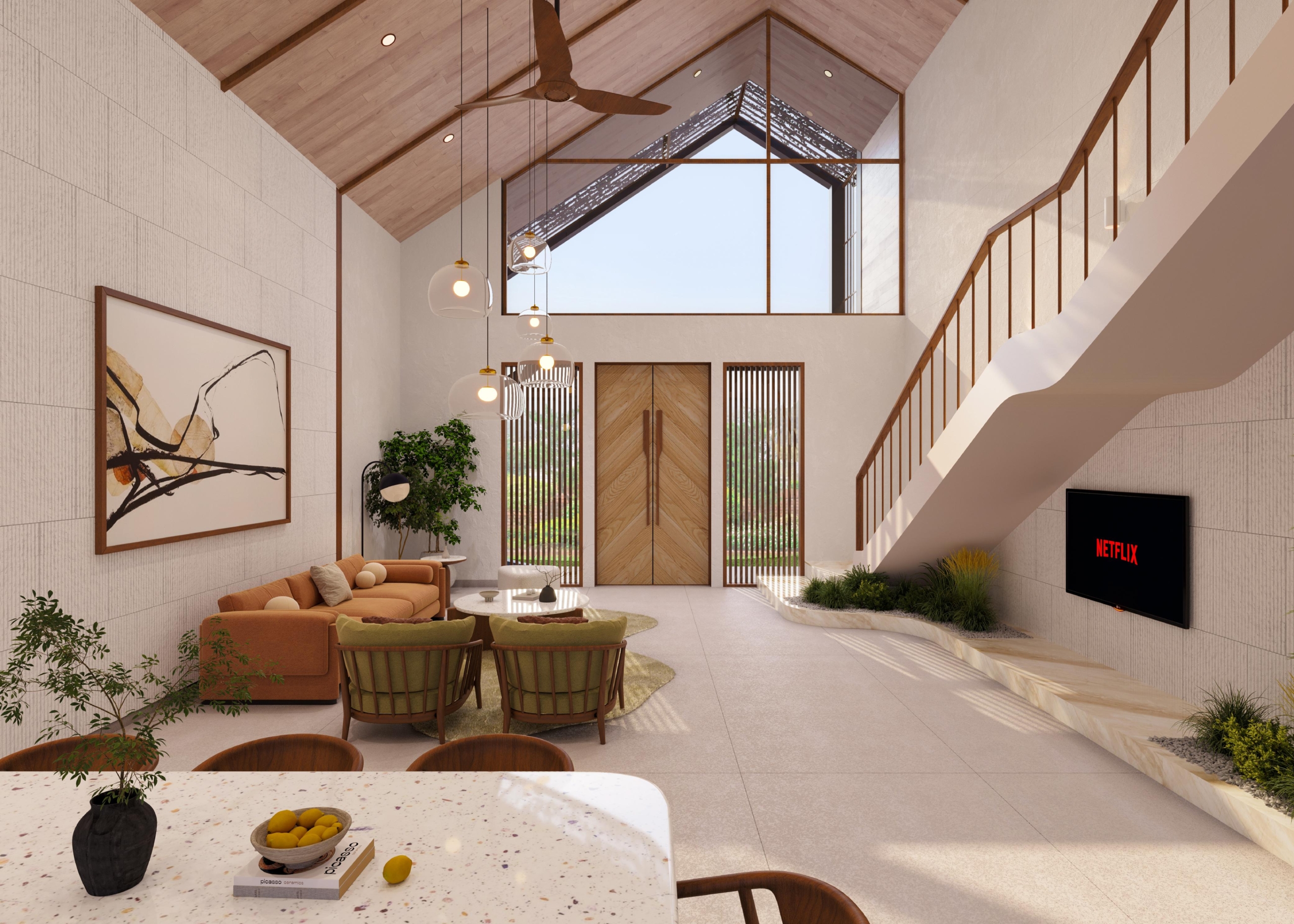 A modern tropical villa with bold sloping roofs, expansive glass façades, and a refined mix of wood, stone, and concrete. Double-height spaces and large openings flood the interiors with natural light, creating an airy, warm, and minimalist living experience. Lush landscaping, a private pool, and relaxed outdoor sit-outs complete this serene, resort-style retreat designed for luxury, privacy, and connection with nature.