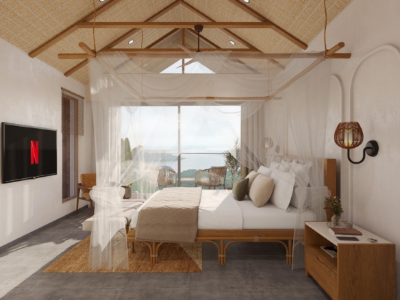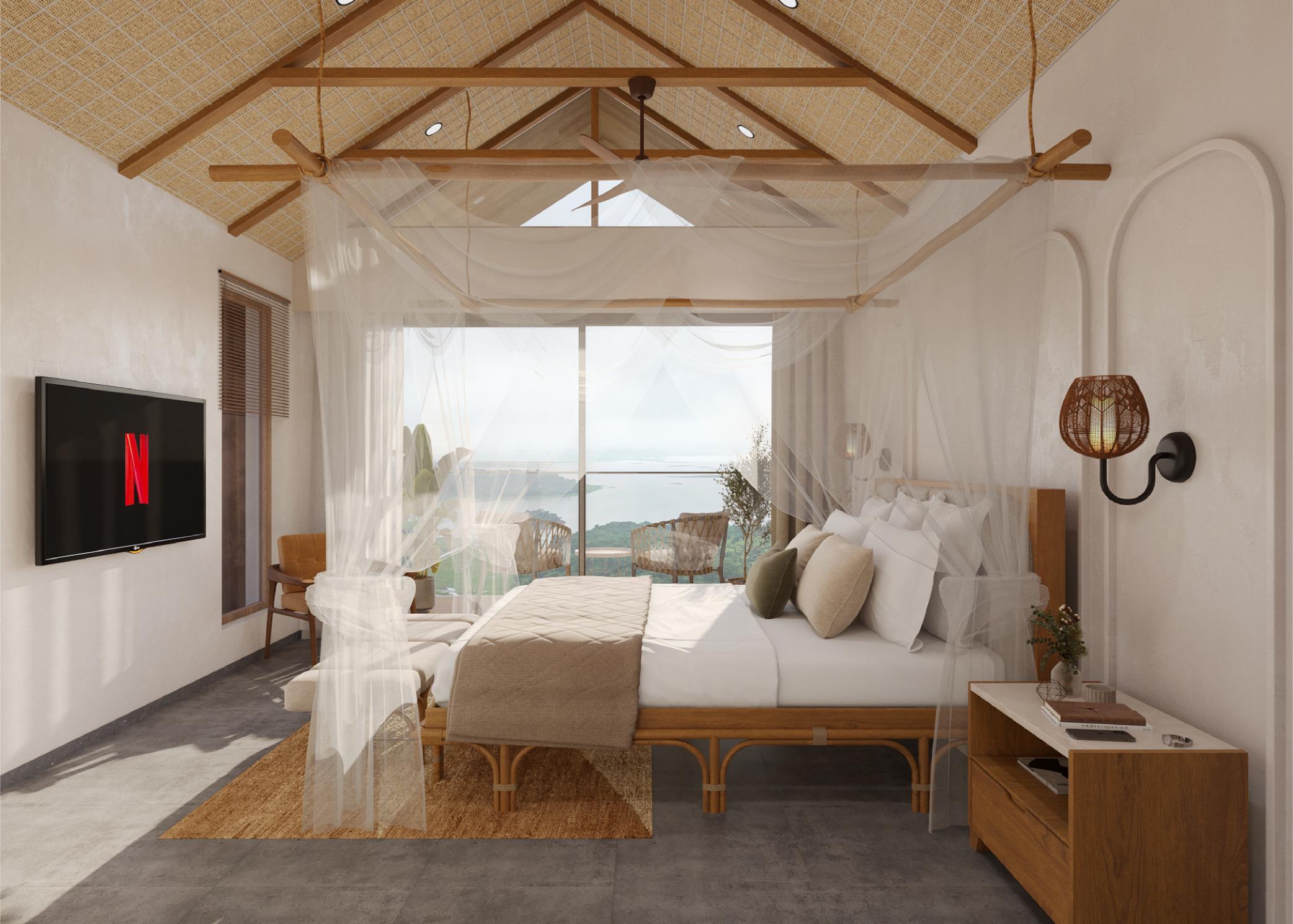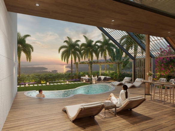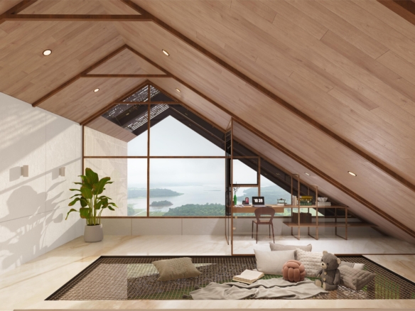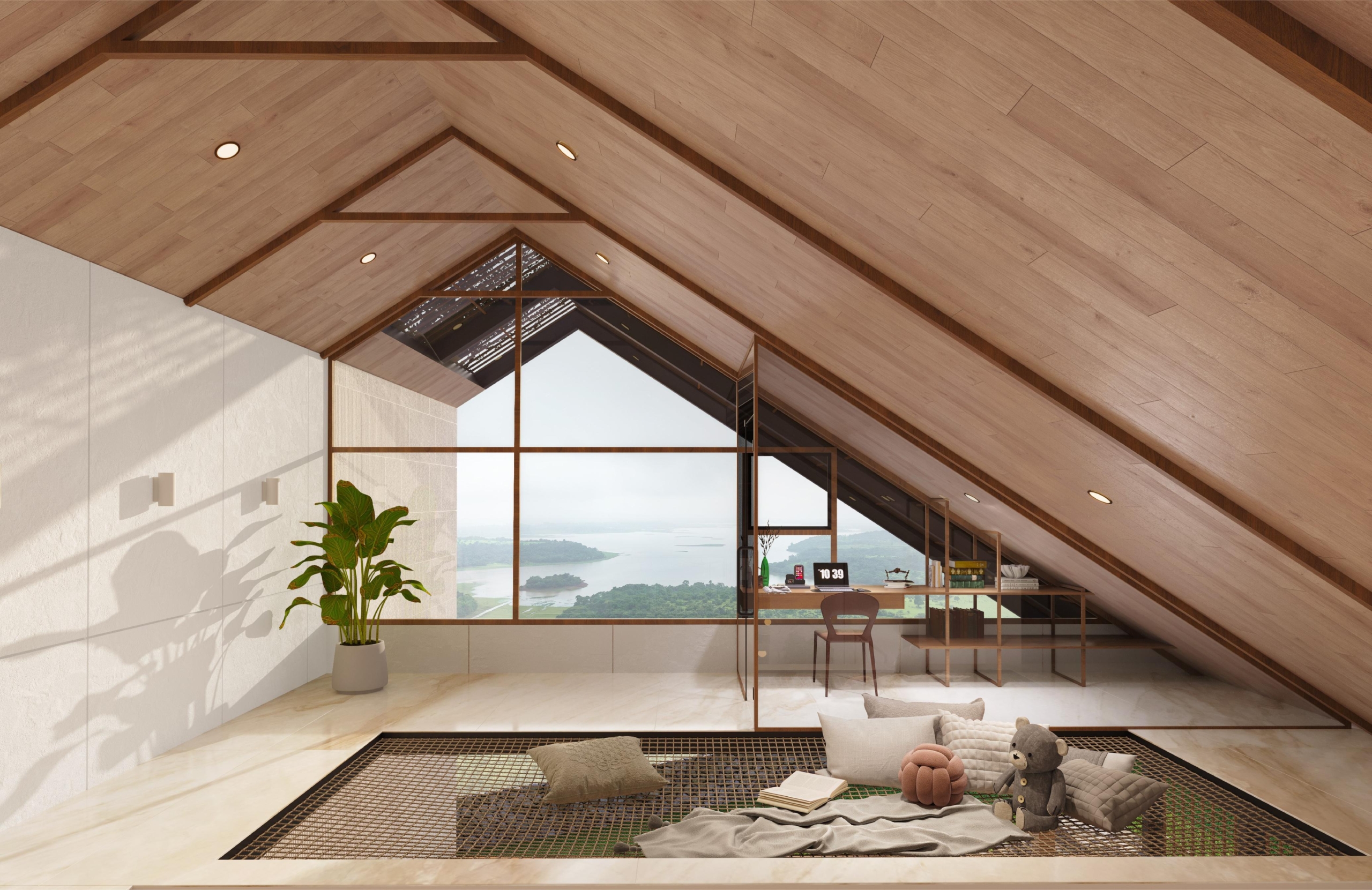 A modern tropical villa with bold sloping roofs, expansive glass façades, and a refined mix of wood, stone, and concrete. Double-height spaces and large openings flood the interiors with natural light, creating an airy, warm, and minimalist living experience. Lush landscaping, a private pool, and relaxed outdoor sit-outs complete this serene, resort-style retreat designed for luxury, privacy, and connection with nature.