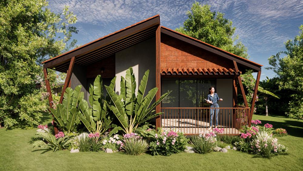 A modern tropical cottage designed to seamlessly connect indoor and outdoor living, featuring a sloped terracotta roof, natural textures, and lush landscaping. A cozy veranda and surrounding garden create a tranquil retreat rooted in comfort and harmony with nature.