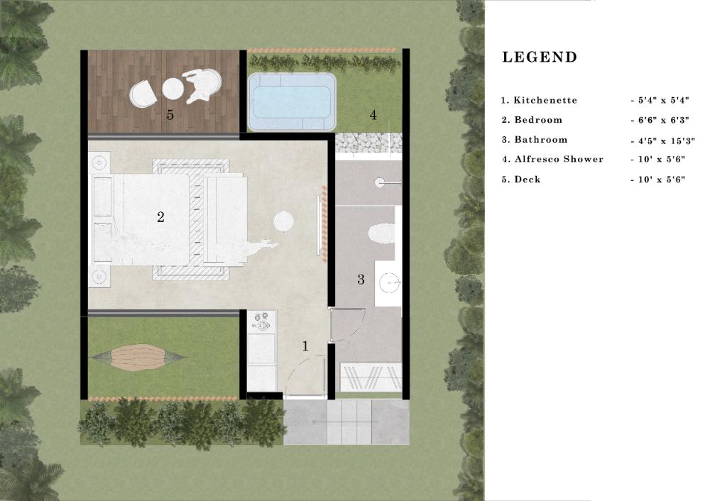 1 Kitchenette, 1 Bedroom, 1 Powder room, 01 Alfresco Shower, 1 Deck