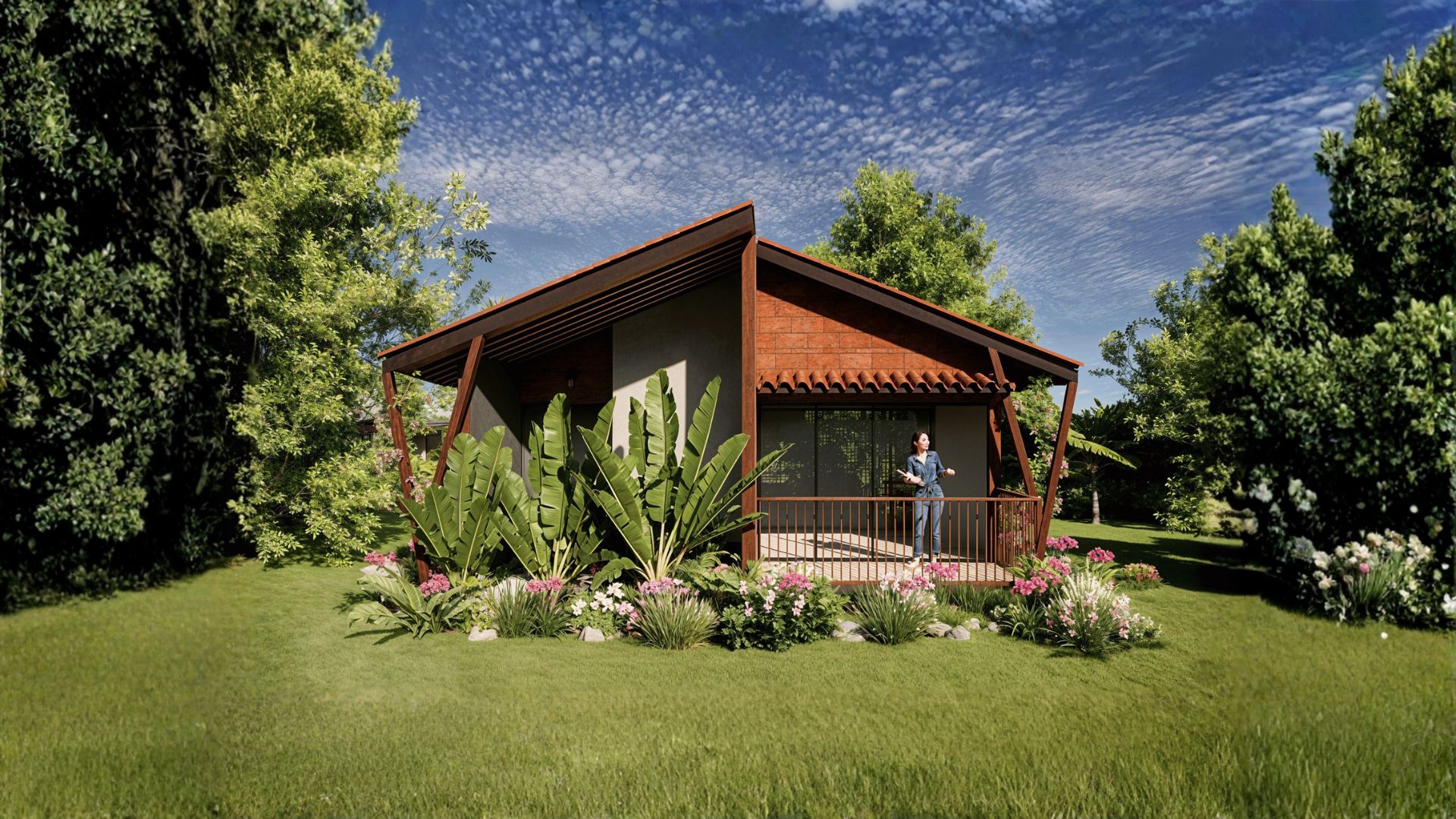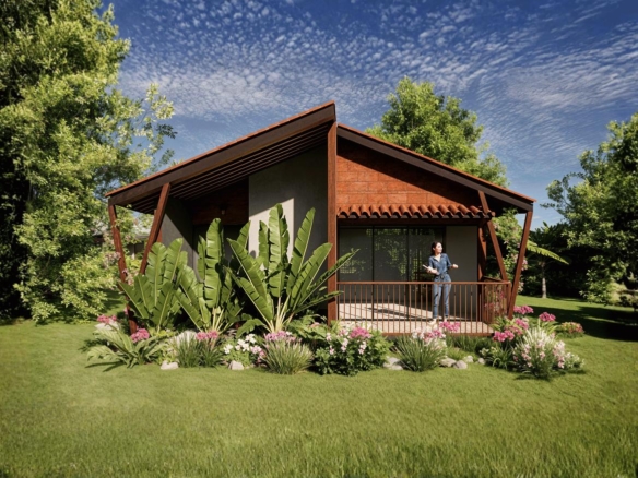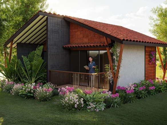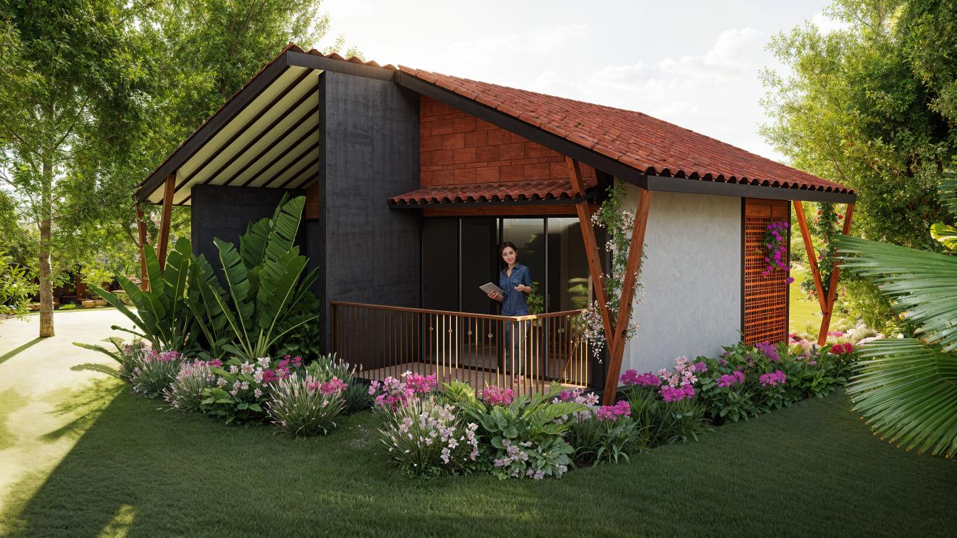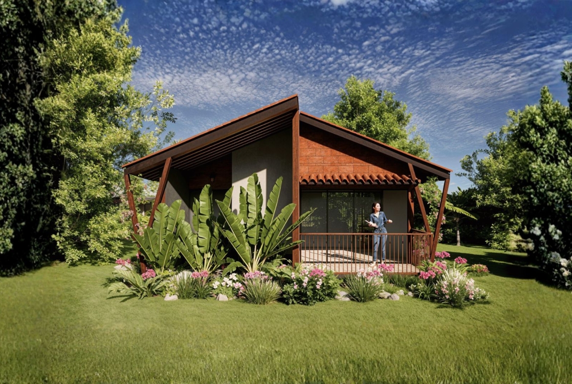 A modern tropical cottage designed to seamlessly connect indoor and outdoor living, featuring a sloped terracotta roof, natural textures, and lush landscaping. A cozy veranda and surrounding garden create a tranquil retreat rooted in comfort and harmony with nature.