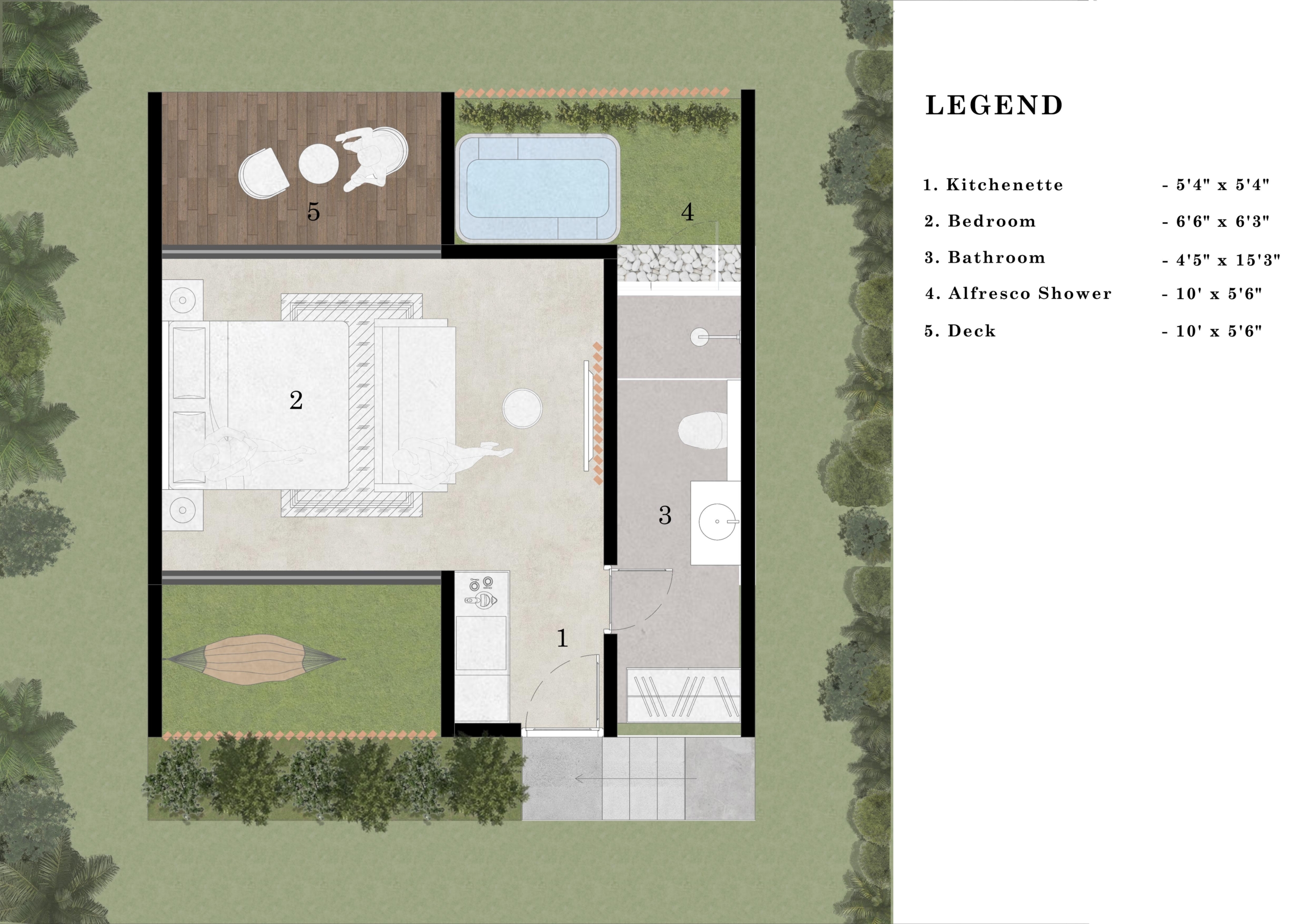 1 Kitchenette, 1 Bedroom, 1 Powder room, 01 Alfresco Shower, 1 Deck