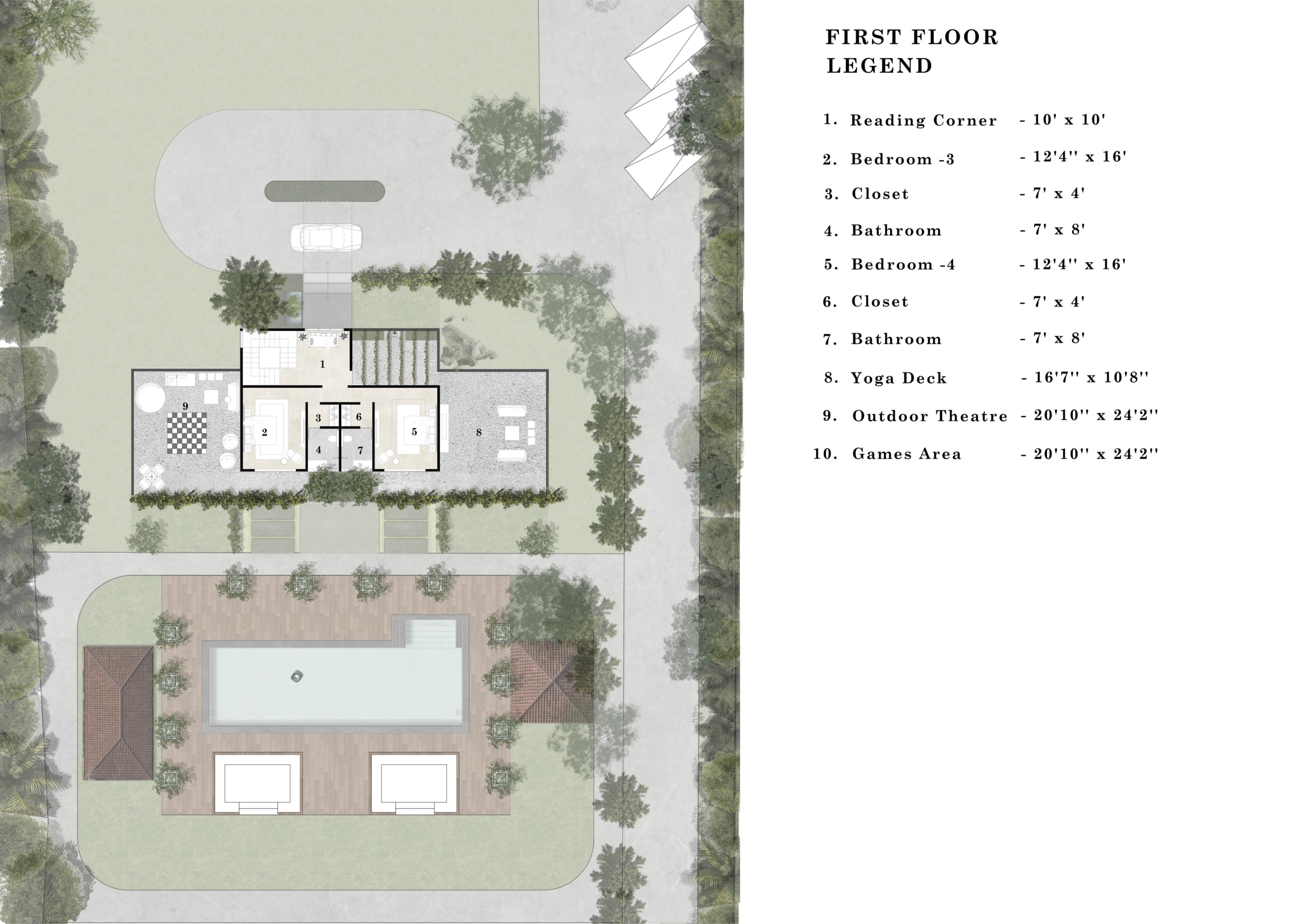 1 Foyer, 1Living room, 1 Kitchen, Dining, 1 Games area, 1 Yoga Deck, 1 Reading Area, 1 Sunken Seating, 4 Bedrooms, 5 Powder rooms, 1 Outdoor Theatre, 1 Pool(49’6″ x 15’5″)