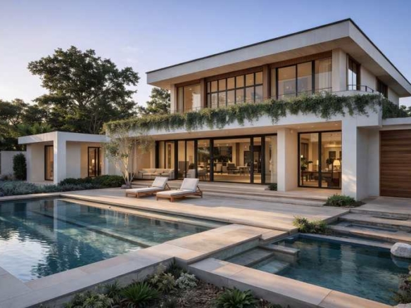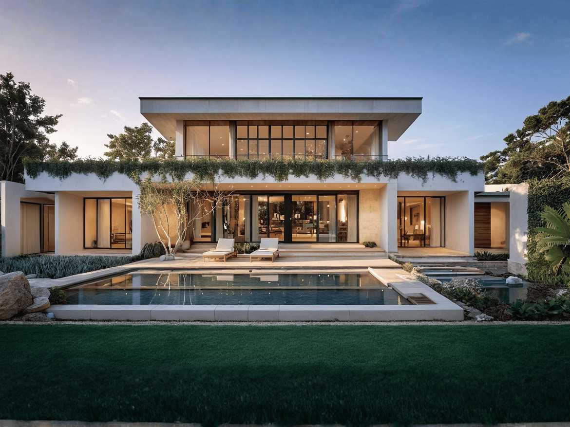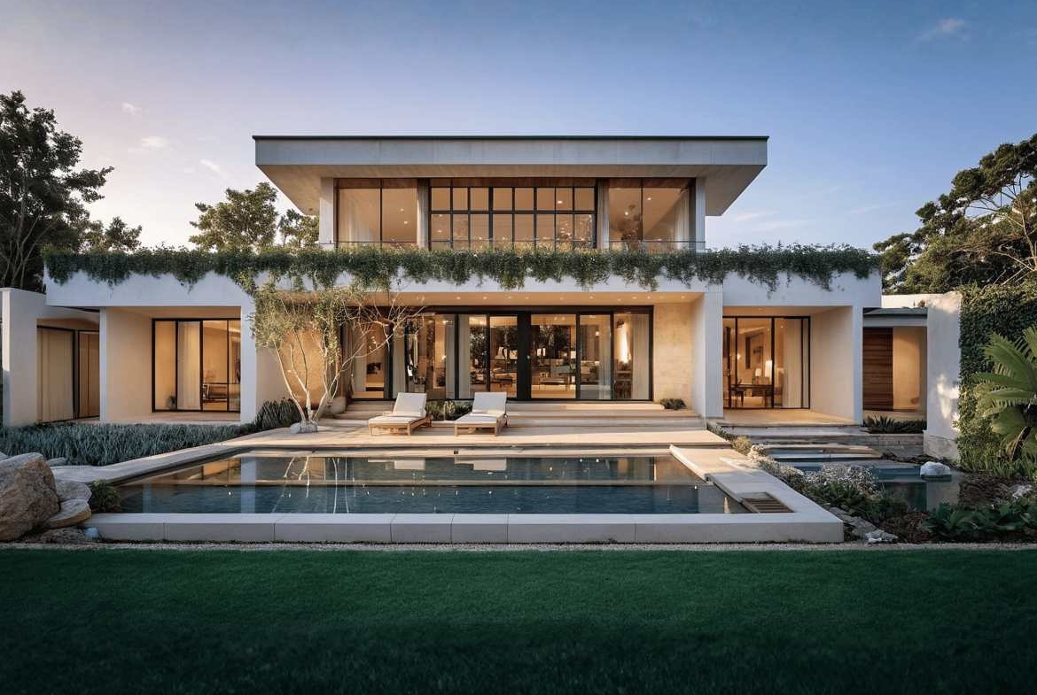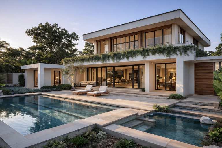 A modern luxury villa with a strong indoor–outdoor connection, featuring large glass openings, a balanced two-level layout, and a private pool set within lush landscaping. Designed for light, openness, and relaxed contemporary living.