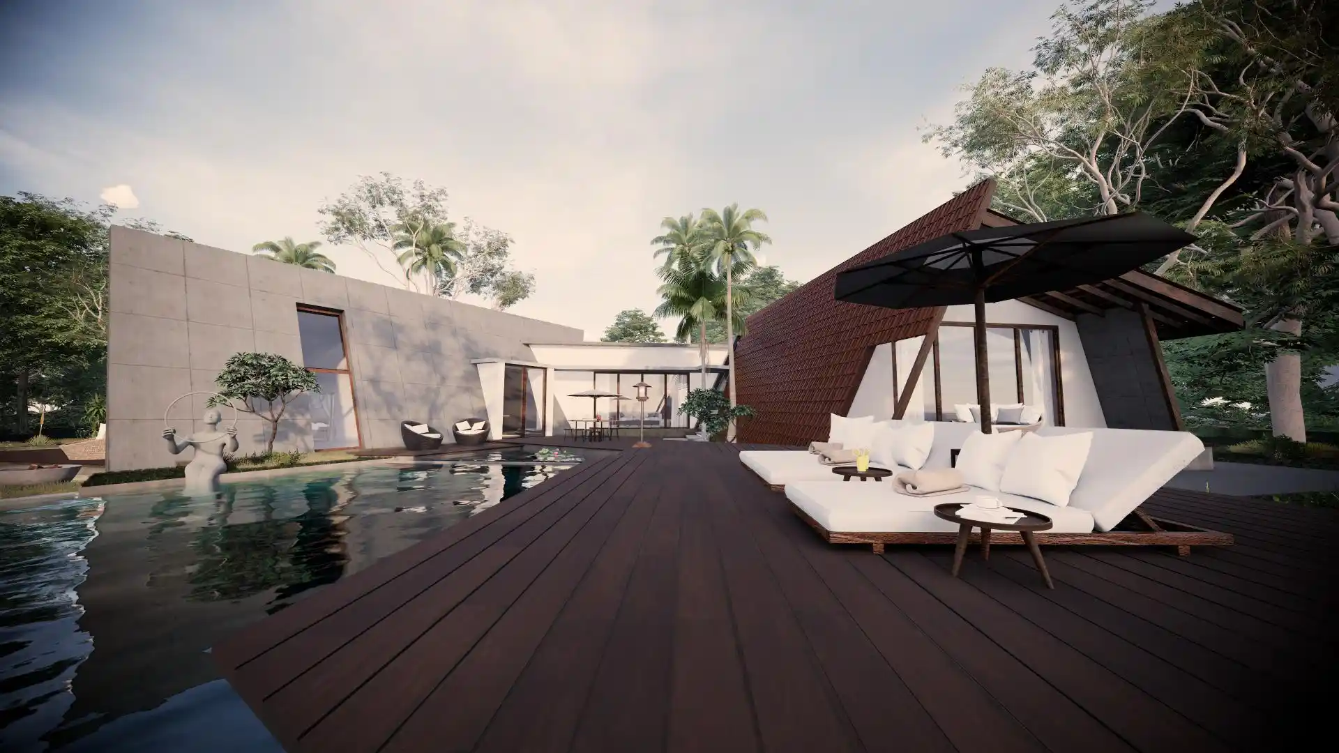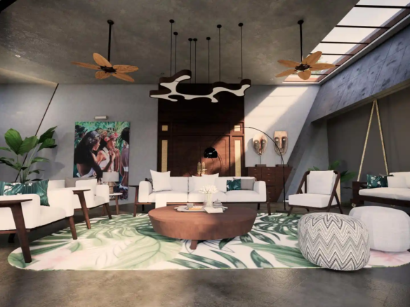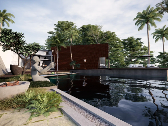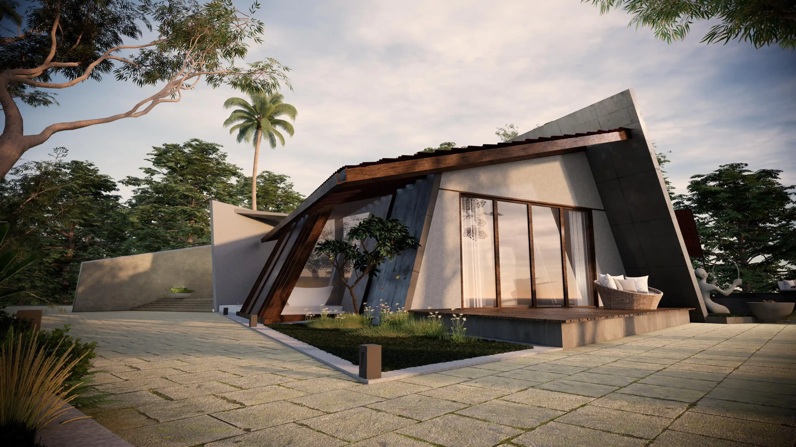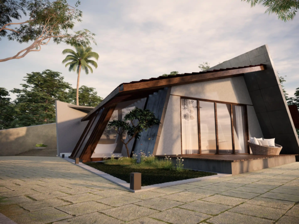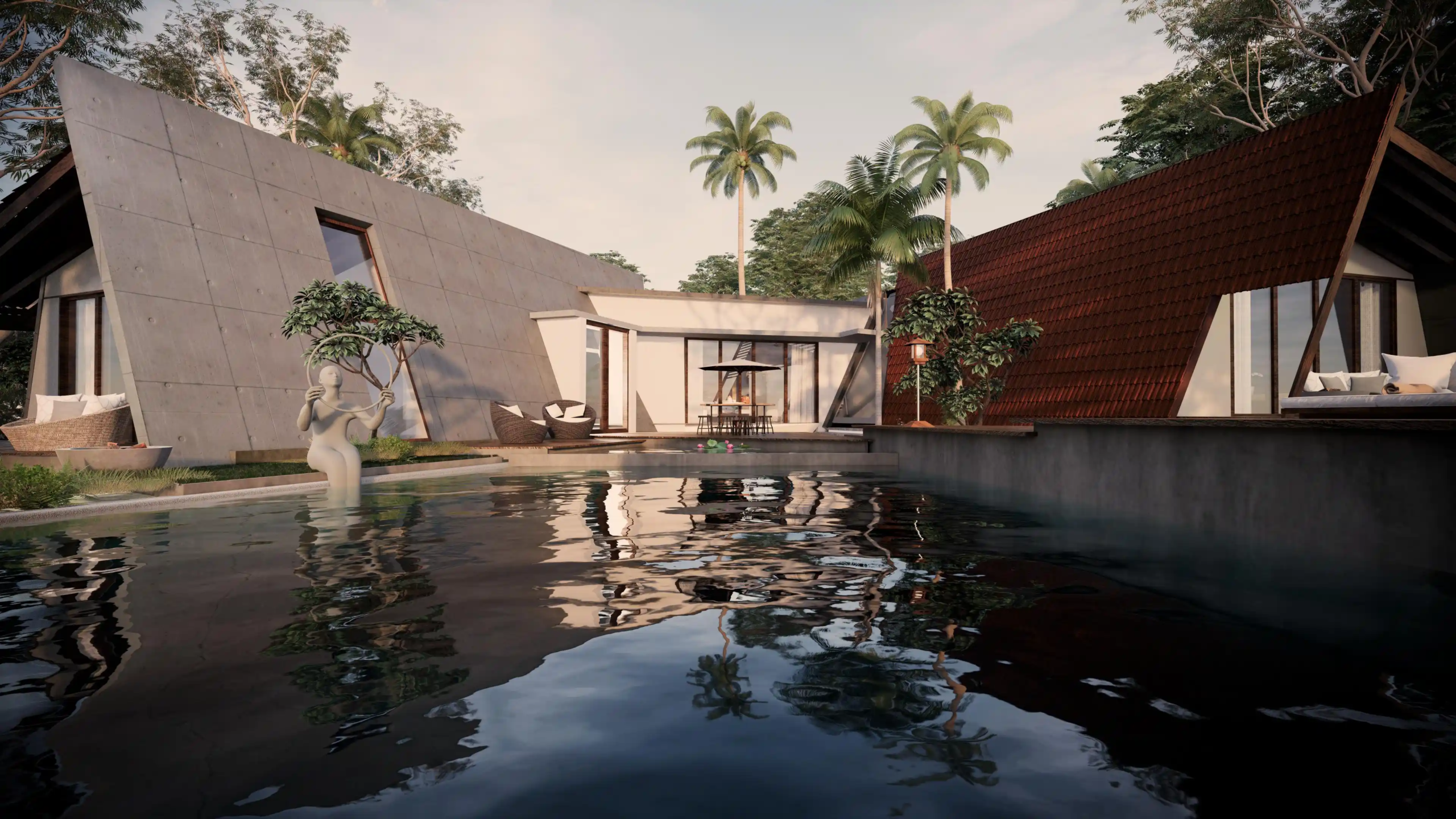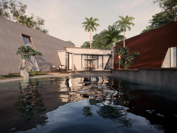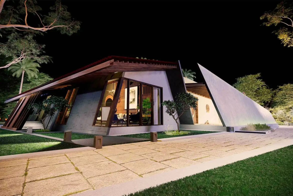 A modern take on the tropical home, the villa uses design elements, materials and finishes of Hawaiian architecture. Spread across 2760 Sq.ft. of area, this luxury abode is designed to evoke a sense of relaxation and excitement. Drawing inspiration from the sloping roofs of a typical Hawaiian villa, the terracotta-clad exterior walls make a bold statement. These walls are delicately juxtaposed with the wooden deck and concrete-finished walls, standing tall, like those of a sanctuary. A grand wooden door and muted walls greet visitors at the entrance, setting the tone of the villa – striking and luxurious. The double-height living room is flanked by the dining room and a bedroom on one side and two bedrooms on the other. During the day, the living room changes its moods as dramatic sun’s rays permeate the space through the skylight. The low-seating dining room by the pond is a nod to ‘ohana’, which means family, an inherent part of the Hawaiian culture. Overlooking the infinity pool, the outdoor dining area is a relaxing spot to enjoy a meal, while the expansive wooden deck is perfect for soaking up in the sun and appreciate the view. The raw, exposed interior finishes in the interiors in harmony with the exteriors blur the lines between the built and unbuilt, offering a connection of the outdoor with the villa. Contemporary on the first impression, the villa’s design has its roots in the island’s authentic architecture, history, and culture. A radical interpretation of the traditional Hawaiian villa, the design is sure to make heads turn.