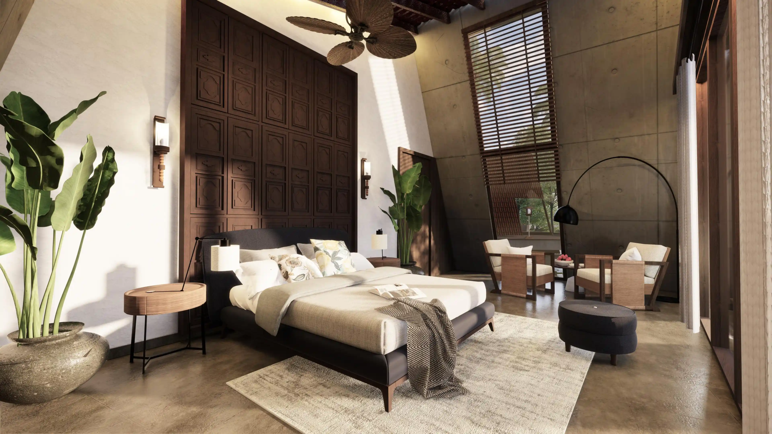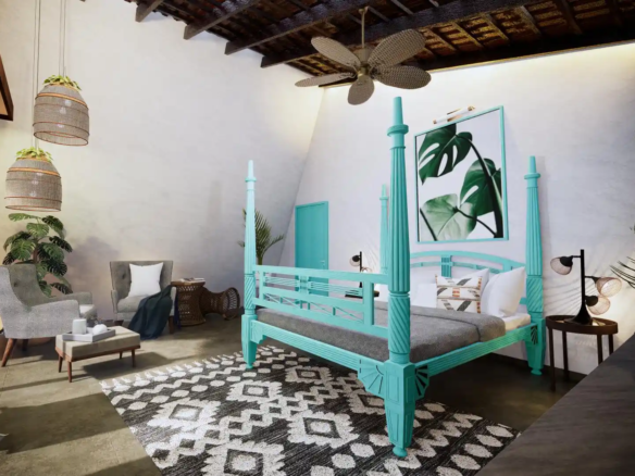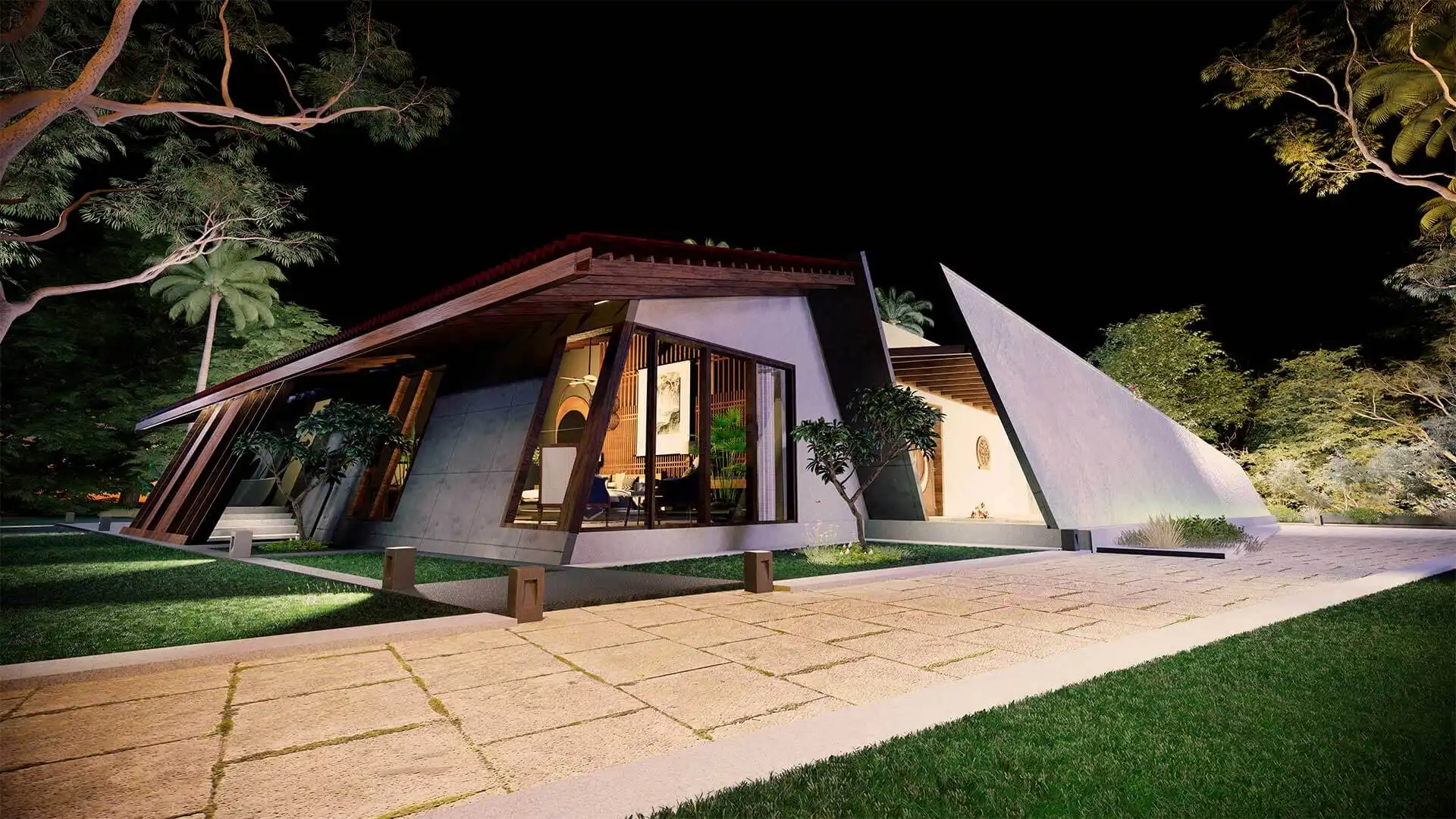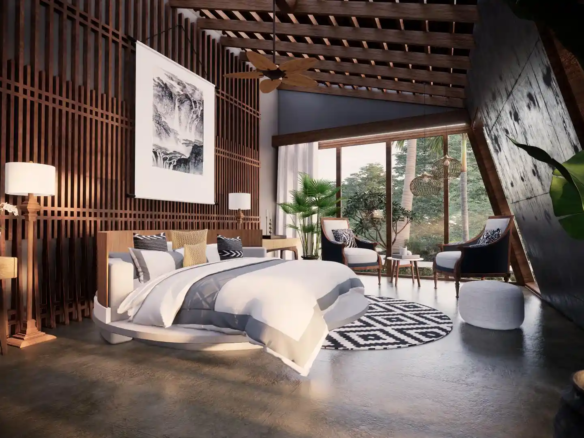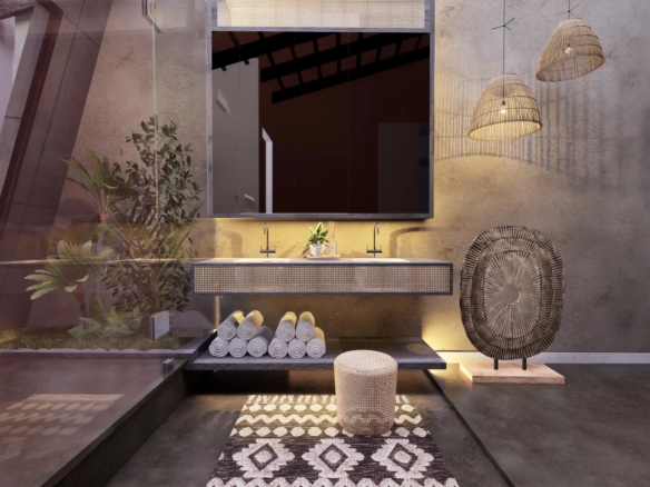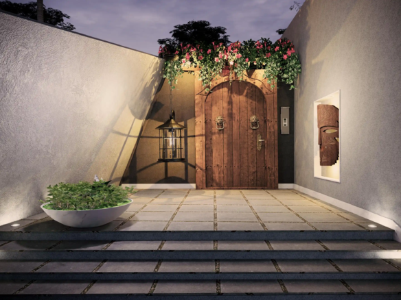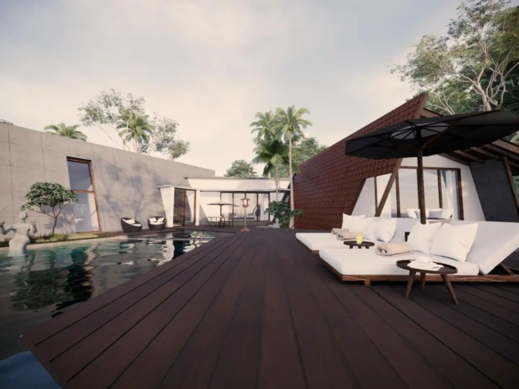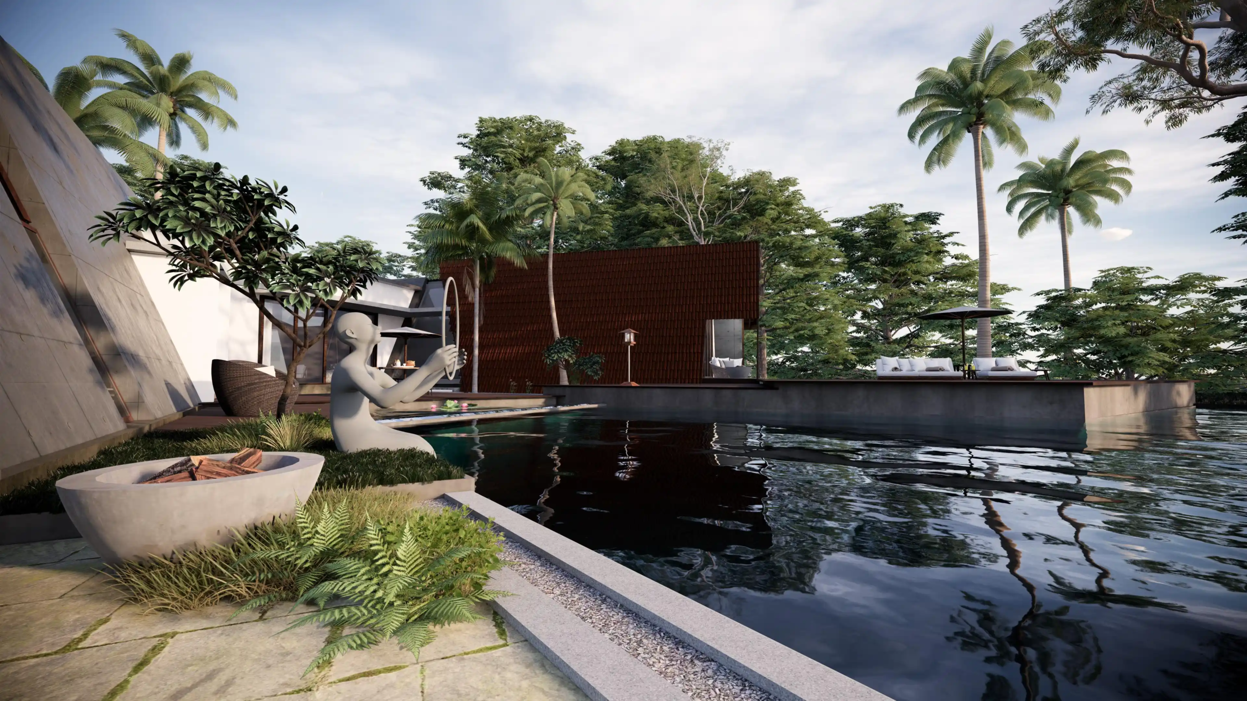 A modern take on the tropical home, the villa uses design elements, materials and finishes of Hawaiian architecture. Spread across 2760 Sq.ft. of area, this luxury abode is designed to evoke a sense of relaxation and excitement. Drawing inspiration from the sloping roofs of a typical Hawaiian villa, the terracotta-clad exterior walls make a bold statement. These walls are delicately juxtaposed with the wooden deck and concrete-finished walls, standing tall, like those of a sanctuary. A grand wooden door and muted walls greet visitors at the entrance, setting the tone of the villa – striking and luxurious. The double-height living room is flanked by the dining room and a bedroom on one side and two bedrooms on the other. During the day, the living room changes its moods as dramatic sun’s rays permeate the space through the skylight. The low-seating dining room by the pond is a nod to ‘ohana’, which means family, an inherent part of the Hawaiian culture. Overlooking the infinity pool, the outdoor dining area is a relaxing spot to enjoy a meal, while the expansive wooden deck is perfect for soaking up in the sun and appreciate the view. The raw, exposed interior finishes in the interiors in harmony with the exteriors blur the lines between the built and unbuilt, offering a connection of the outdoor with the villa. Contemporary on the first impression, the villa’s design has its roots in the island’s authentic architecture, history, and culture. A radical interpretation of the traditional Hawaiian villa, the design is sure to make heads turn.