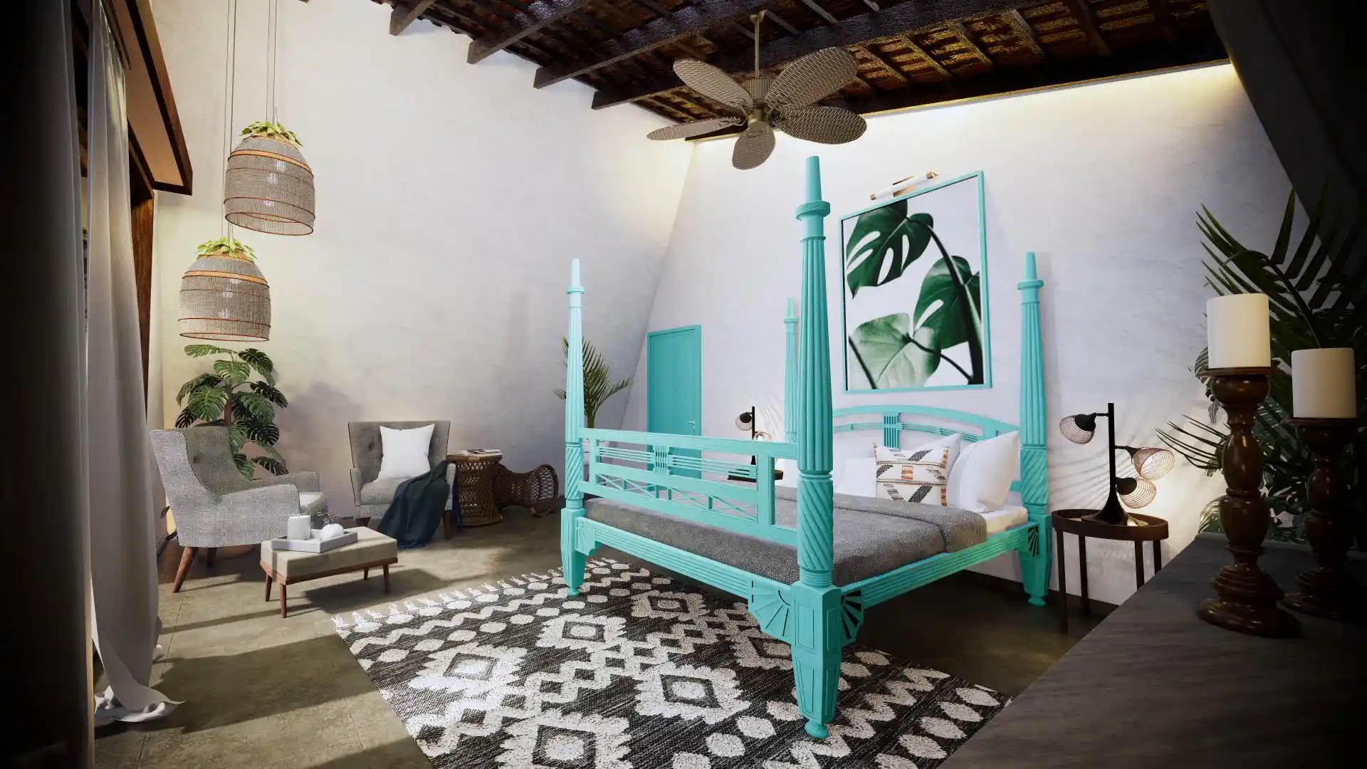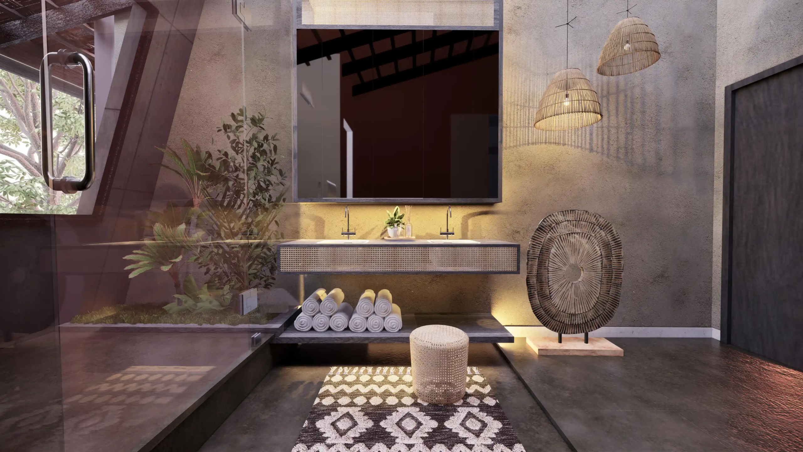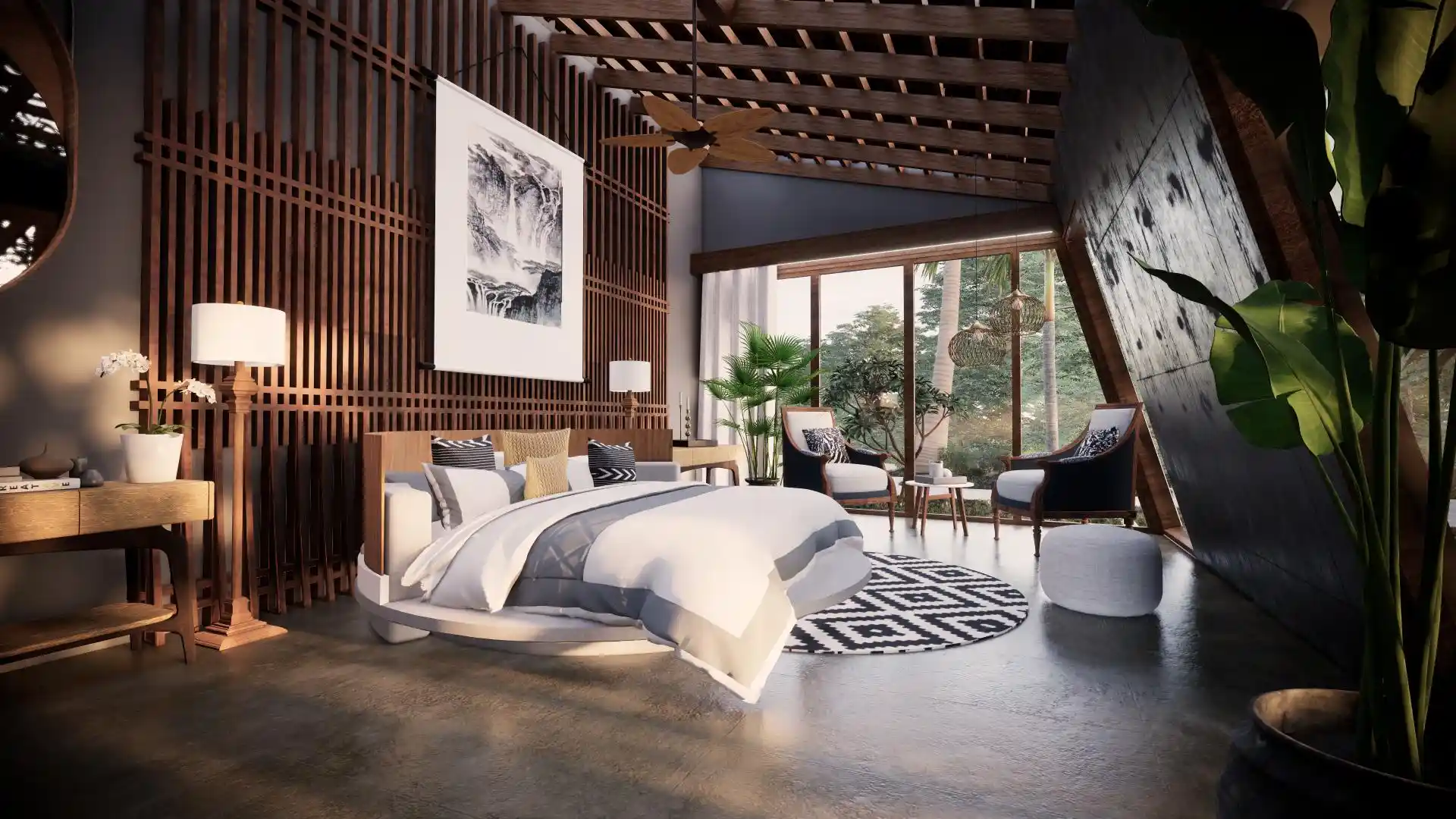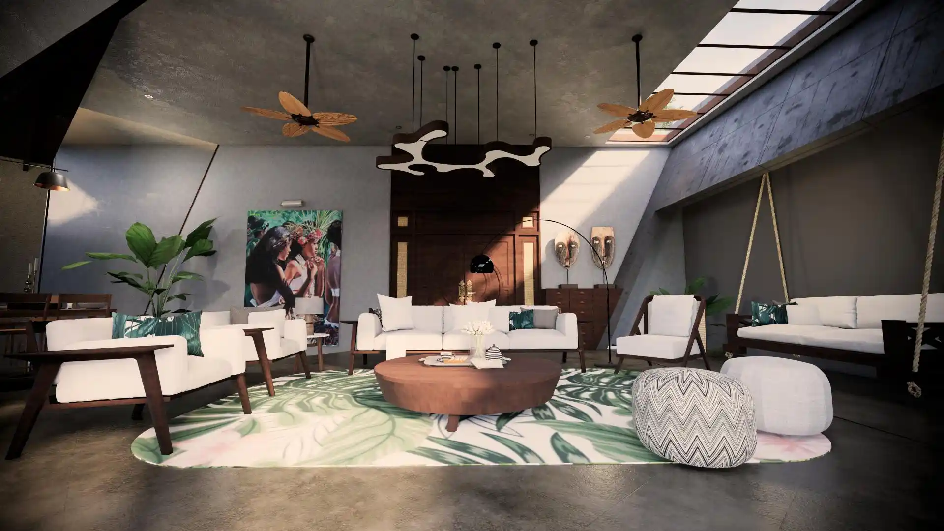 A modern take on the tropical home, the villa uses design elements, materials and finishes of Hawaiian architecture. Spread across 2760 Sq.ft. of area, this luxury abode is designed to evoke a sense of relaxation and excitement. Drawing inspiration from the sloping roofs of a typical Hawaiian villa, the terracotta-clad exterior walls make a bold statement. These walls are delicately juxtaposed with the wooden deck and concrete-finished walls, standing tall, like those of a sanctuary. A grand wooden door and muted walls greet visitors at the entrance, setting the tone of the villa – striking and luxurious. The double-height living room is flanked by the dining room and a bedroom on one side and two bedrooms on the other. During the day, the living room changes its moods as dramatic sun’s rays permeate the space through the skylight. The low-seating dining room by the pond is a nod to ‘ohana’, which means family, an inherent part of the Hawaiian culture. Overlooking the infinity pool, the outdoor dining area is a relaxing spot to enjoy a meal, while the expansive wooden deck is perfect for soaking up in the sun and appreciate the view. The raw, exposed interior finishes in the interiors in harmony with the exteriors blur the lines between the built and unbuilt, offering a connection of the outdoor with the villa. Contemporary on the first impression, the villa’s design has its roots in the island’s authentic architecture, history, and culture. A radical interpretation of the traditional Hawaiian villa, the design is sure to make heads turn.