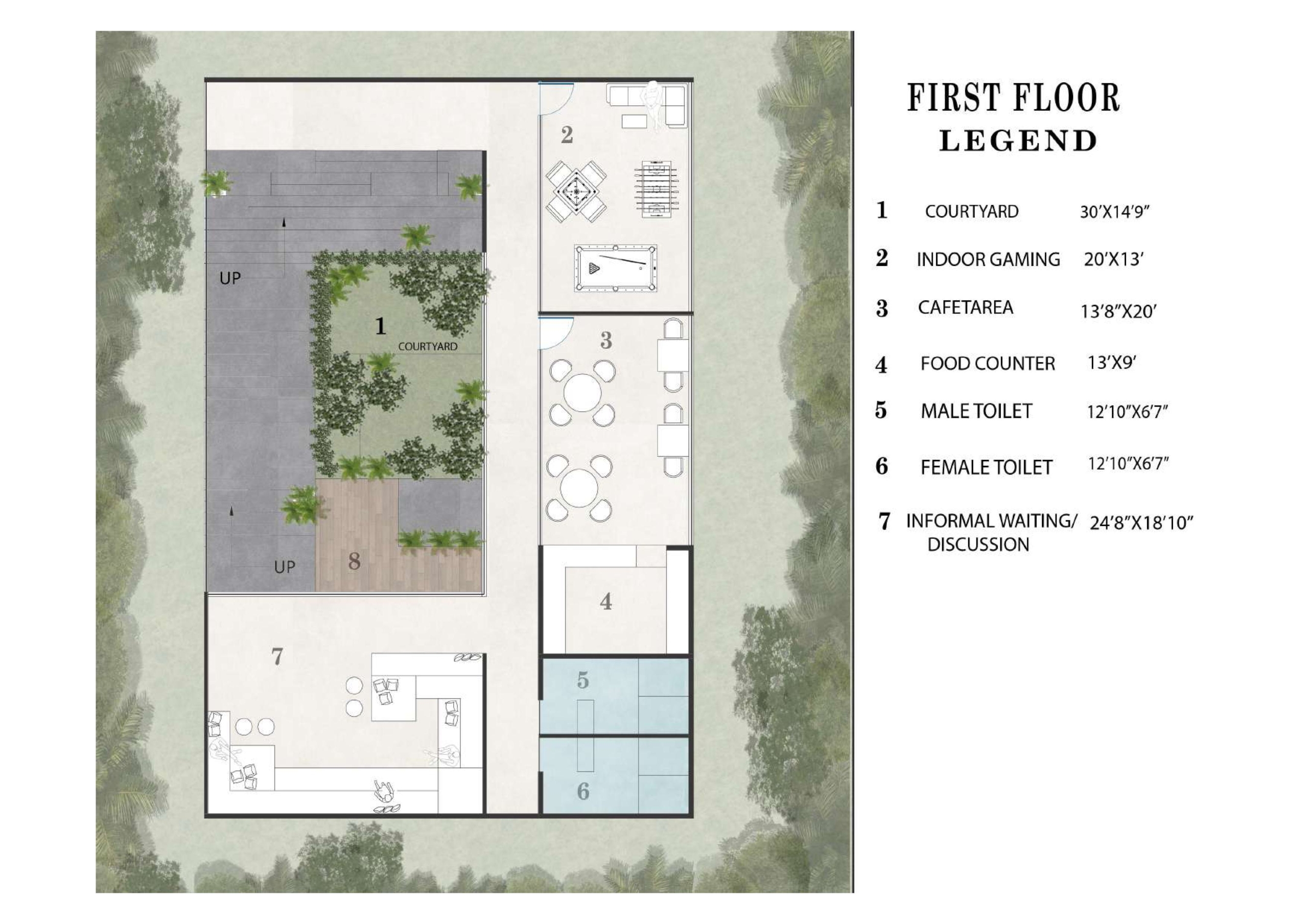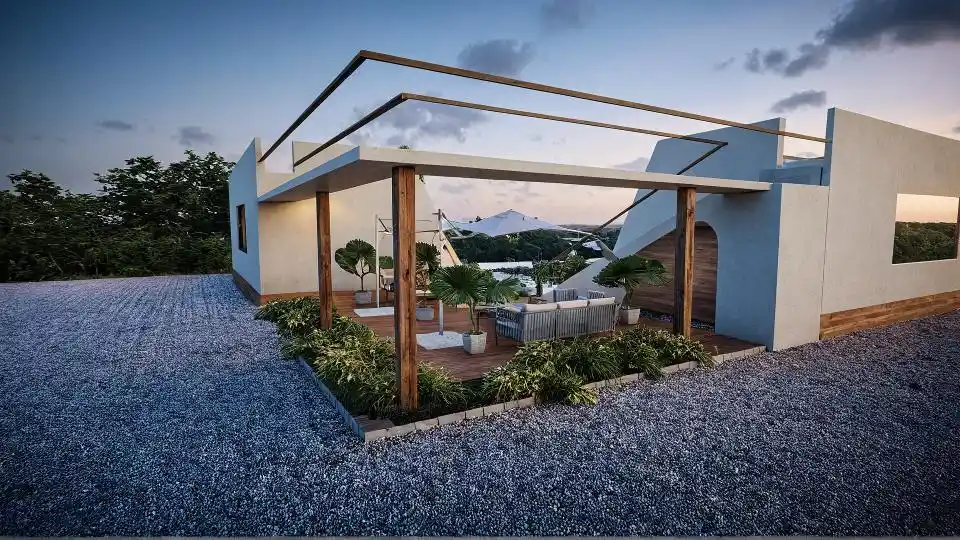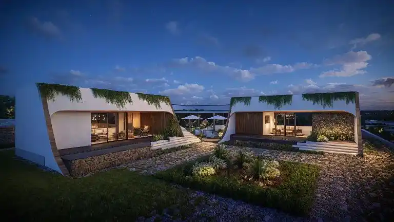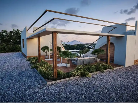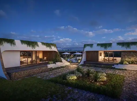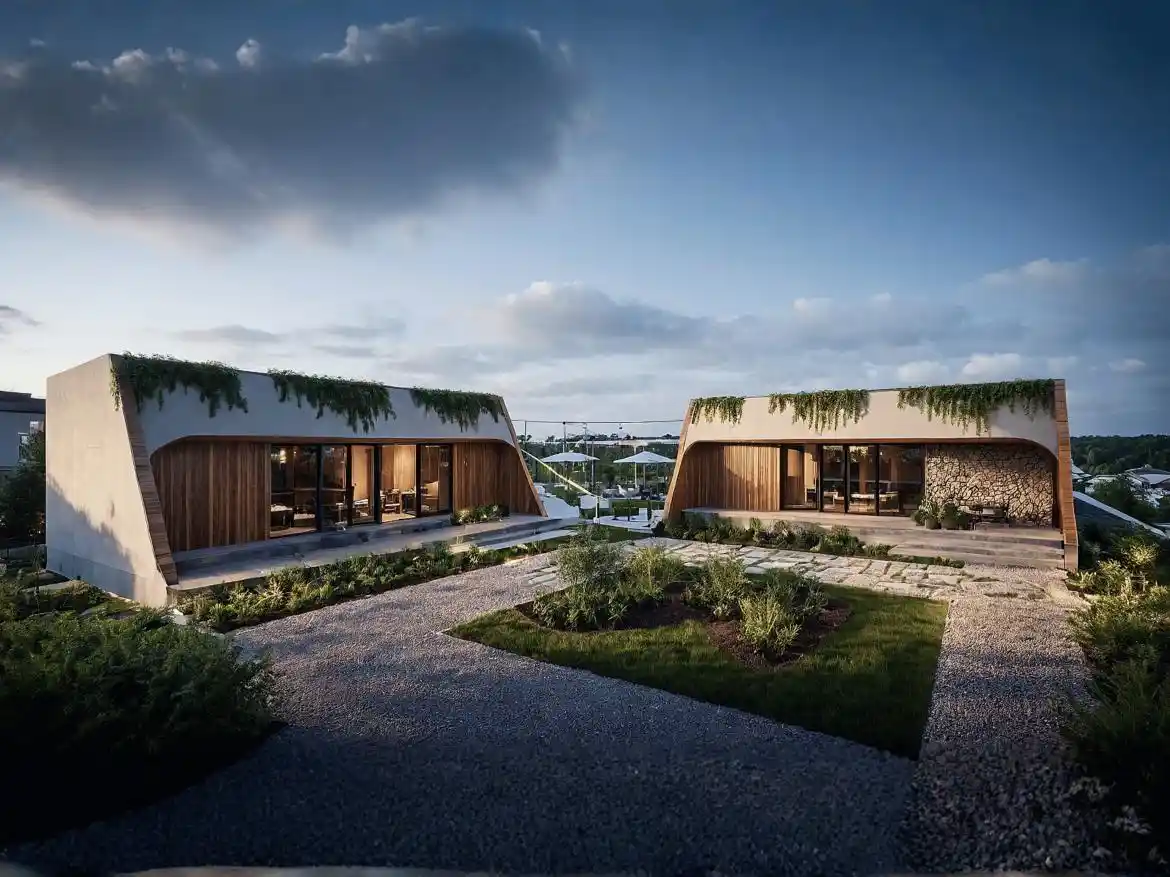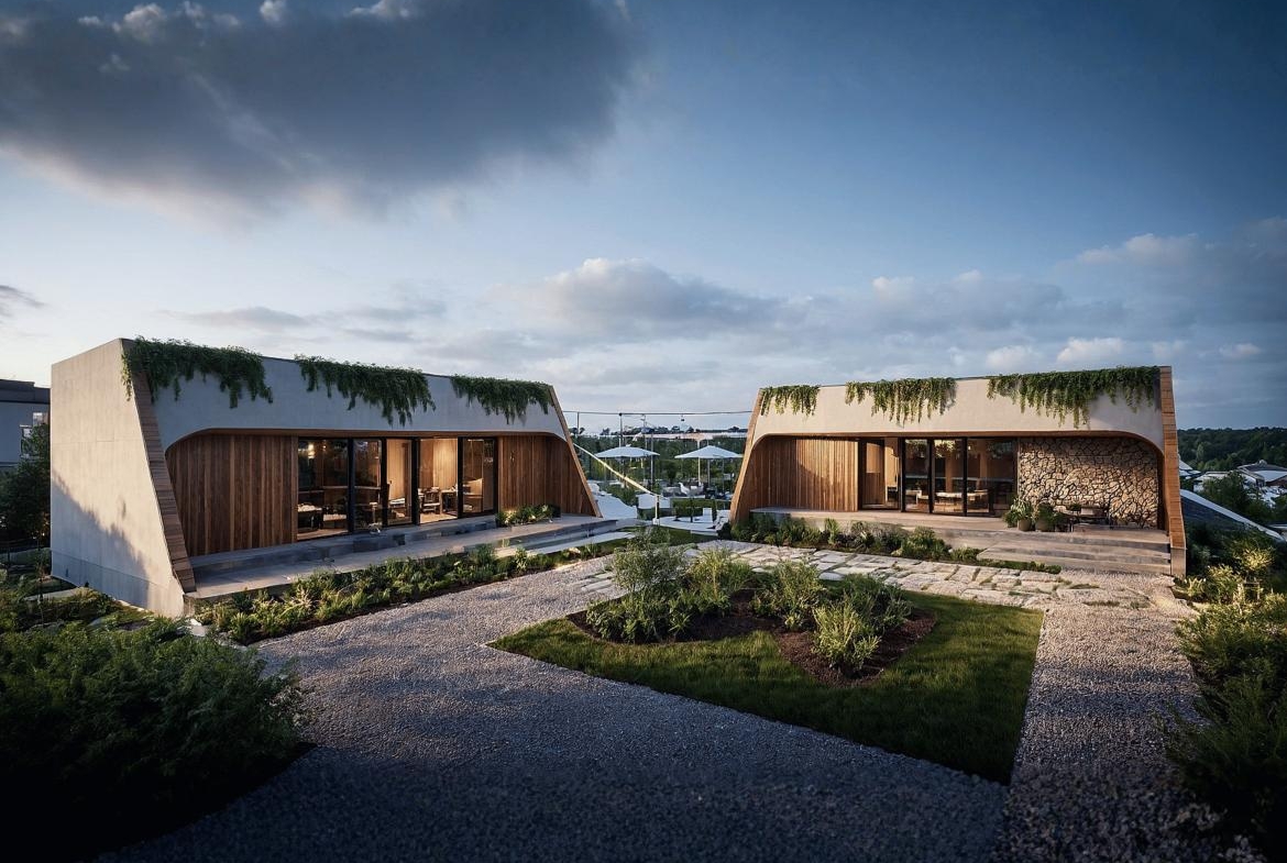 Nexus Lounge is designed as a contemporary gathering space where two sculptural structures face each other, creating a central courtyard that naturally brings people together. The architecture combines soft modern forms with warm wooden textures, natural stone, and subtle greenery along the roofline. Large glass openings blur the boundary between indoors and outdoors, allowing light, views, and landscape to flow seamlessly through the space, creating a relaxed and refined social environment.